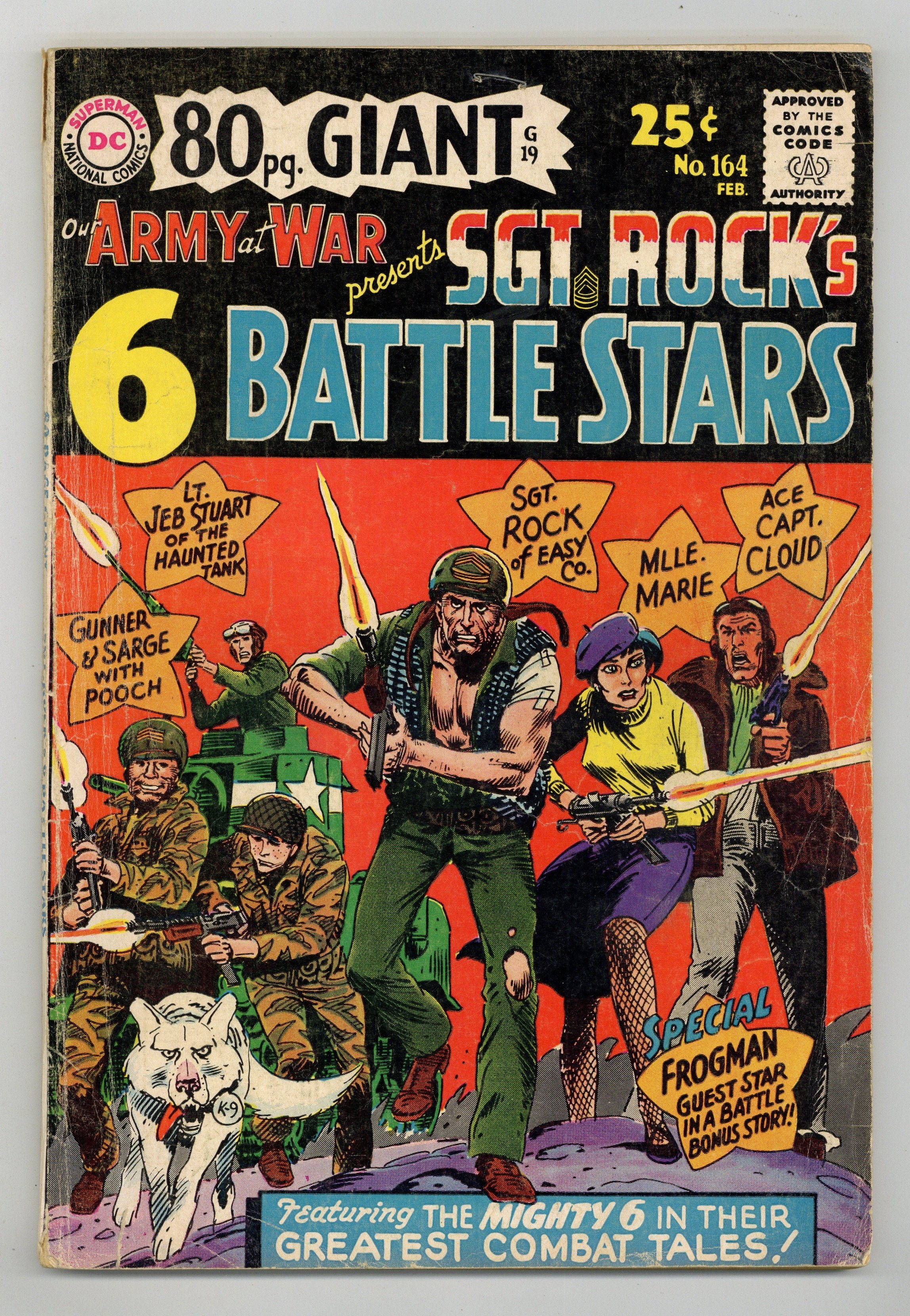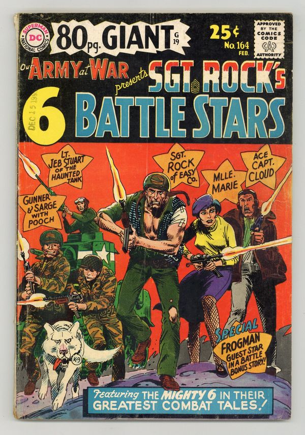 DC Giant G-19. 80 pages. Reprints: Sgt. Rock in "No Exit For Easy" (art by Joe Kubert), the Haunted Tank in "The Tank and the Turtle" (art by Russ Heath), Johnny Cloud in "Top Gun-Ace" (art by Irv Novick), and Gunner and Sarge in "My Pal, the Pooch" (art by Jerry Grandenetti). Also "Call for a Frogman" (art by Kubert) and "Medal for Marie" (art by Mort Drucker). New Kubert cover. 84 Pages, Full Color. Cover price $0.25.