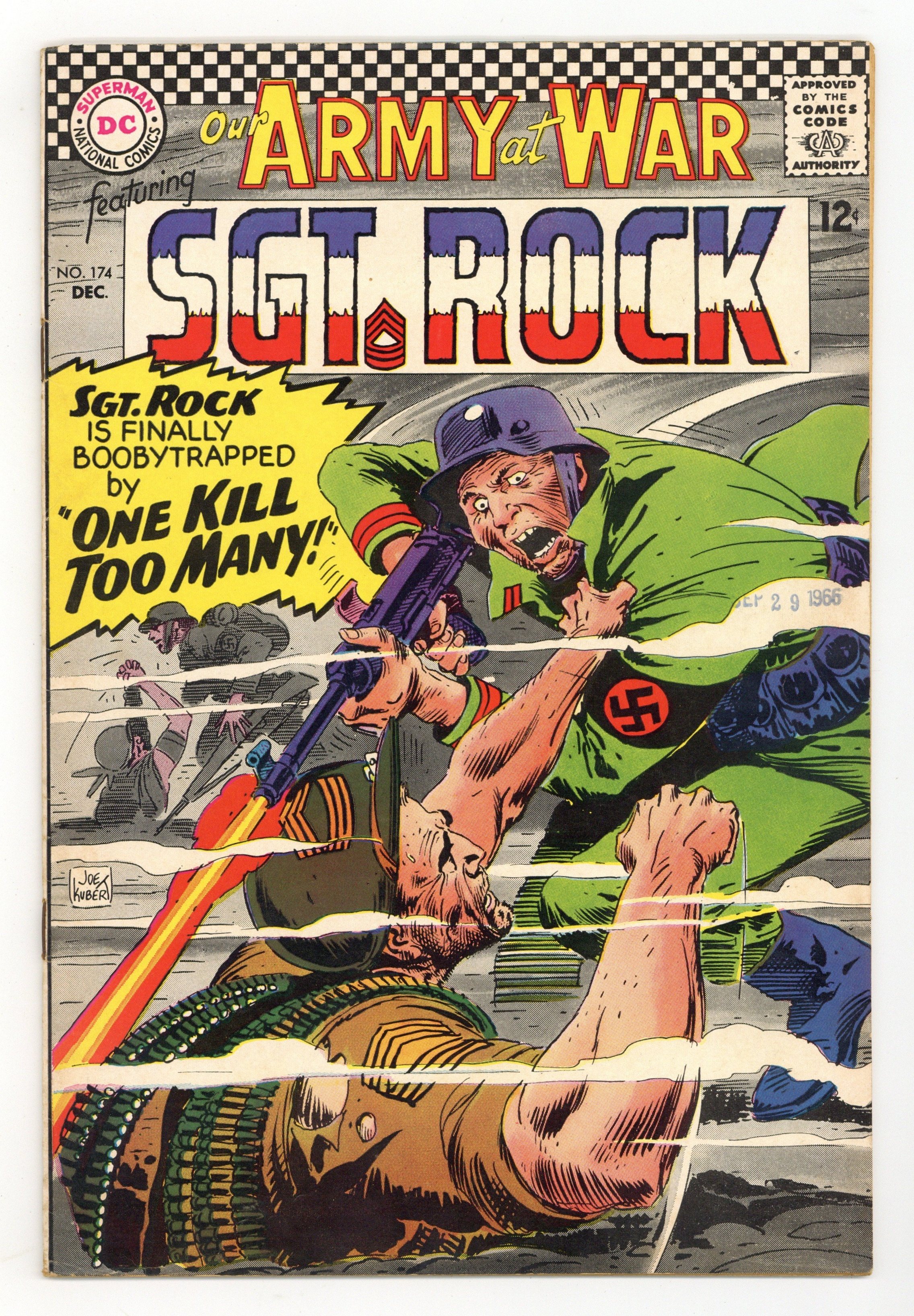 Cover art by Joe Kubert. One Kill Too Many! starring Sgt. Rock, script by Robert Kanigher, art by Joe Kubert. Battle Buzzards!, script by Bill Finger, pencils by Bob Forgione, inks by Jack Abel. Cap's Hobby Hints fact page, script and art by Henry Boltinoff. 36 Pages, Full Color. Cover price $0.12.
