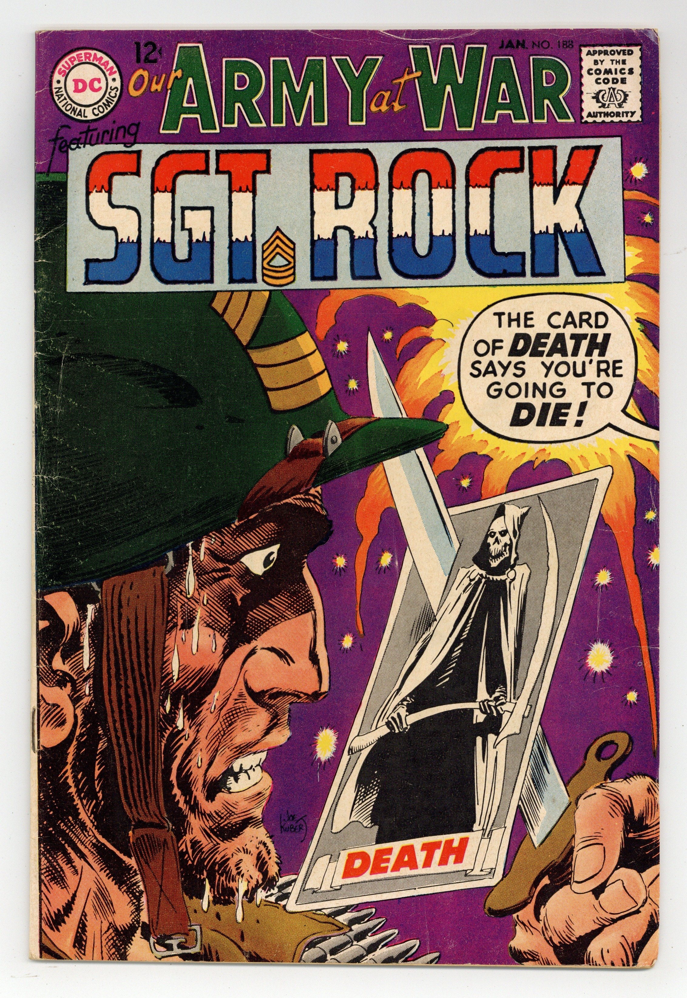 $12.50Cover art by Joe Kubert. Death Comes For Easy starring Sgt. Rock, script by Bob Kanigher, art by Joe Kubert. Live Wire For Easy, script by Robert Kanigher, pencils by Ross Andru, inks by Mike Esposito. Khaki-Yaks humor page by Henry Boltinoff. Cap's Hobby Hints by Henry Boltinoff. Letter column art by Kubert. 36 Pages, Full Color. Cover price $0.12.