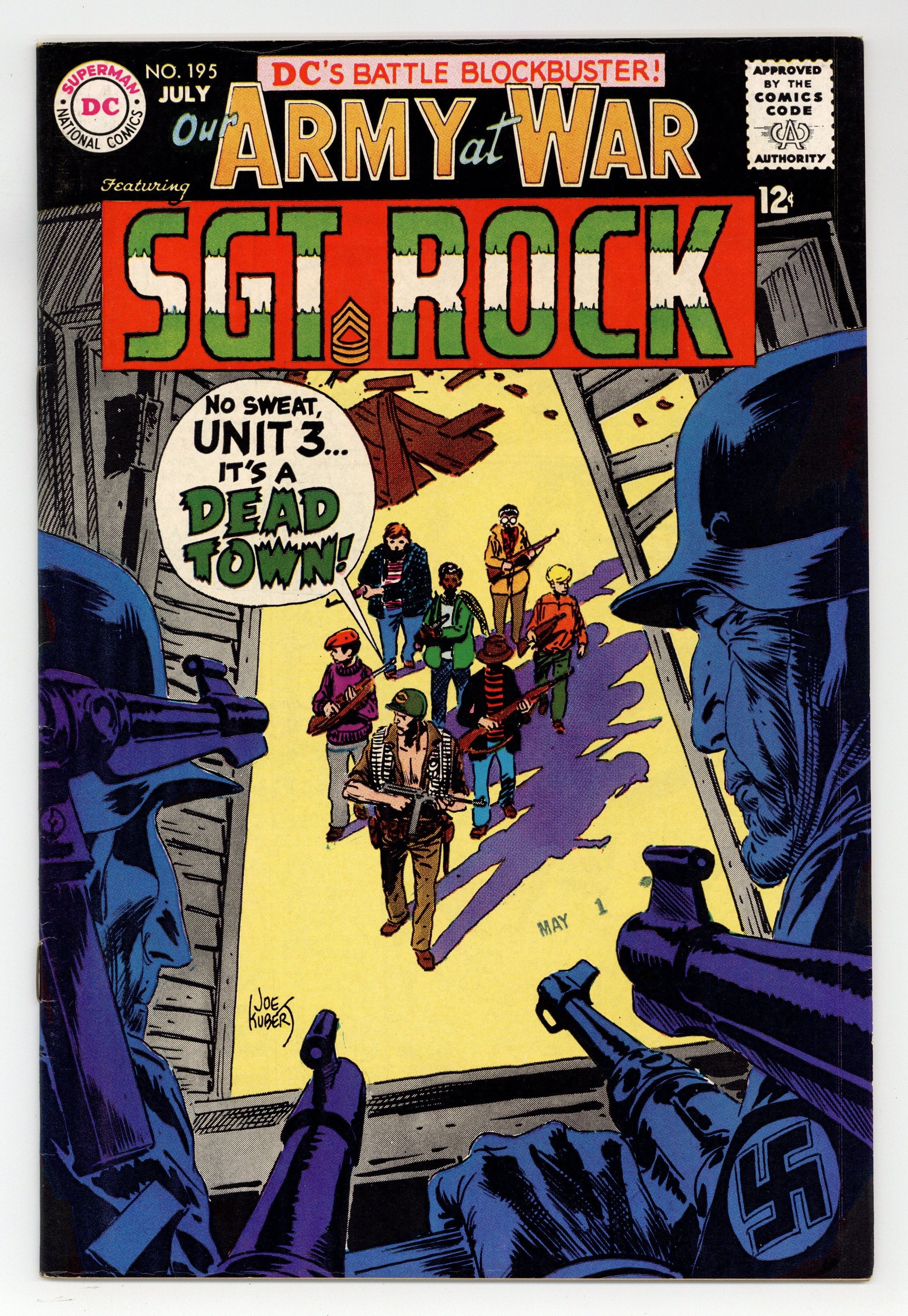 Cover art by Joe Kubert. Dead Town starring Sgt Rock and the team of the Kid Guerillas of Unit 3, script by Bob Kanigher, art by Joe Kubert. A Promise to Joe, art by Irv Novick. Nobody's Friend, script by Howard Liss, art by Frank Springer. 36 Pages, Full Color. Cover price $0.12.