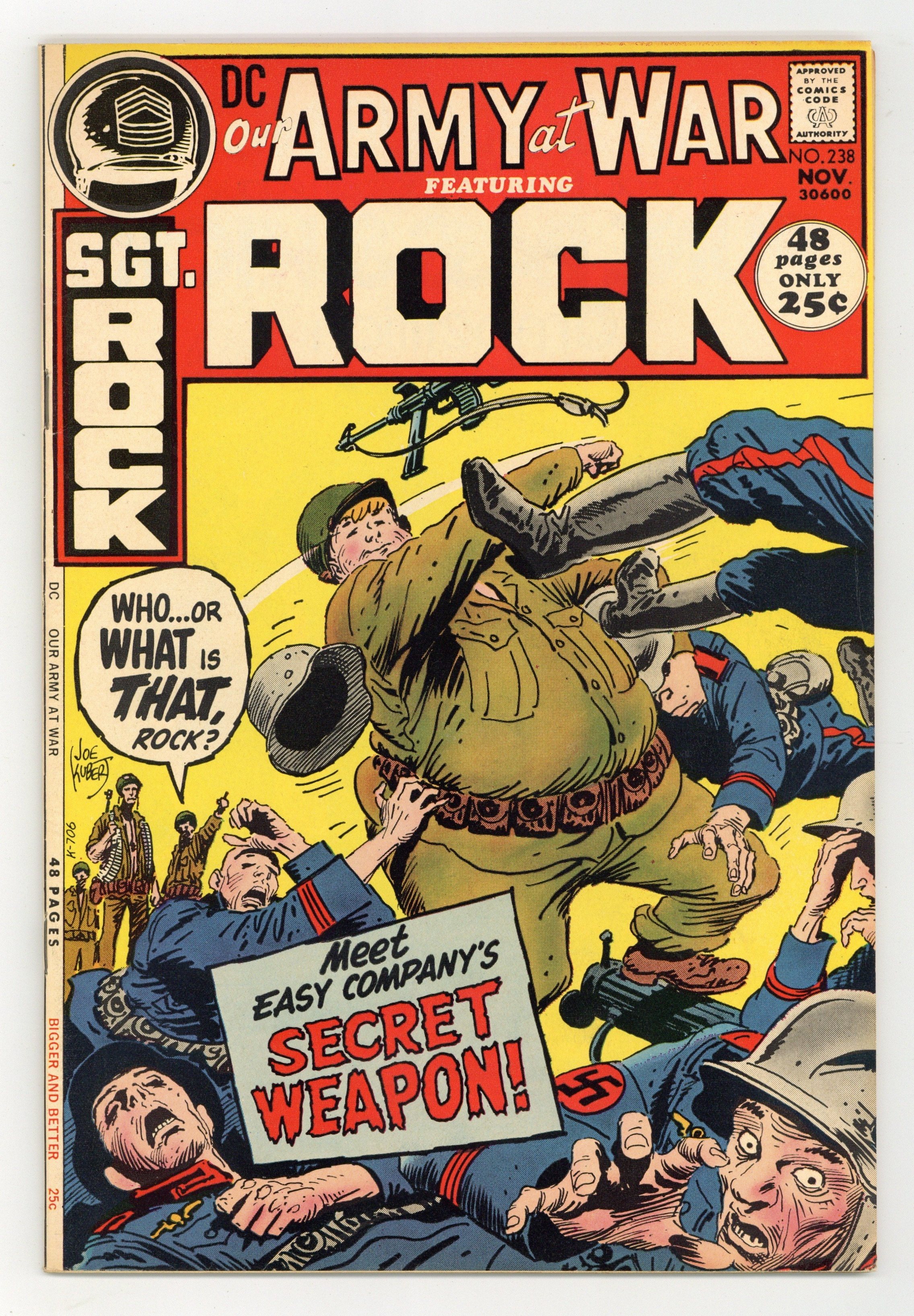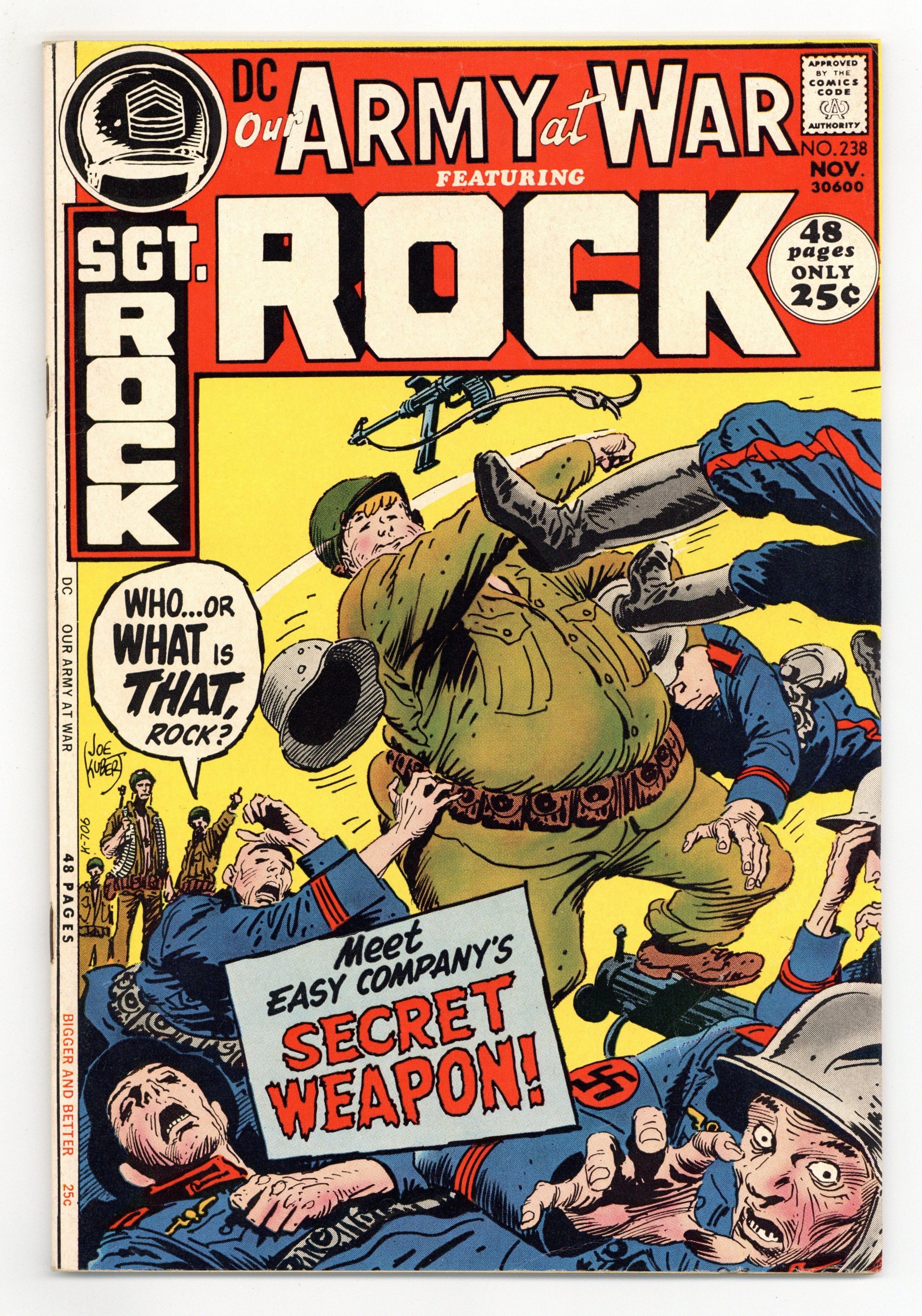 $20.50Cover art by Joe Kubert. I Kid You Not starring Sgt. Rock, script by Bob Kanigher, art by Joe Kubert. X DD479 featuring U.S.S. Stevens, script and art by Sam Glanzman. D.C. Sweeps A.C.B.A. Awards, pencils by Neal Adams, featuring Denny O'Neil, Neal Adams, Dick Giordano, Bob Oksner, Henry Scarpelli, and Jack Adler. Big War...Little War, script by Bob Kanigher, pencils by Ross Andru, inks by Mike Esposito. The Battle of the Sunken Village starring Mlle. Marie, script by Bob Haney, art by Irv Novick. 52 Pages, Full Color. Cover price $0.25.
