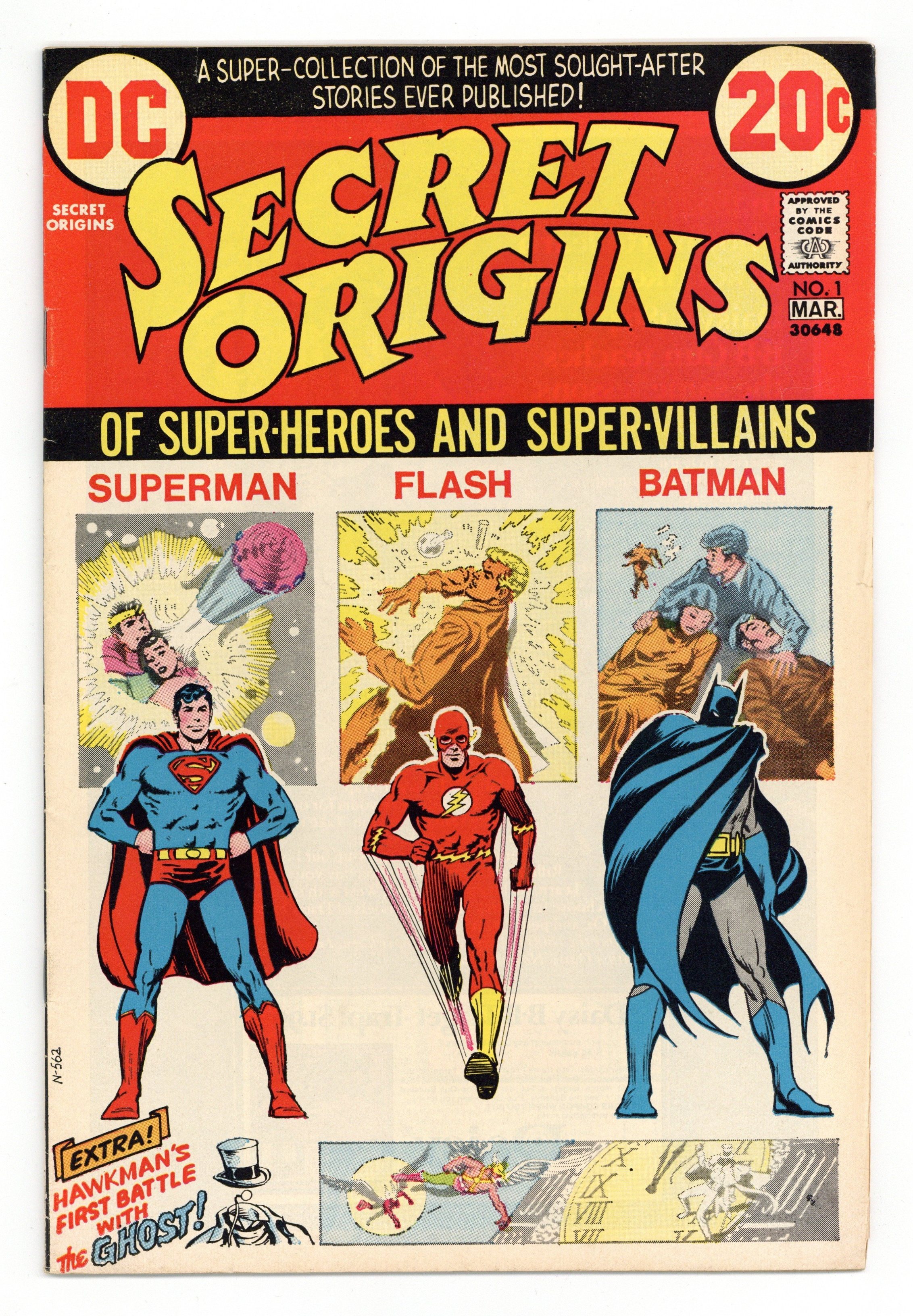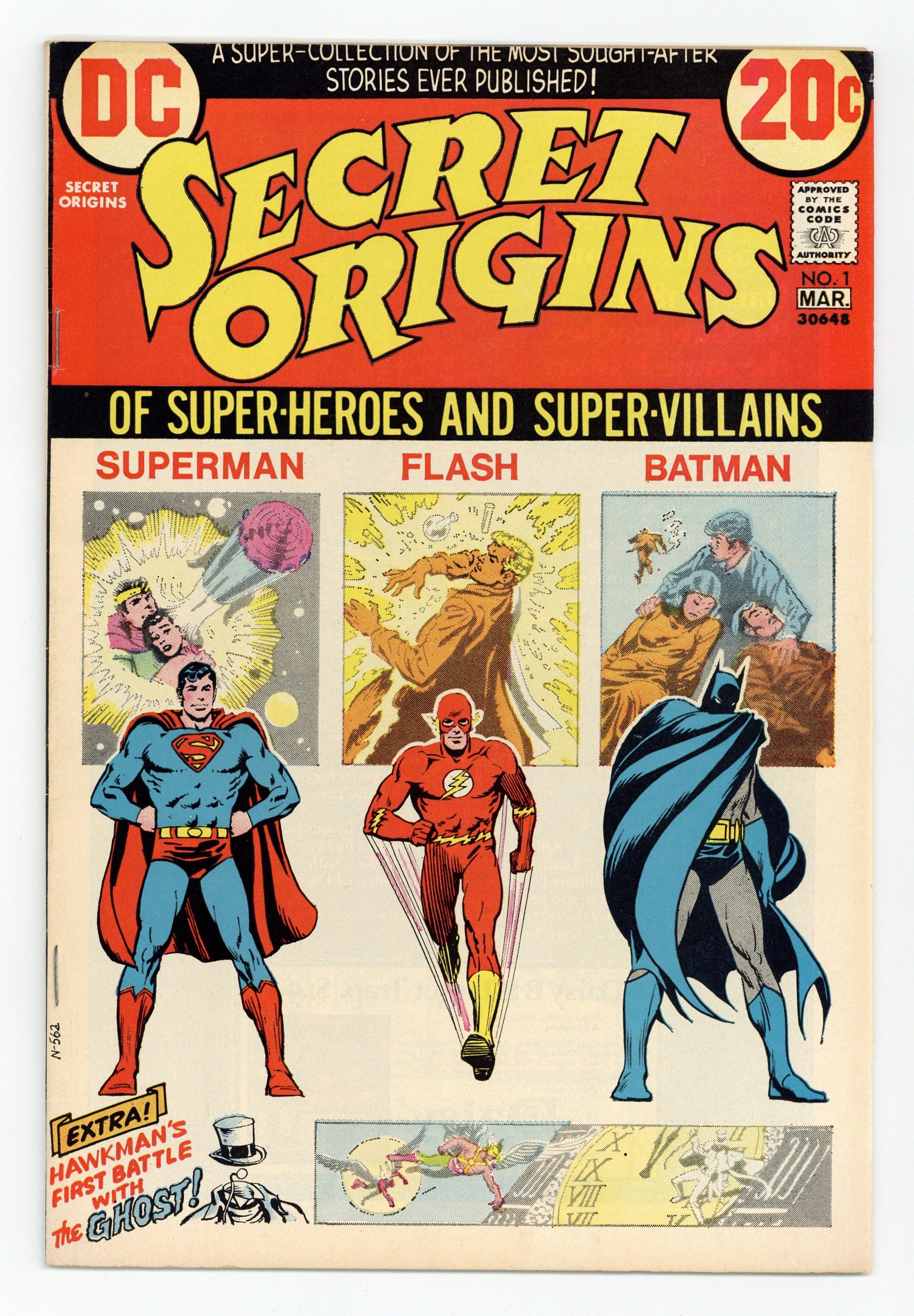 Cover by Nick Cardy. "The Secret Origin of Superman," script by Jerry Siegel, pencils by Joe Shuster, inks by Joe Shuster; one page reprinted from Action Comics #1. "The Secret Origin of Batman," script by Bill Finger, art by Bob Kane; two pages reprinted from Detective Comics #33. "The Ghost," script by Bob Kanigher, art by Joe Kubert; A series of baffling robberies bring the Feathered Furies into direct confrontation with their newest adversary: the Ghost; Hawkman's first battle with The Ghost, reprinted from Flash Comics 88. One-page text feature about the creation of this title by E. Nelson Bridwell. "Mystery of the Human Thunderbolt!," script by Bob Kanigher, pencils by Carmine Infantino, inks by Joe Kubert; By a freak accident involving lab chemicals and lightning, Barry Allen becomes the fastest man alive and originates a costume based on the comic adventures of the Flash from the 1940's; he battles The Turtle Man; reprinted from Showcase #4. 36 pgs., full color. $0.20. Cover price $0.20.