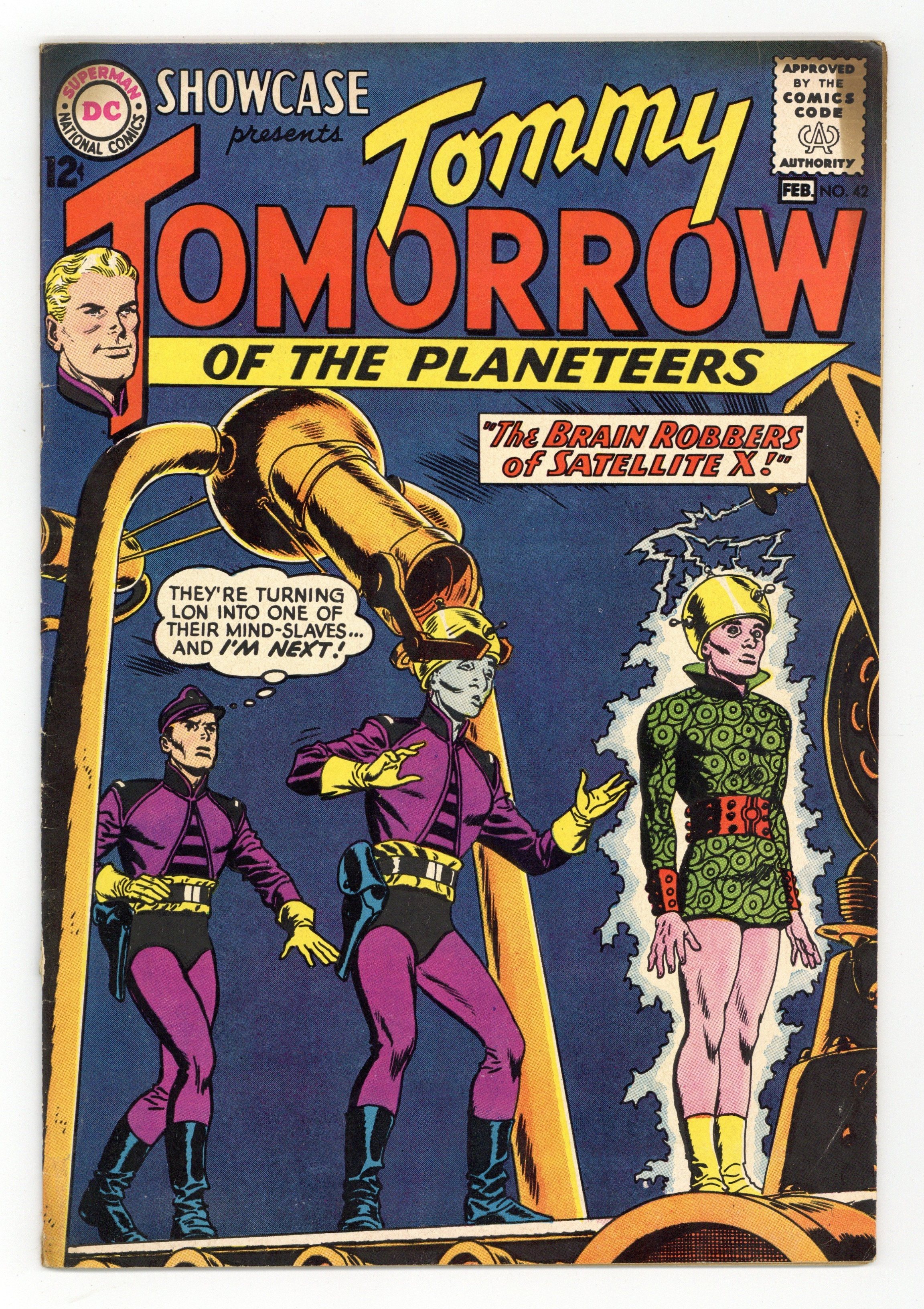 Cover art by Lee Elias. 2nd Tommy Tomorrow. Chapter 1: The Brain Robbers of Satellite X, script by Arnold Drake, art by Lee Elias; Lt. Tommy Tomorrow and Lt. Lon Vurian arrive at the Planeteer Headquarters on Venus and receive their first assignments, convoy duty with the fermite skows running between Pluto and the inner planets; While in space, they stumble upon the activities of alien criminals. Doctor Rocket humor page by Henry Boltinoff. Chapter 2: Masters of the Asteroid Brain, script by Arnold Drake, art by Lee Elias; Aliens have kidnapped more than 50 of the solar system's most brilliant scientists and have used a mind-control ray to force them to reveal their secrets; Lt. Tommy Tomorrow fakes falling under their control, then frees the scientists and chases away the criminals. All Aboard for - Space! article. Planets of Wonder article by Julius Schwartz, pencils by Morris Waldinger, inks by Tommy Nicolosi. Chapter 3: The Doom Factory, script by Arnold Drake, pencils by Lee Elias (story pages 14-16, 25) and Don Heck (story pages 17-24), inks by Lee Elias (story pages 14-16, 25) and Don Heck (story pages 17-24). 36 Pages, Full Color. Cover price $0.12.