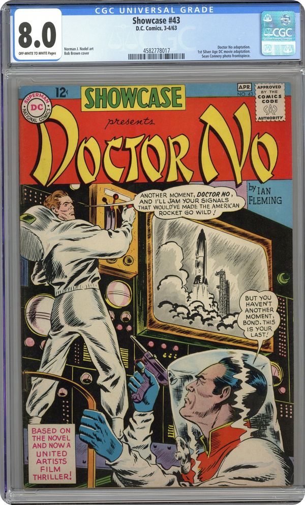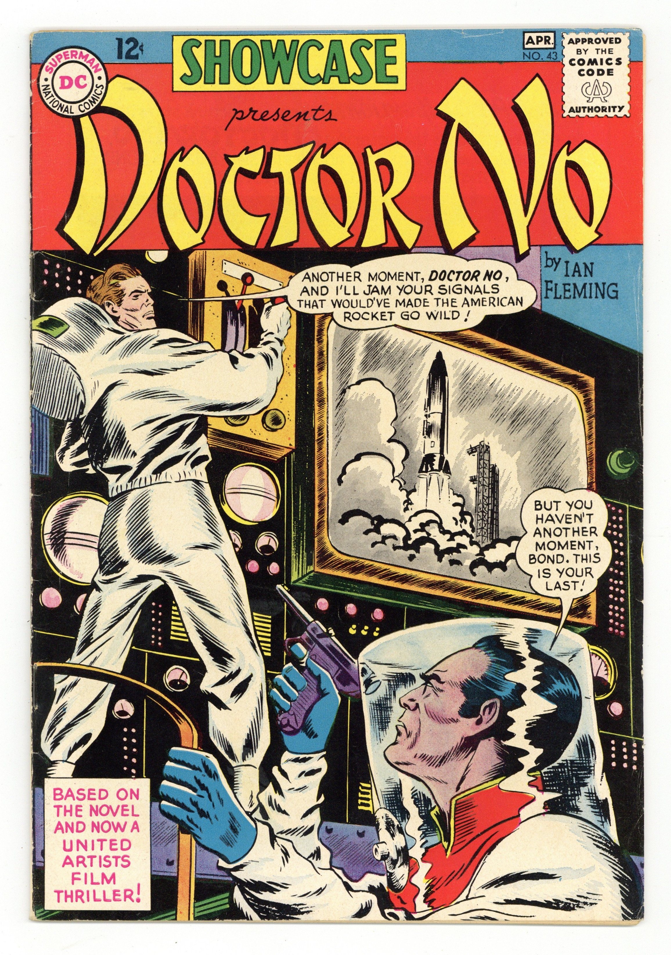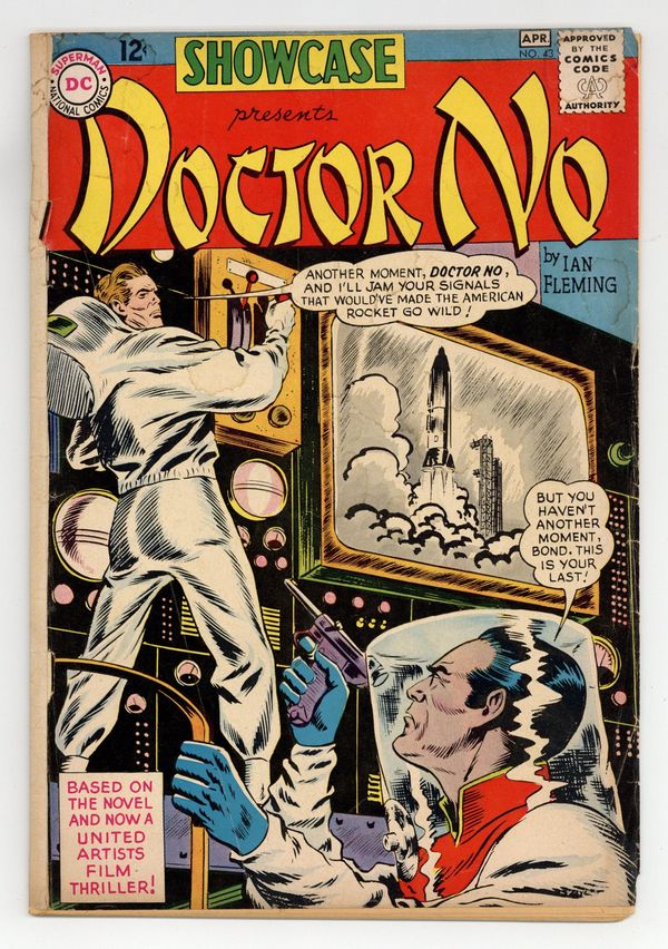 1st Silver Age movie adaptation. Cover art by Bob Brown. Five B&W photos of James Bond and Doctor No. Doctor No, art by Norman J. Nodel; In Jamaica, John Strangways is grabbed by three "blind" beggars; He was checking on "massive interference" with Cape Canaveral rocket launches; Bond goes to Jamaica and zeroes in on Crab Key; He survives fist fights, a tarantula in his bed, gunshots, and being run off the road; Finally, with the help of Honey Ryder and Quarrel, a fisherman, he reaches the island; based on the 1962 feature film. The Man Behind the Typewriter; Background on James Bond and his creator, Ian Fleming. 36 Pages, Full Color. Cover price $0.12.