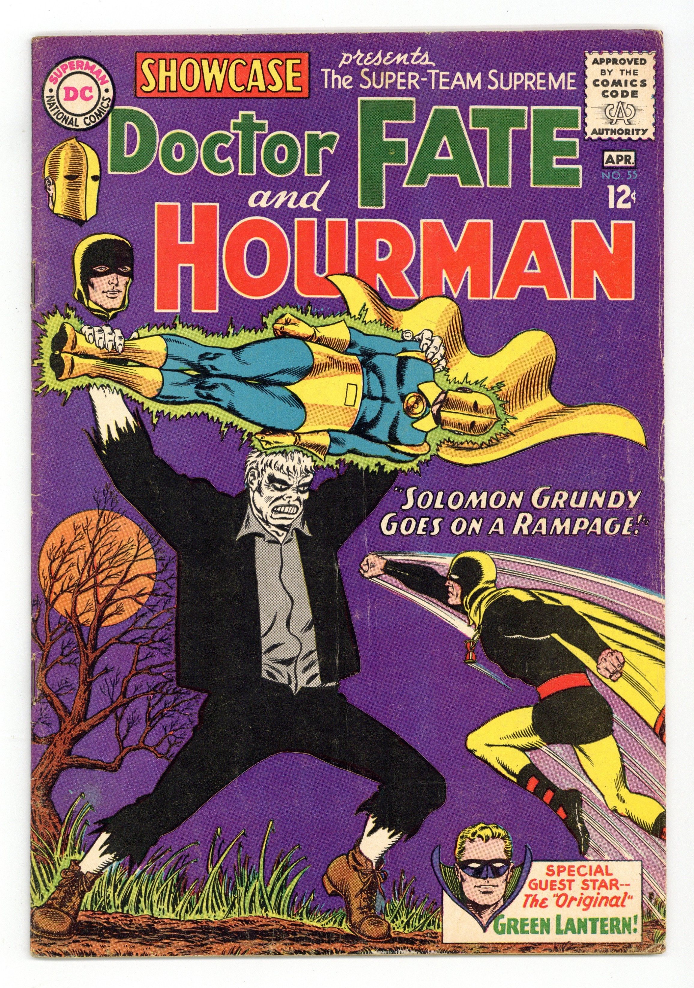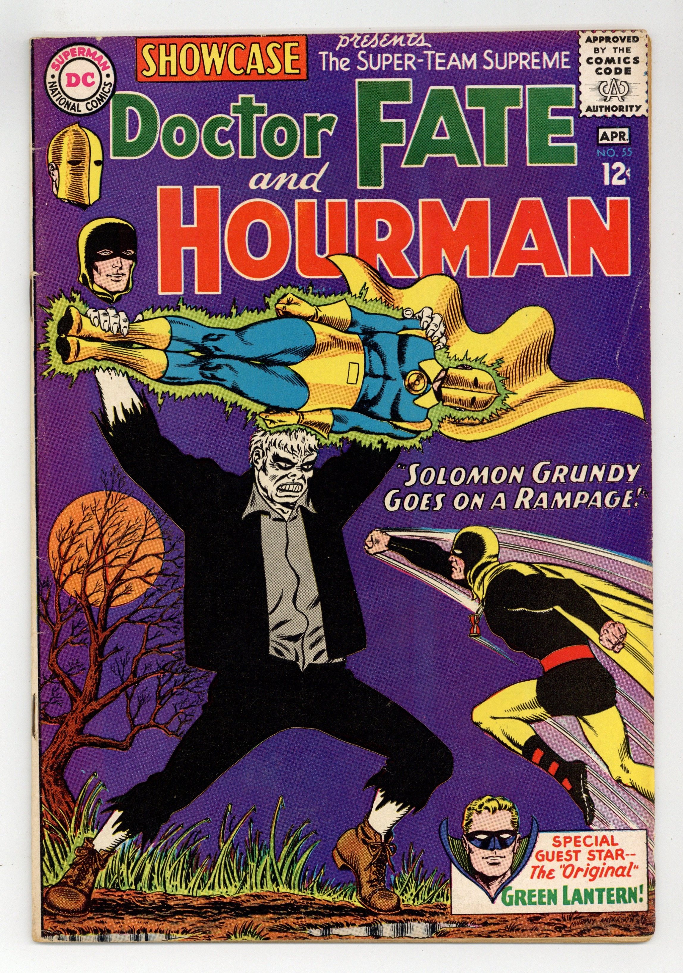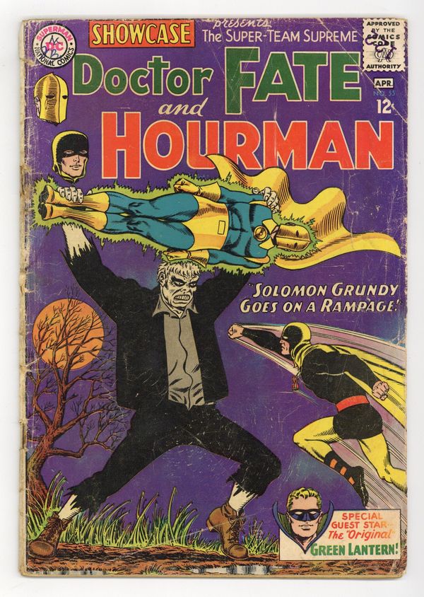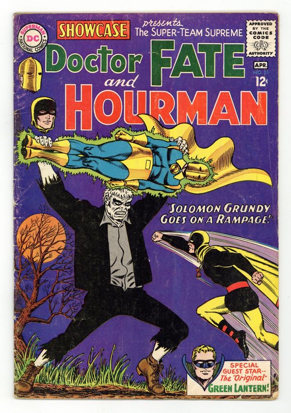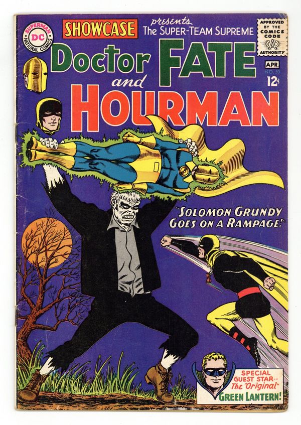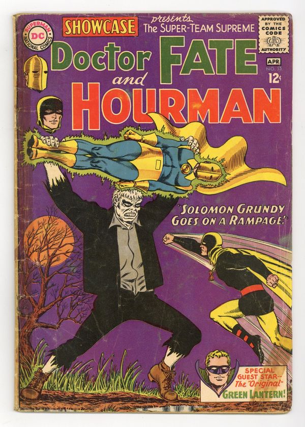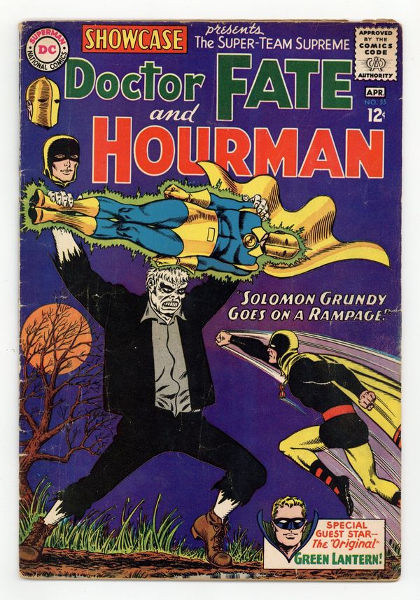 Starts Dec 15 Cover by Murphy Anderson. 1st solo Golden Age Green Lantern in Silver Age (pre-dates Green Lantern 40), Doctor Fate, and Hourman star in "Solomon Grundy Goes on a Rampage!", script by Gardner Fox, art by Murphy Anderson; When Solomon Grundy last fought Green Lantern Alan Scott, Green Lantern encased Solomon Grundy in an emerald sphere prison floating above Earth; Years later, the sphere has now crash landed back on Earth, and Solomon Grundy has emerged to get his revenge on Green Lantern; Solomon Grundy instinctually heads back to his home of Slaughter Swamp, which at this point is bordering the Tyler Chemical Company plant; At the Tower of Fate, Kent Nelson is warned that there is trouble by his crystal ball; Seeing the source of the trouble to be Slaughter Swamp, Nelson becomes Dr. Fate; Hourman comes across Solomon Grundy in Slaughter Swamp; Hourman pops his Miraclo pill, then attacks Solomon Grundy. One-page text feature tells the origins of Dr. Fate and Hourman. 36 Pages, Full Color. Cover price $0.12.