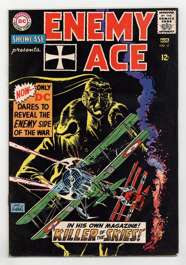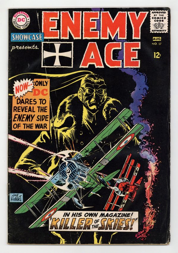 4th overall appearance of Enemy Ace. Cover art by Joe Kubert. Killer Of The Skies! starring Enemy Ace, script by Robert Kanigher, art by Joe Kubert; The Enemy Ace faces off agains The Hunter, a Canadian Ace, over No-Man's Land. 36 Pages, Full Color. Cover price $0.12.
