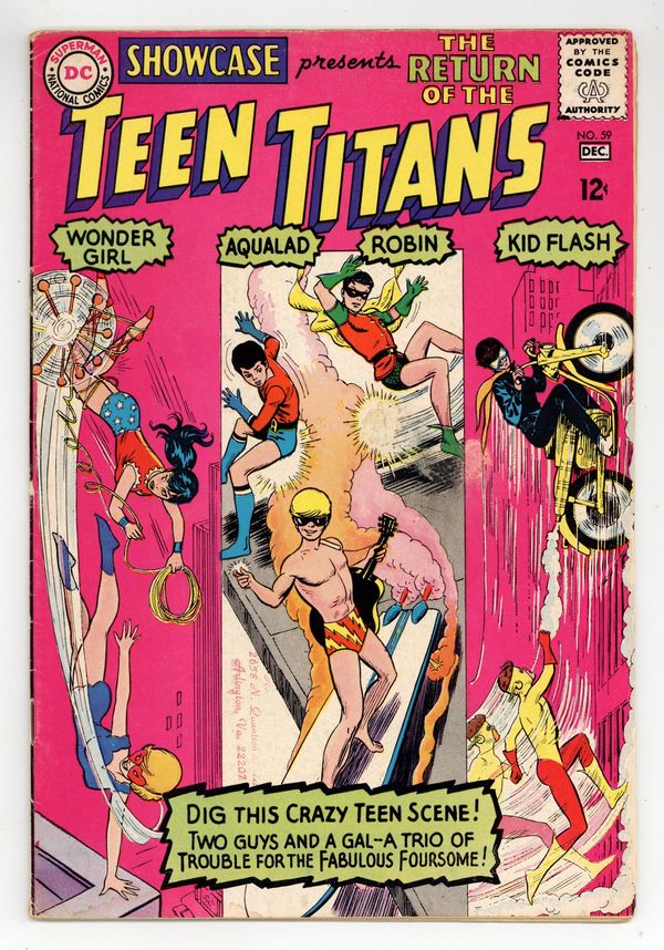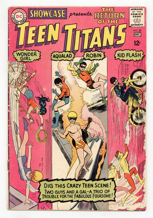 3rd appearance of the Teen Titans. Cover art by Nick Cardy. The Return of the Teen Titans, script by Bob Haney, art by Nick Cardy. The Teen Titans battle the rock 'n' roll robbers The Flips, who use a surfboard, a cheerleader's baton, and a trick motorcycle to steal from the public and confound the Titans. The series continues in Teen Titans #1 (1966). 36 Pages, Full Color. Cover price $0.12.