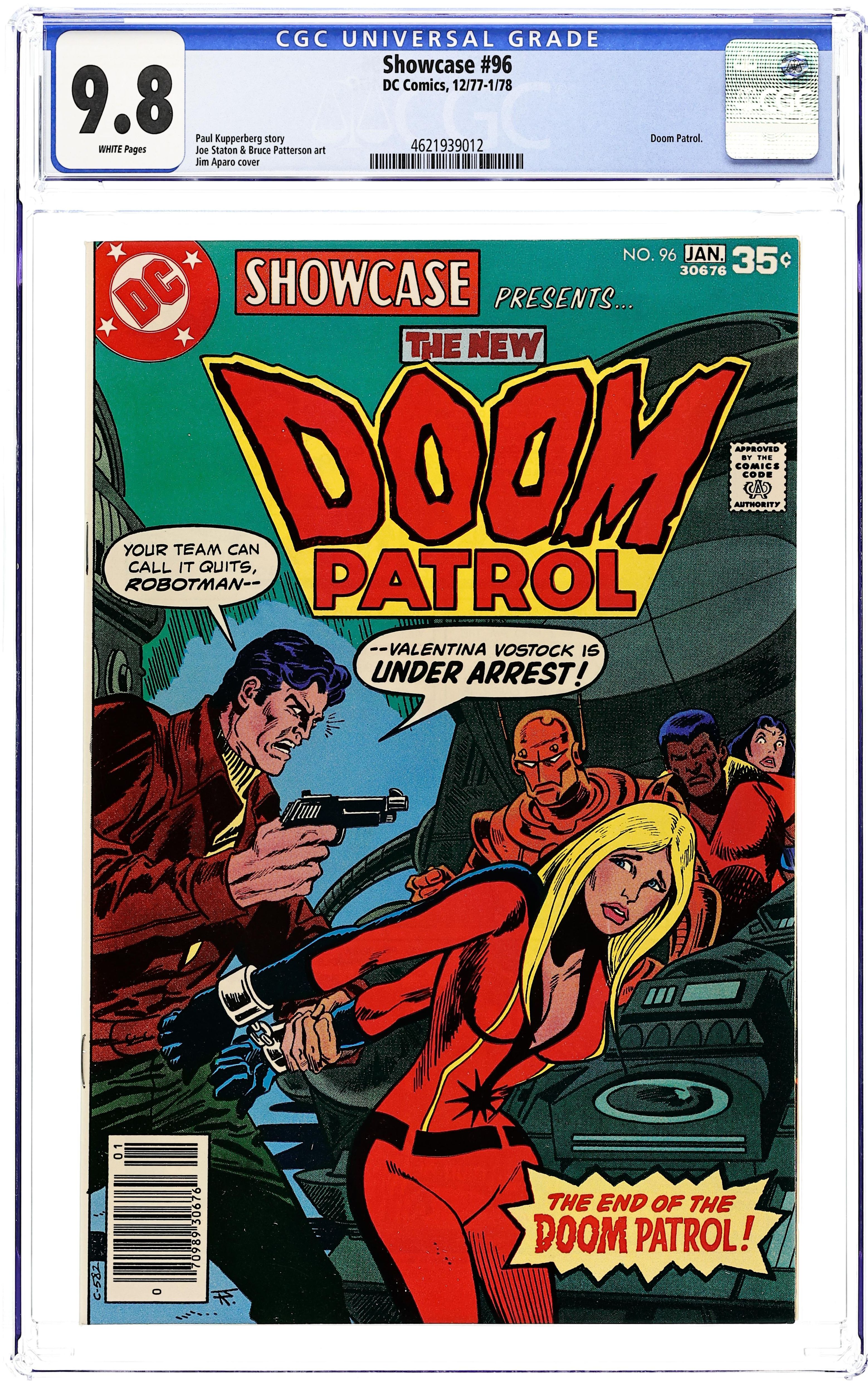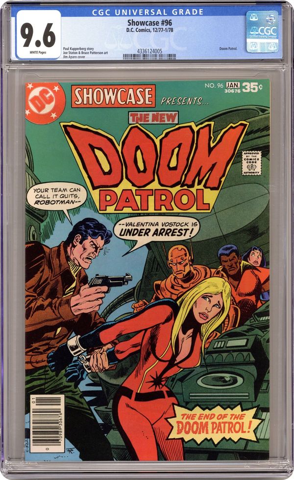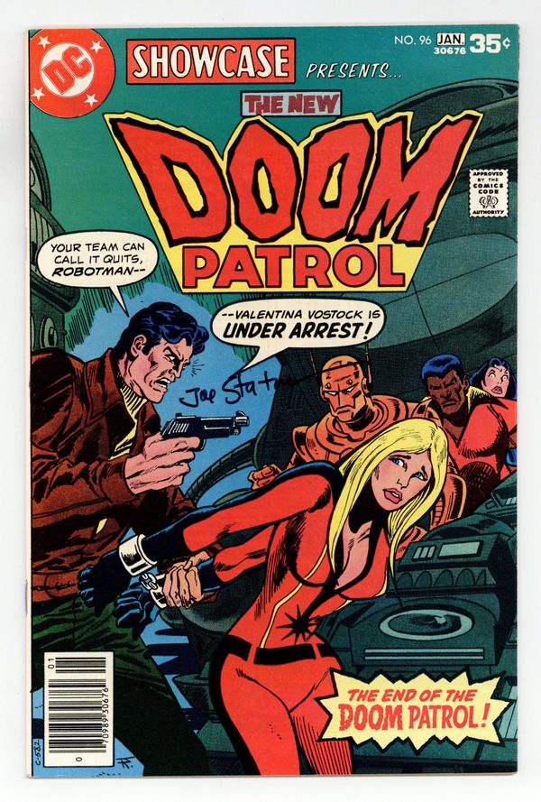 Cover by Jim Aparo. "Defection!", script by Paul Kupperberg, pencils by Joe Staton, inks by Bruce Patterson; The Doom Patrol returns home after their defeat of General Immortus to find a U.S. agent waiting for them in their headquarters; Lt. Matt Cable has been assigned by U.S. Intelligence to apprehend and arrest Russian ex-cosmonaut Lt. Col. Valentina Vostok, aka the new Negative Woman; The Doom Patrol defends their new teammate, and trap Lt. Cable in a locker; Robotman grills Negative Woman on her past, and she leaves; Her exit, though, is interrupted by the Cossack, a Russian agent assigned to bring her in. 36 Pages, Full Color. Cover price $0.35.