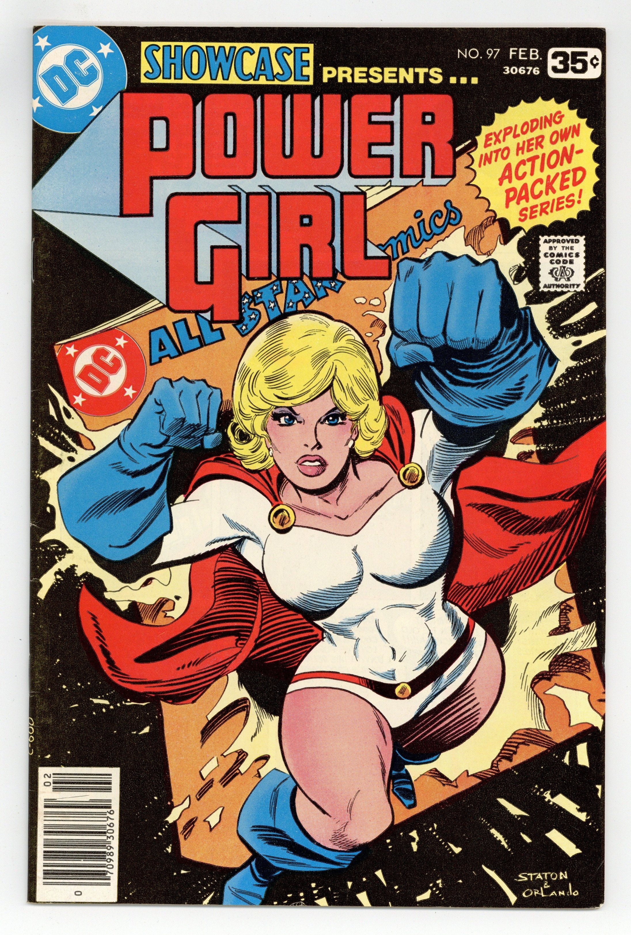 Cover pencils by Joe Staton, inks by Joe Orlando. "Power Girl," script by Paul Levitz, pencils by Joe Staton inks by Joe Orlando; Power Girl breaks through the roof of Gotham Citys Central Electronics factory, interrupting a robbery in progress; The thieves boss is looking for the micro-transformers produced by Central, and claims that even Power Girl cant stop them; Power Girl goes about proving them wrong, by taking out three of the four high-tech thieves; A ricocheting bullet delays Power Girl from apprehending the fourth thief, who flees the scene; The thief uses a high-tech escape vehicle, and takes a detour through the Gotham City Rail Line; This barely slows Power Girl down, who catches up to the thief, and disarms his explosive suicide jacket; Power Girl relaxes outside the city, thinking back on her life; She remembers her life on Argo City, when Zor-L and Allura, her parents, put her in an escape pod to escape Argo Citys death; Her rocket sent her to Earth, to become Power Girl; After calming down from her trip down memory lane, she returns to Gotham. Batman stars in a one-page Hostess ad, "Sable Lady." 36 Pages, Full Color. Cover price $0.35.