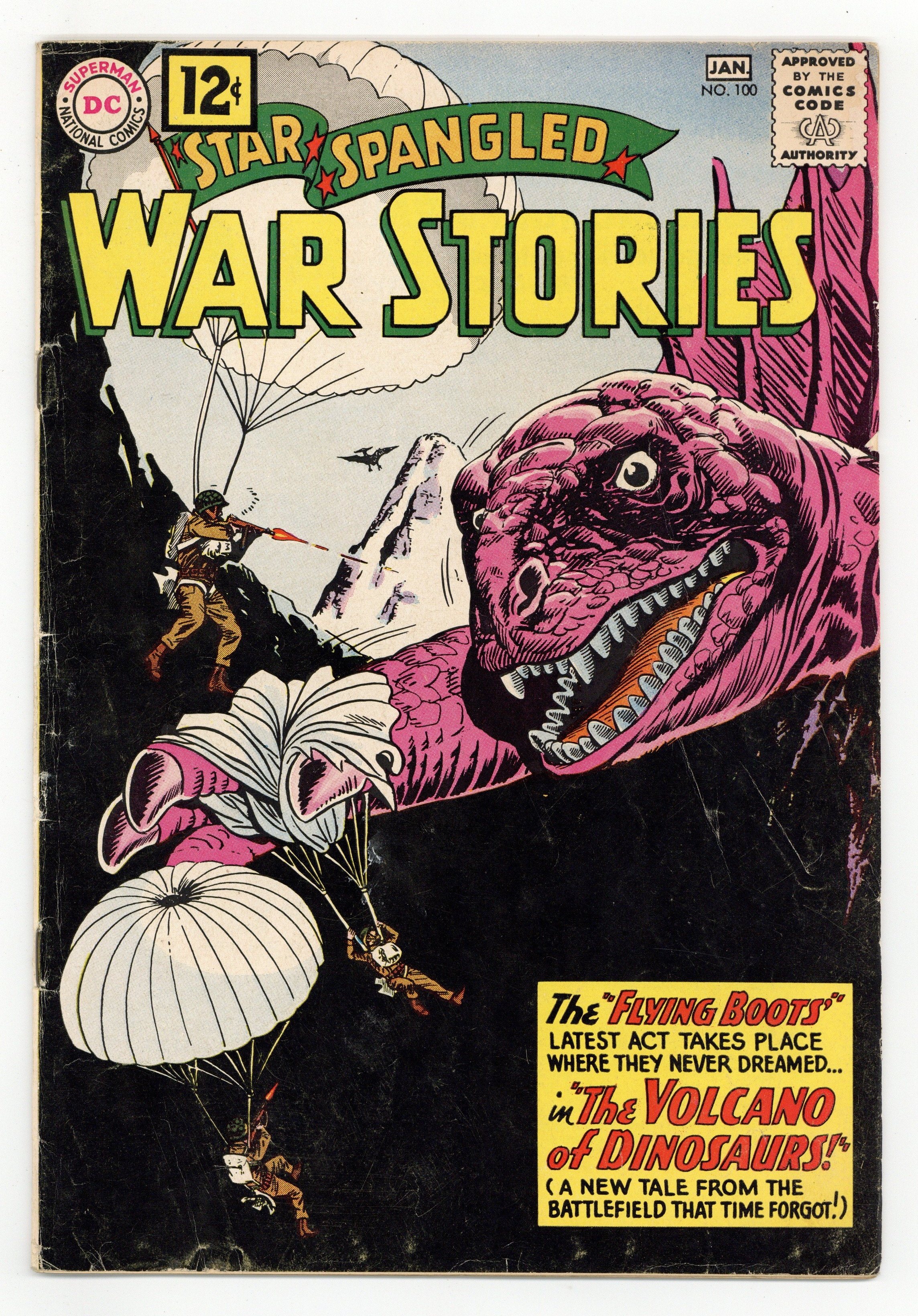 Cover pencils by Ross Andru, inks by Mike Esposito. The Volcano of Monsters featuring War That Time Forgot with the Flying Franks, script by Robert Kanigher, pencils by Ross Andru, inks by Mike Esposito. The Flippers of Doom, script by Hank Chapman, art by Jack Abel. Attack and Conquer WWII Battle Story of the 8th Air Fighter Group, script and pencils by Morris Waldinger, inks by Tom Nicolisi. Stragglers Never Come Back, script by Hank Chapman, art by Jack Abel. 36 Pages, Full Color. Cover price $0.12.