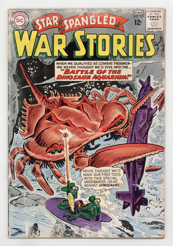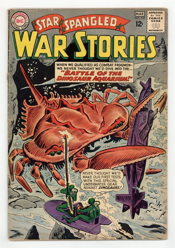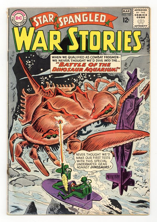 Cover pencils by Ross Andru, inks by Mike Esposito. Battle of the Dinosaur Aquarium featuring The War That Time Forgot, script by Robert Kanigher, pencils by Ross Andru, inks by Mike Esposito. Dynamite Pencil Pusher, script by Bob Haney, art by Jack Abel. The Fort Had Two Skippers, script by Bob Haney, art by Jack Abel. Unity is Strength, script and pencils by Morris Waldinger, inks by Tom Nicolisi. Marine Signs of World War II half-page, script and pencils by Morris Waldinger, inks by Tom Nicolisi. 36 Pages, Full Color. Cover price $0.12.