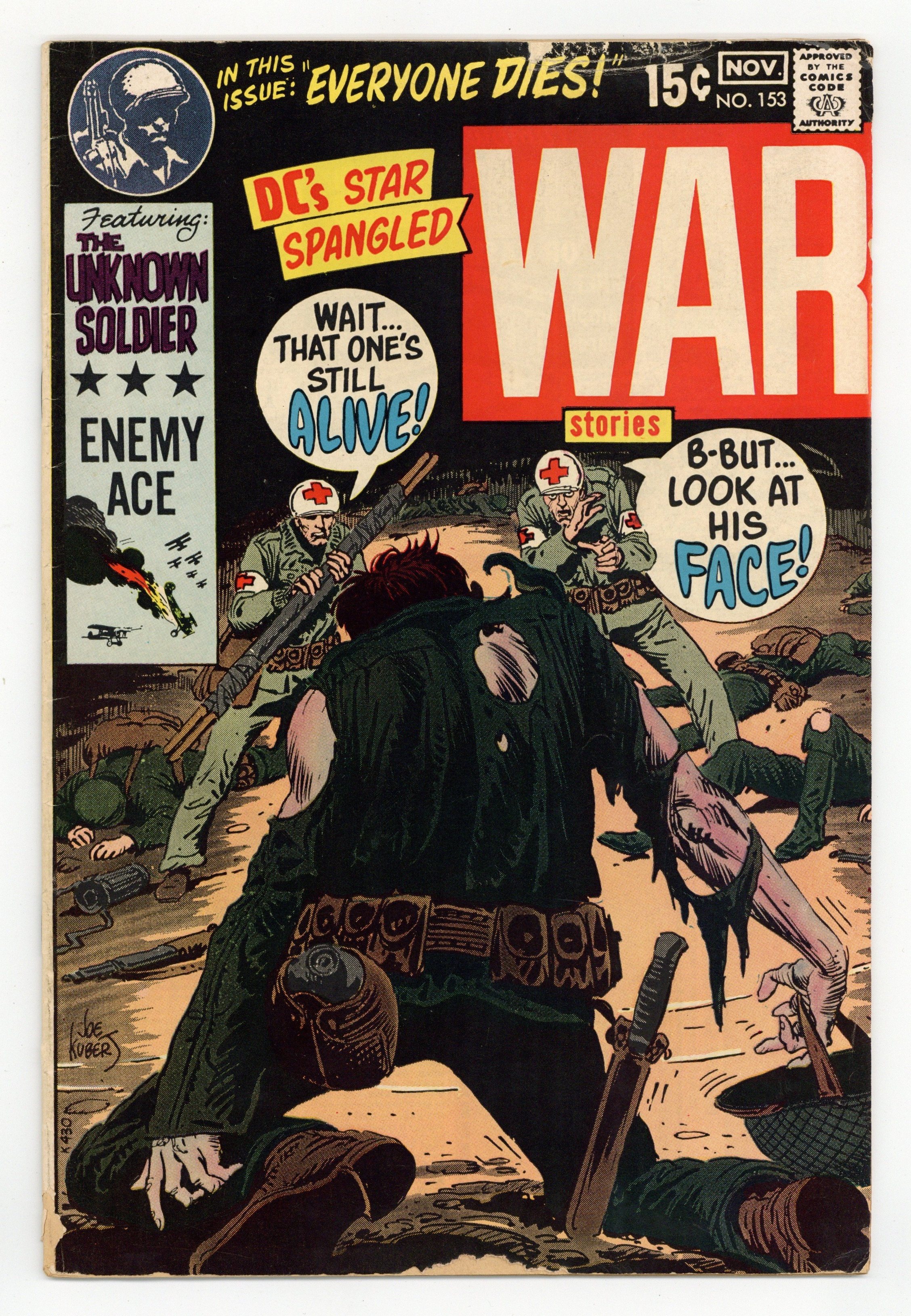 Cover art by Joe Kubert. Everybody Dies!, art by Irv Novick. Fokker Fury! starring Enemy Ace, script by Robert Kanigher, art by Joe Kubert; Hans von Hammer accidentally shoots down an British Bristol fighter who's pilot was out of ammunition; He must then face a British pilot with empty guns in his Fokker. Double Rescue featuring U.S.S. Stevens, script and art by Sam Glanzman. The Jet and.... The Prop! humor strip by John Costanza. 36 Pages, Full Color. Cover price $0.15.