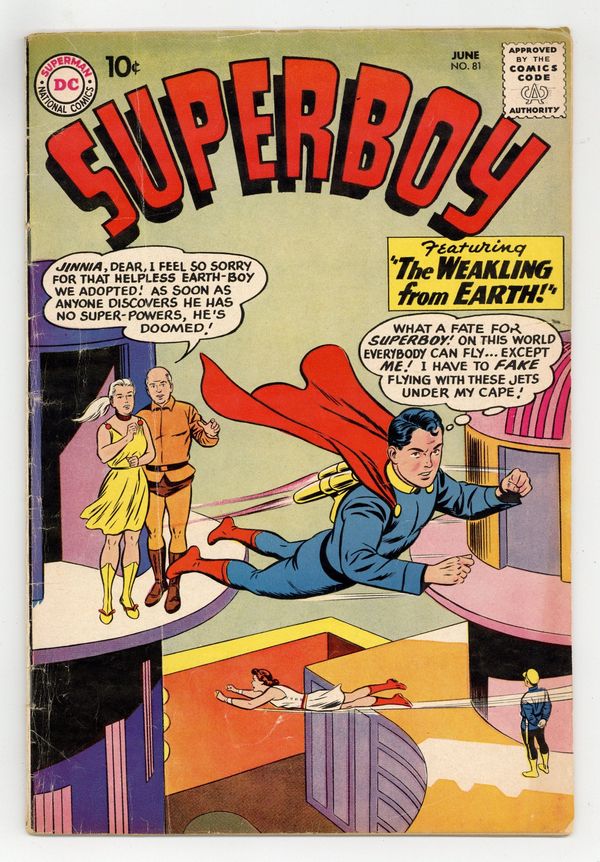 Cover pencils by Curt Swan, inks by Stan Kaye. The Weakling from Earth! Part 1, script by Otto Binder, art by George Papp; Superboy crashes on the planet Xenon where everybody has super powers but him. Be Your Own Boss! public service announcement, script by Jack Schiff, art by Bernard Baily. The Weakling from Earth! Part 2: The Revolt of the Weaklings!, script by Otto Binder, art by George Papp; Superboy is exiled from Xenon to the Weakling World. The Millionaire Pupil!, script by Jerry Siegel, art by Al Plastino. 36 Pages, Full Color. Cover price $0.10.