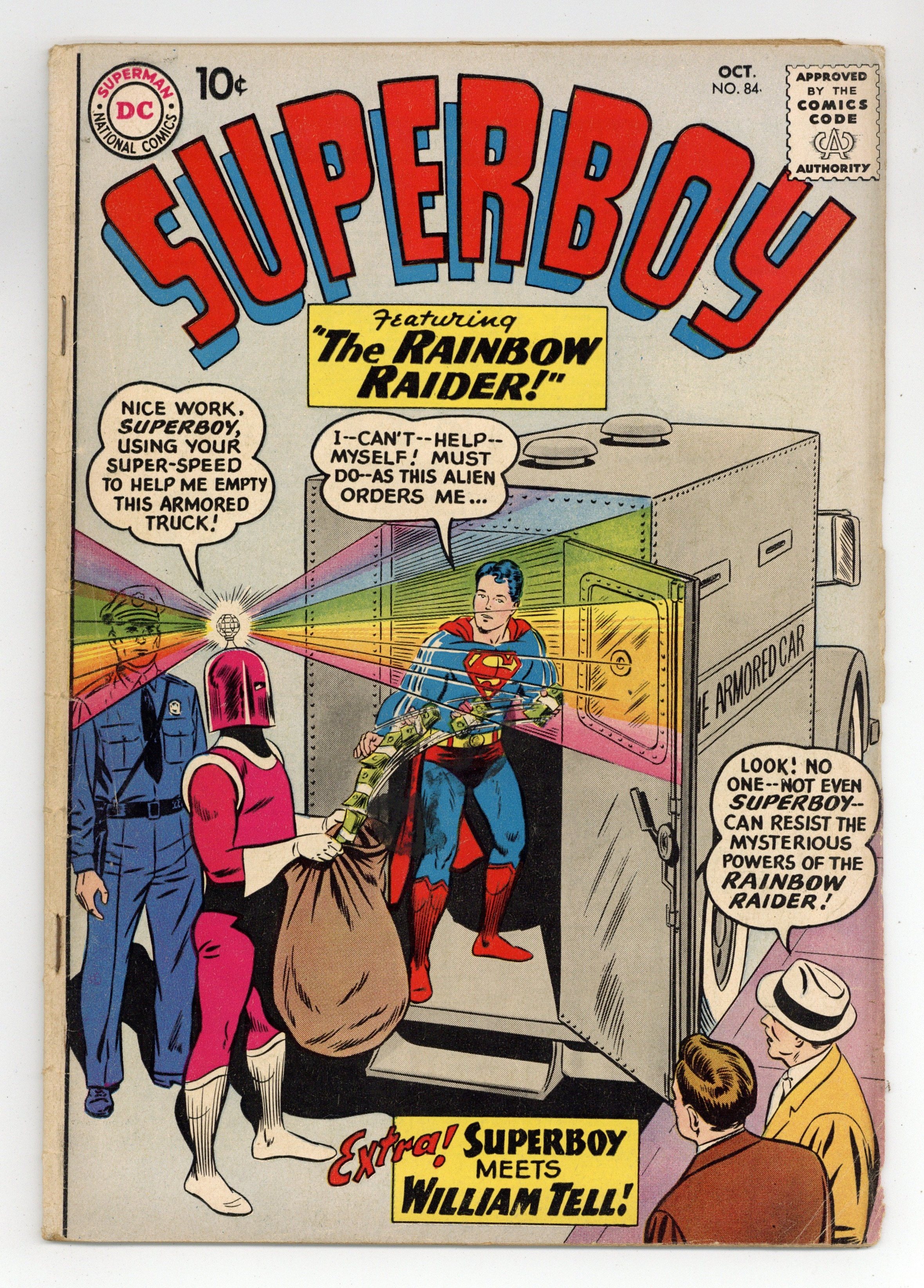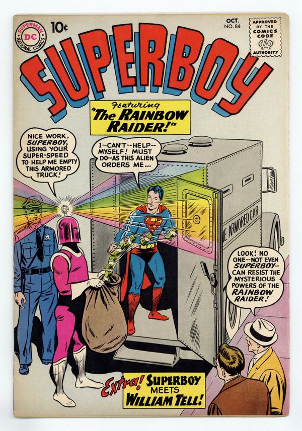 Cover pencils by Curt Swan, inks by Stan Kaye. Superboy Meets William Tell!, script by Jerry Siegel, art by George Papp; Superboy travels through time to meet William Tell. Ollie humor page by Henry Boltinoff. The Rainbow Raider!, script by Jerry Siegel, art by George Papp; The Rainbow Raider seems to have the power to make Superboy do whatever he wants. The Super-Injun of Smallville!, art by George Papp; Big Foot travels to Smallville from the nearby Indian reservation to buy a Superboy costume. 36 Pages, Full Color. Cover price $0.10.