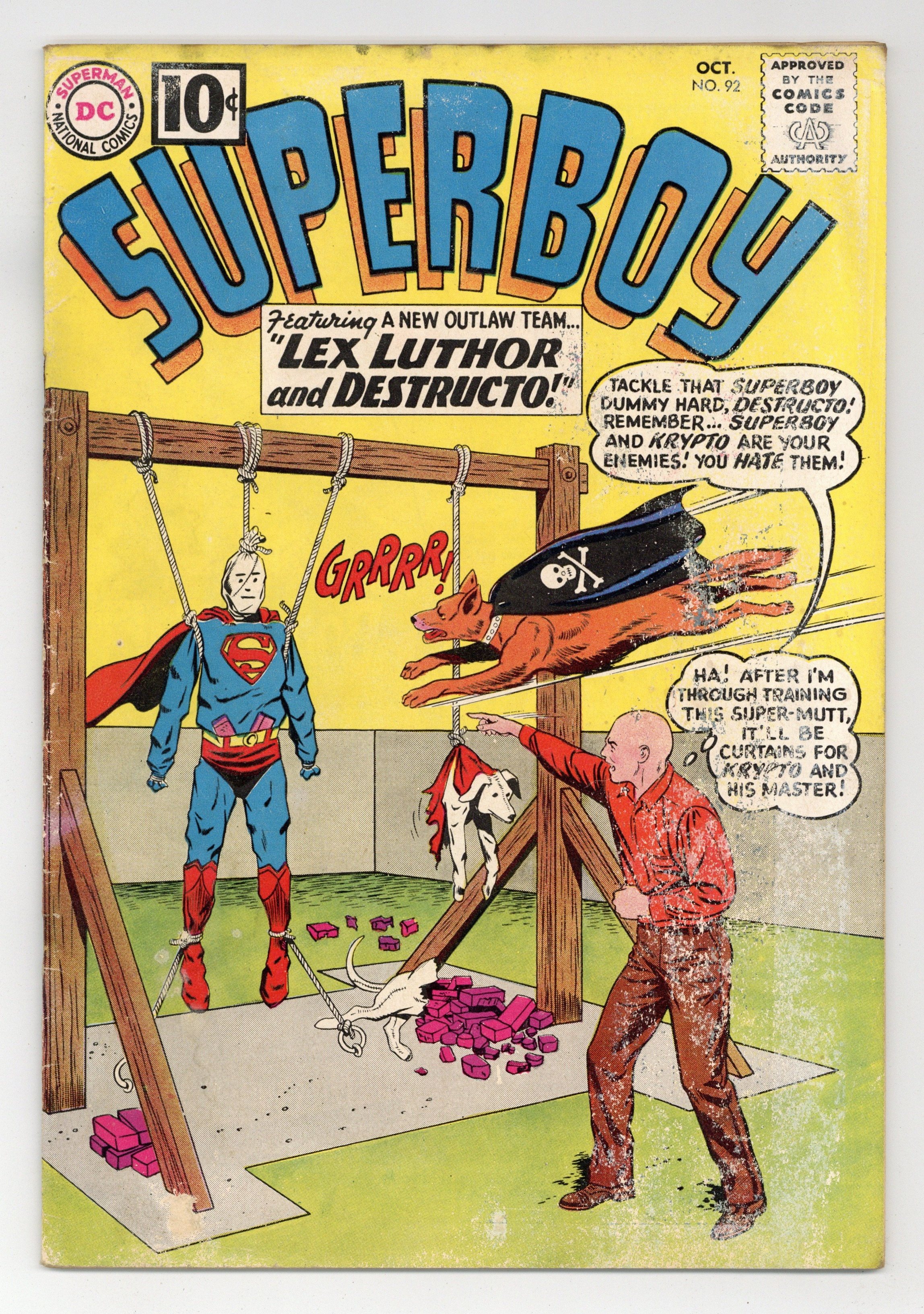 Last 10-cent cover price. Cover pencils by Curt Swan, inks by Stan Kaye. "Superboy Meets Ben Hur!", pencils by Curt Swan, inks by Stan Kaye; Superboy journeys back in time to meet Ben-Hur and save Professor Lang's job. Ollie humor page by Henry Boltinoff. "Krypto's Arch-Enemy!" starring Luthor and Destructo (Luthor's dog), script by Otto Binder, art by George Papp; Luthor's origin retold; Luthor accidentally gives his dog super-powers and then uses him to disgrace Krypto. Giant Superman Annual ad. 36 Pages, Full Color. Cover price $0.10.