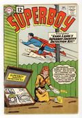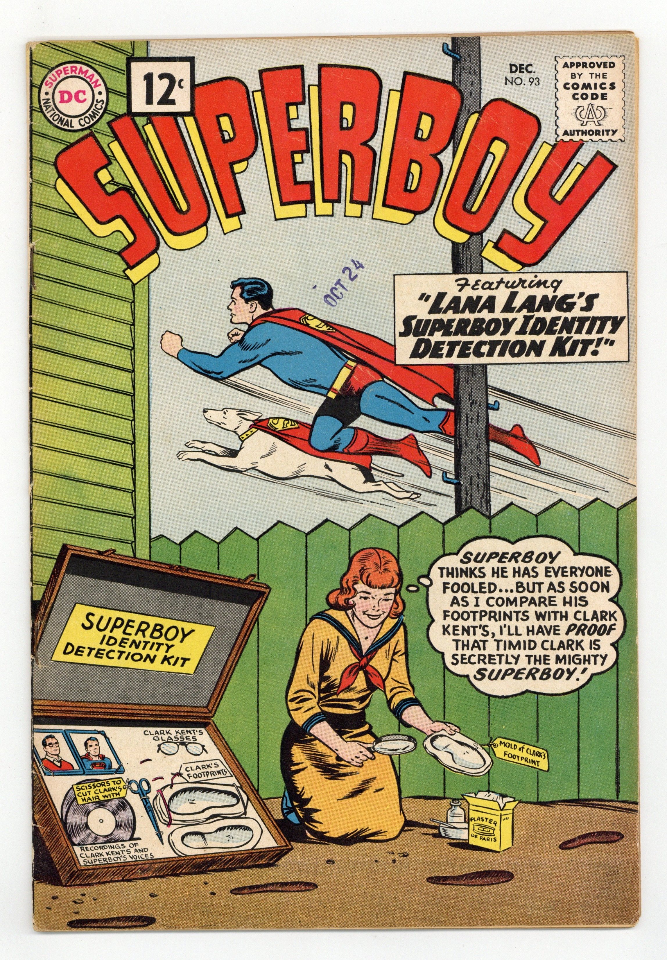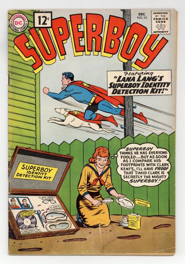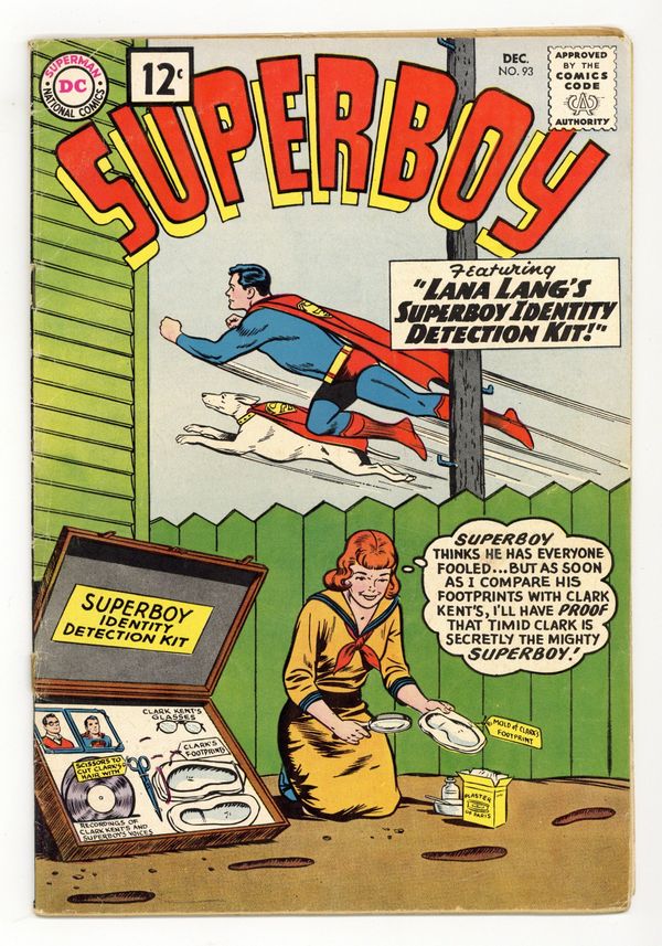 First 12-cent cover price. Cover pencils by Curt Swan, inks by Stan Kaye. "The Great Super-Hunt!" starring Superboy, Professor Lewis Lang, and Bert Grant, art by Al Plastino; Bert Grant wants to prove he's the world's greatest hunter by daring Superboy to find him before he blows up Smallville. Little Pete humor page by Henry Boltinoff. Homer humor page by Henry Boltinoff. "Lana Lang's Superboy Identity Detection Kit!" starring Superboy and Chameleon Boy, script by Jerry Siegel, art by George Papp; Chameleon Boy helps Superboy hide his secret identity from Lana. People are People! public service announcement, script by Jack Schiff, art by Lou Cameron. 36 Pages, Full Color. Cover price $0.12.