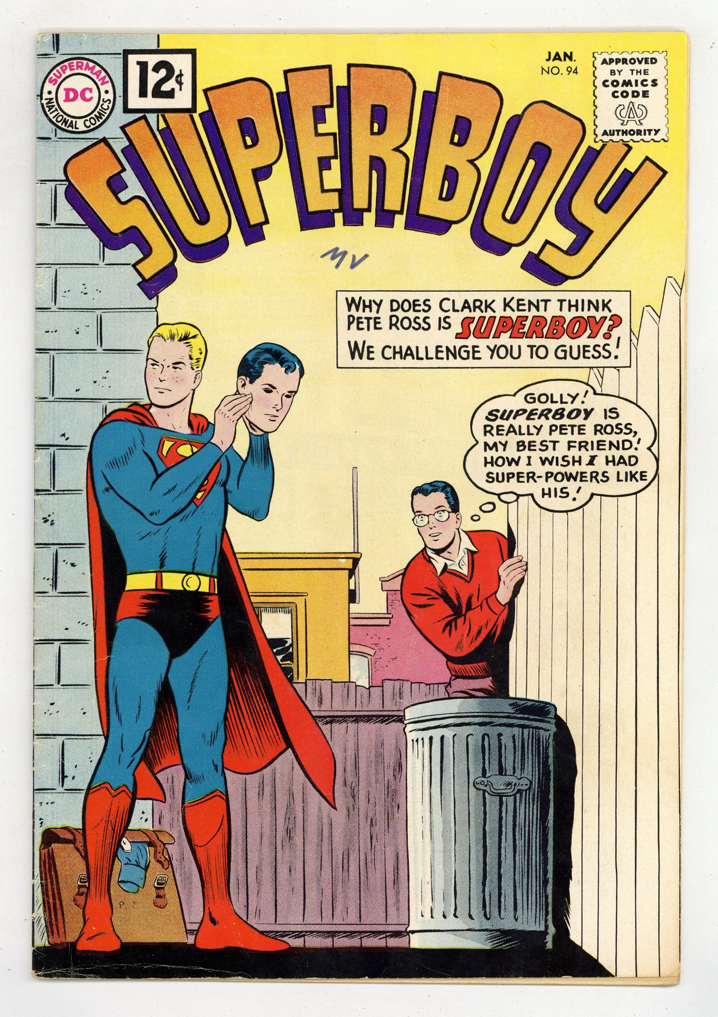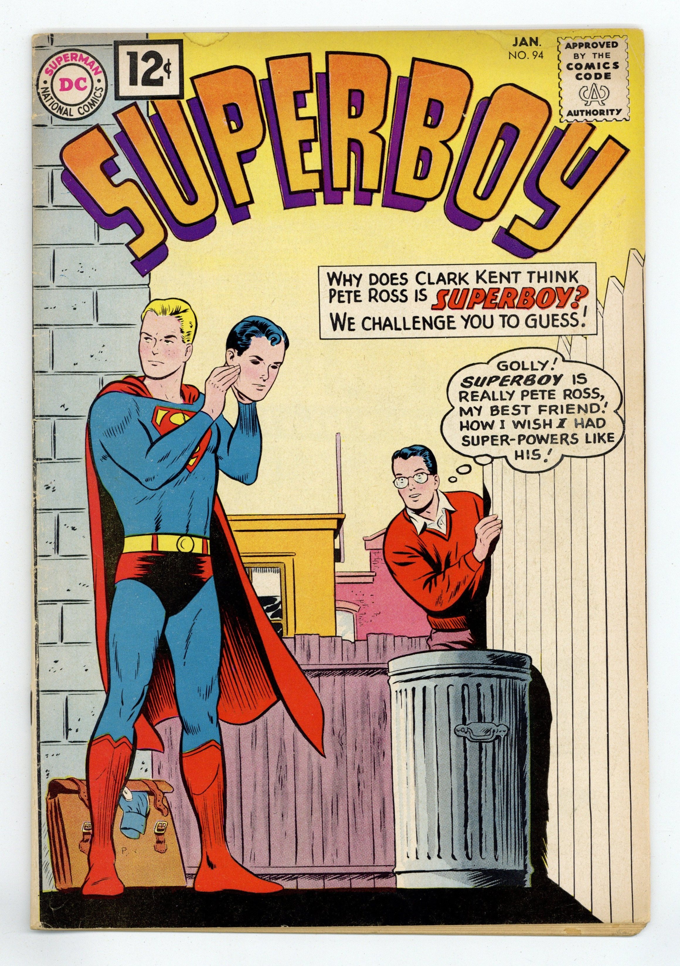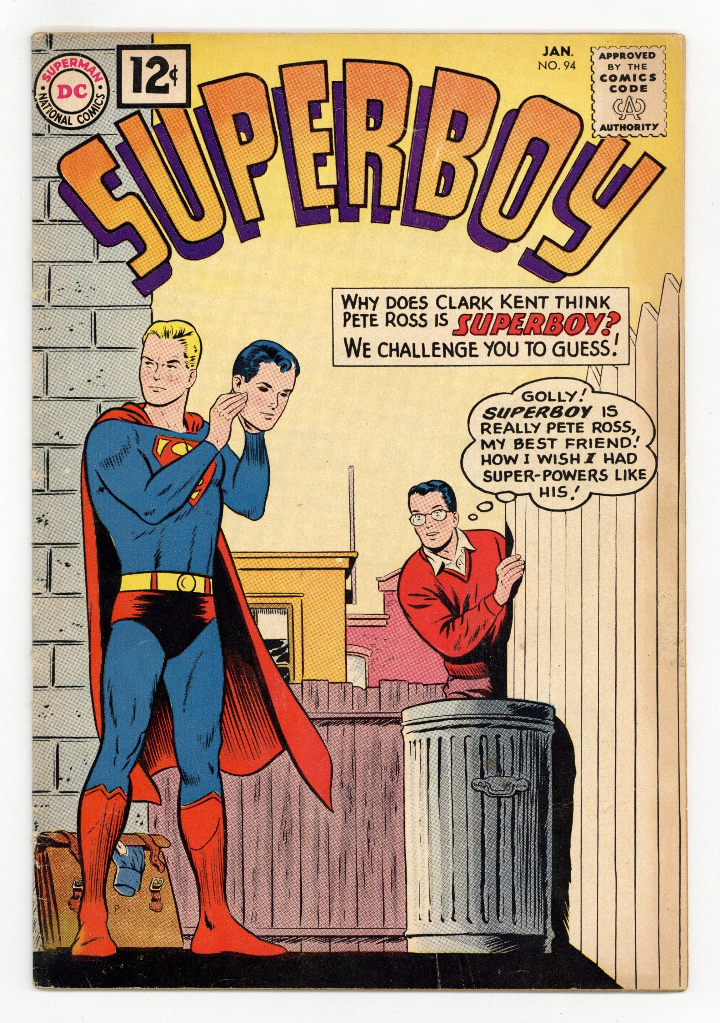 Cover pencils by Curt Swan, inks by Stan Kaye. "The Superboy Revenge Squad," art by George Papp; Superboy hypnotizes himself to believe he is ordinary to fool the Superboy Revenge Squad; Pete Ross pretends to be Superboy and has Clark inadvertently performing super tricks. Varsity Vic humor page by Henry Boltinoff. Giant Superman Annual ad. The Secret of the Happy Pig! public service announcement starring Peter Porkchops, script by Jack Schiff, art by Rube Grossman. Shorty humor half-page by Henry Boltinoff. "The Boy of Steel's Super-Initiation!", art by George Papp; When Clark Kent fails the cruel initiation tests of a high school fraternity, he pledges as Superboy to teach the frat leader a well-deserved lesson. Ad for Action Comics, Superman's Pal, Jimmy Olsen, and Adventure Comics. Full page ad for Batman Annual #2, on sale Nov. 16th, 1962. 36 Pages, Full Color. Cover price $0.12.
