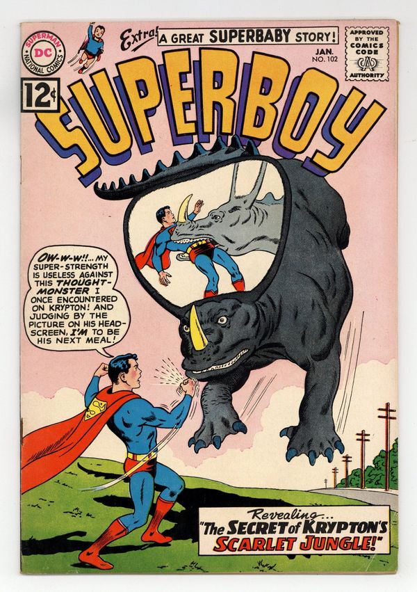 Cover pencils by Curt Swan, inks by George Klein. "The Amazing Tots of Smallville!", script by Jerry Siegel, art by Al Plastino; A mob is operating a whiskey still near Smallville and intend to shut Jonathan Kent's mouth for demanding the police drive the gang away and to steal an invention of Prof. Lewis Lang's, but Superbaby accidentally foils their plans. Superman comic ad. The Secret Adventures of Batman and Robin comic ad. Touchdown for Picasso! public service announcement on the fine arts, script by Jack Schiff, art by Sheldon Moldoff. Lem 'n' Lime humor page by Henry Boltinoff. Ollie humor page by Henry Boltinoff. Strange Sports Stories comic ad. "The Secret of Krypton's Scarlet Jungle!", script by Jerry Siegel, art by George Papp; A Kryptonian Thought-Beast lands on Earth; Superboy must find a way to stop his rampage and get him to leave Earth. Rudolph the Red-Nosed Reindeer comic ad. 36 Pages, Full Color. Cover price $0.12.
