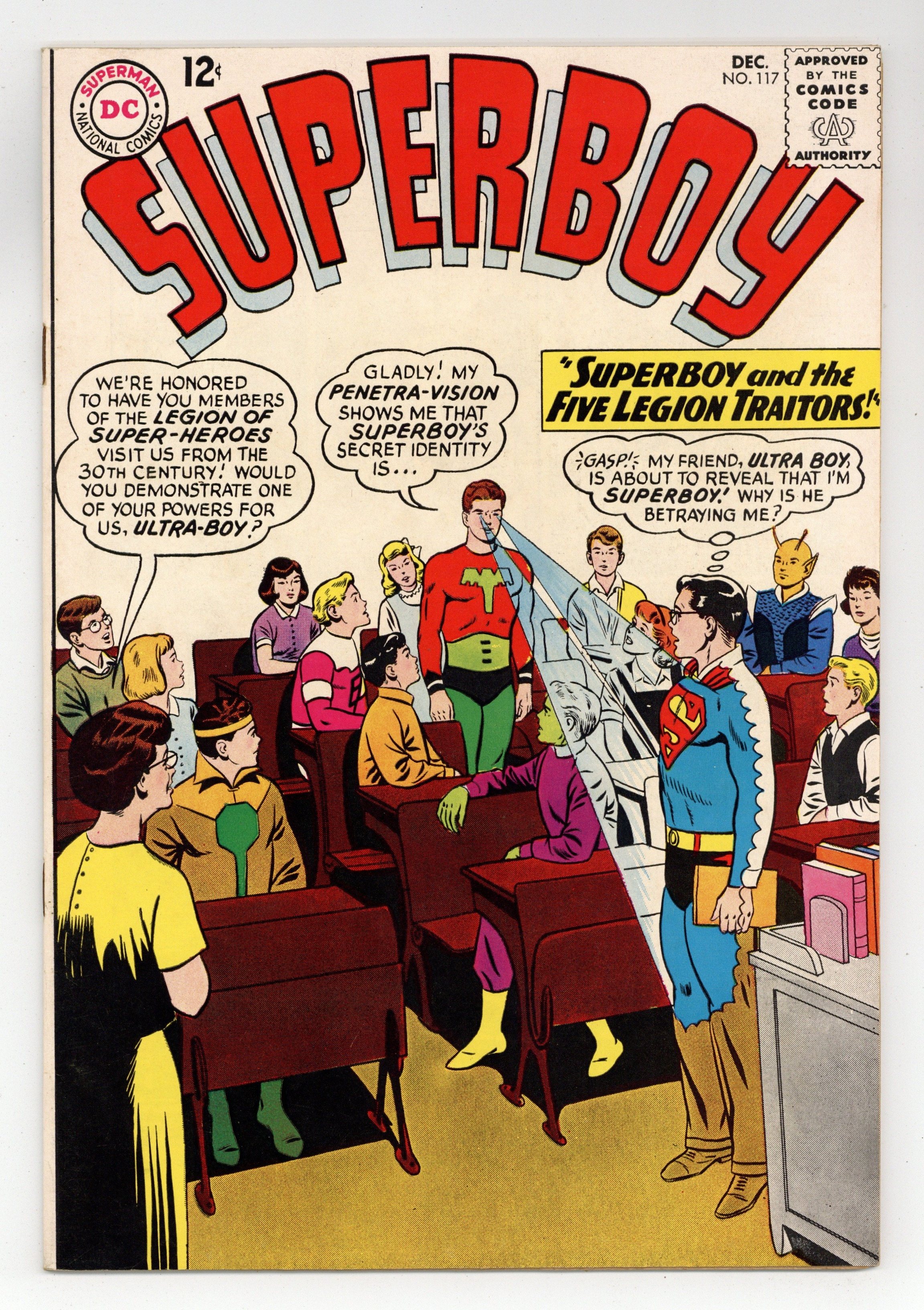 Cover pencils by Curt Swan, inks by Sheldon Moldoff. Children of Tomorrow! public service announcement, script by Jack Schiff, art by Bernard Baily. Secret of Camp Storm King!, art by George Papp. Tricksy humor page by Henry Boltinoff. Krypto's Superdog Pal!, script by Otto Binder, art by George Papp; Krypto discovers a Kryptonian dog in the Phantom Zone. Superboy and the 5 Legion Traitors!, script by Jerry Siegel, pencils by Curt Swan, inks by George Klein; Superboy accidentally arrives in a parallel world where the Legion are villains. Rocky and Bullwinkle star in a one-page Cheerios ad. 36 Pages, Full Color. Cover price $0.12.