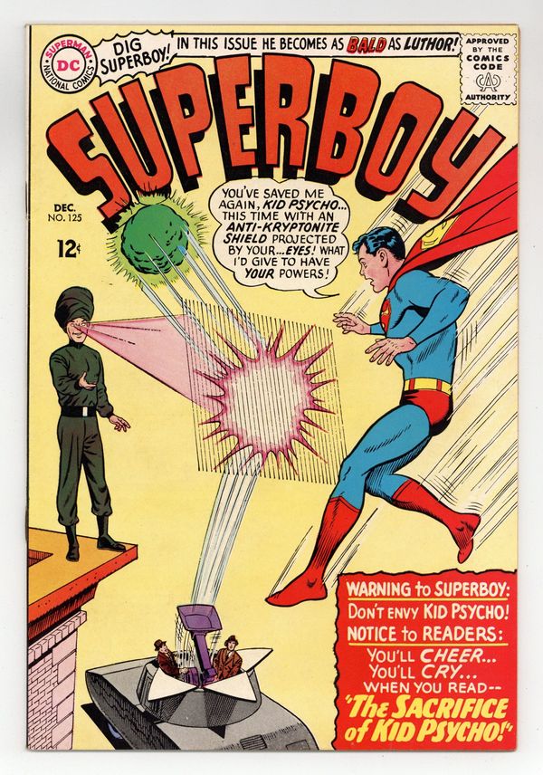 Cover art by Curt Swan, inks by George Klein. Builders of the Future! public service announcement; Shows the importance of UNESCO funding in building schools in Africa. The Bald Boy of Steel!, script by Otto Binder, art by George Papp. Krypto's Super-Movie Stunts!, script by Otto Binder, art by Al Plastino; Krypto loses his collar and is adopted by movie producer Dan Diamond to be the stunt dog for Jowls. The Sacrifice of Kid Psycho!, script by Otto Binder, art by George Papp; Kid Psycho comes from the Legion's time and impresses Superboy, who returns with him to the 30th century for reconsideration of Kid Psycho's petition for membership. Cap's Hobby Center activity half-page by Henry Boltinoff. Rocky and Bullwinkle star in a one-page Cheerios ad. 36 Pages, Full Color. Cover price $0.12.