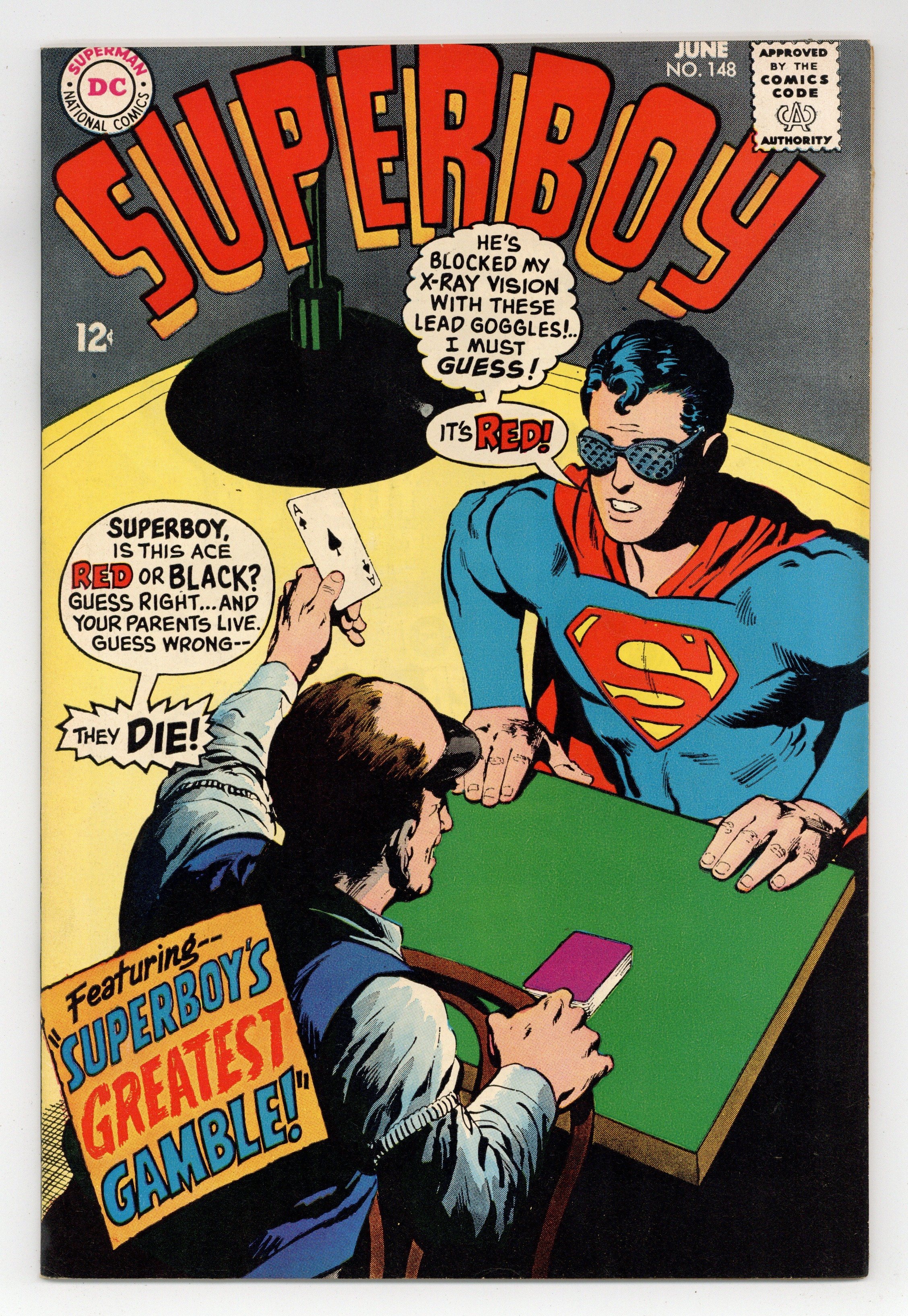 Cover art by Neal Adams. "Superboy's Greatest Gamble!", script by Leo Dorfman, pencils by Curt Swan, inks by Jack Abel; Superboy engineers a ruse in which a hypnotized gambler threatens to blow up the Kent house, which causes the flame-creatures who have possessed the Kents to abandon their bodies in fear; Mr. and Mrs. Mintar Bannin, Polar Boy's parents, who both possess the same powers as their son, radiate super-cold and destroy the flame-beings. "The Canine that Outclassed Krypto!", script by Cary Bates, pencils by George Papp, inks by Chic Stone; Superboy rescues a zkor, a super-powered animal from space; In gratitude, the zkor follows him to Earth and competes with Krypto for the right to be his pet; Finally, the zkor decides that the noble thing to do would be to let Krypto continue being Superboy's canine companion.. Cap's Hobby Hints humor page by Henry Boltinoff. 36 Pages, Full Color. Cover price $0.12.