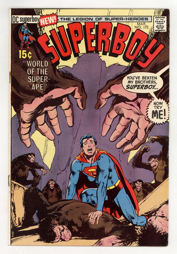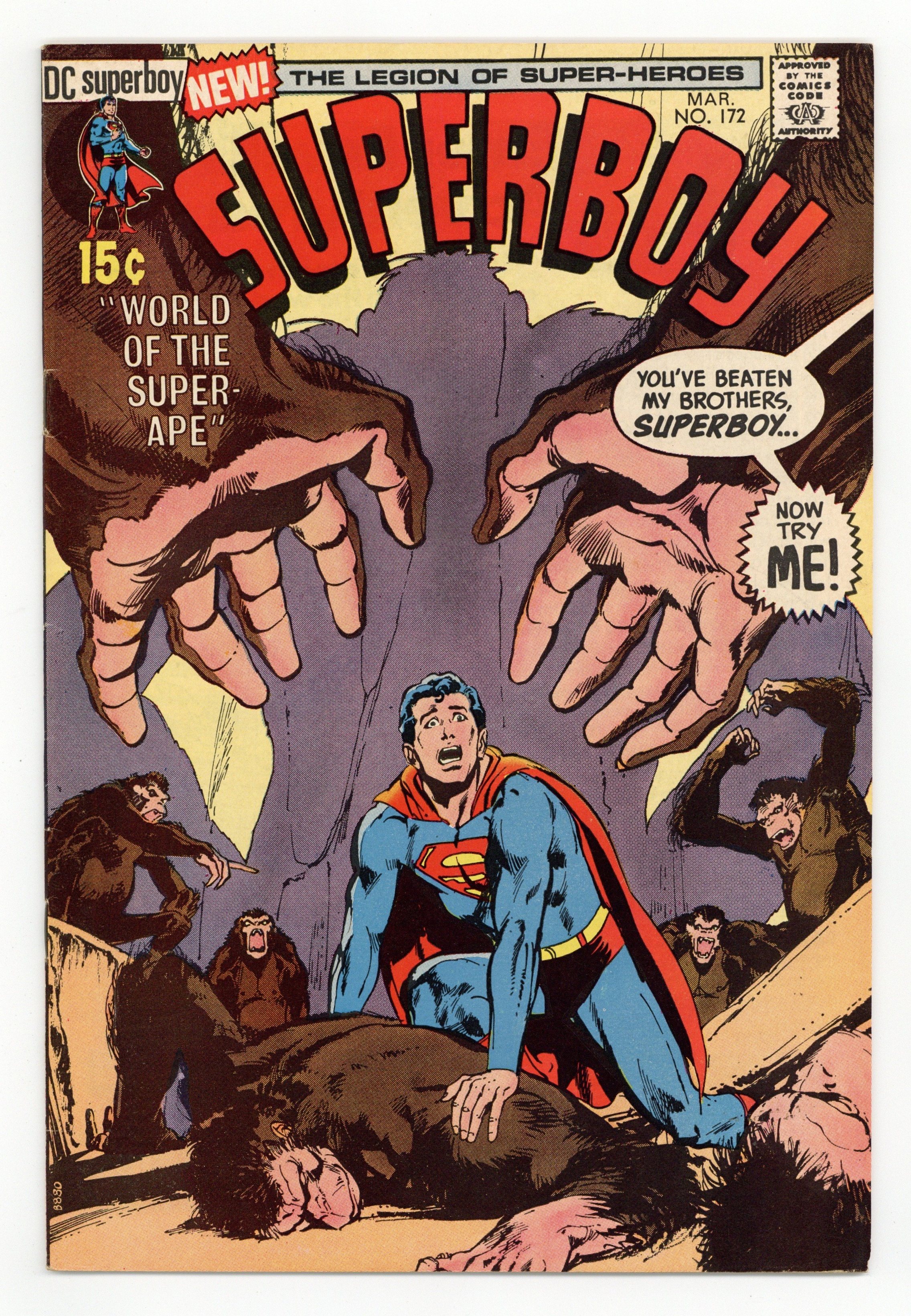 Cover art by Neal Adams. The World of the Super-Ape!, script by Frank Robbins, pencils by Bob Brown, inks by Murphy Anderson; Superboy meets Yango, a gorilla from Krypton, who speaks Kryptonian and possesses the same powers as Superboy. Brotherly Hate!, script by E. Nelson Bridwell, art by George Tuska; Lightning Lad, Light Lass, and Timber Wolf track down Lightning Lord, who has robbed the Inter-Planetary Bank. Statement of ownership--average print run, approximately 752,599; average paid circulation 377,525. 36 Pages, Full Color. Cover price $0.15.