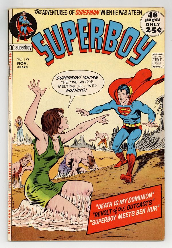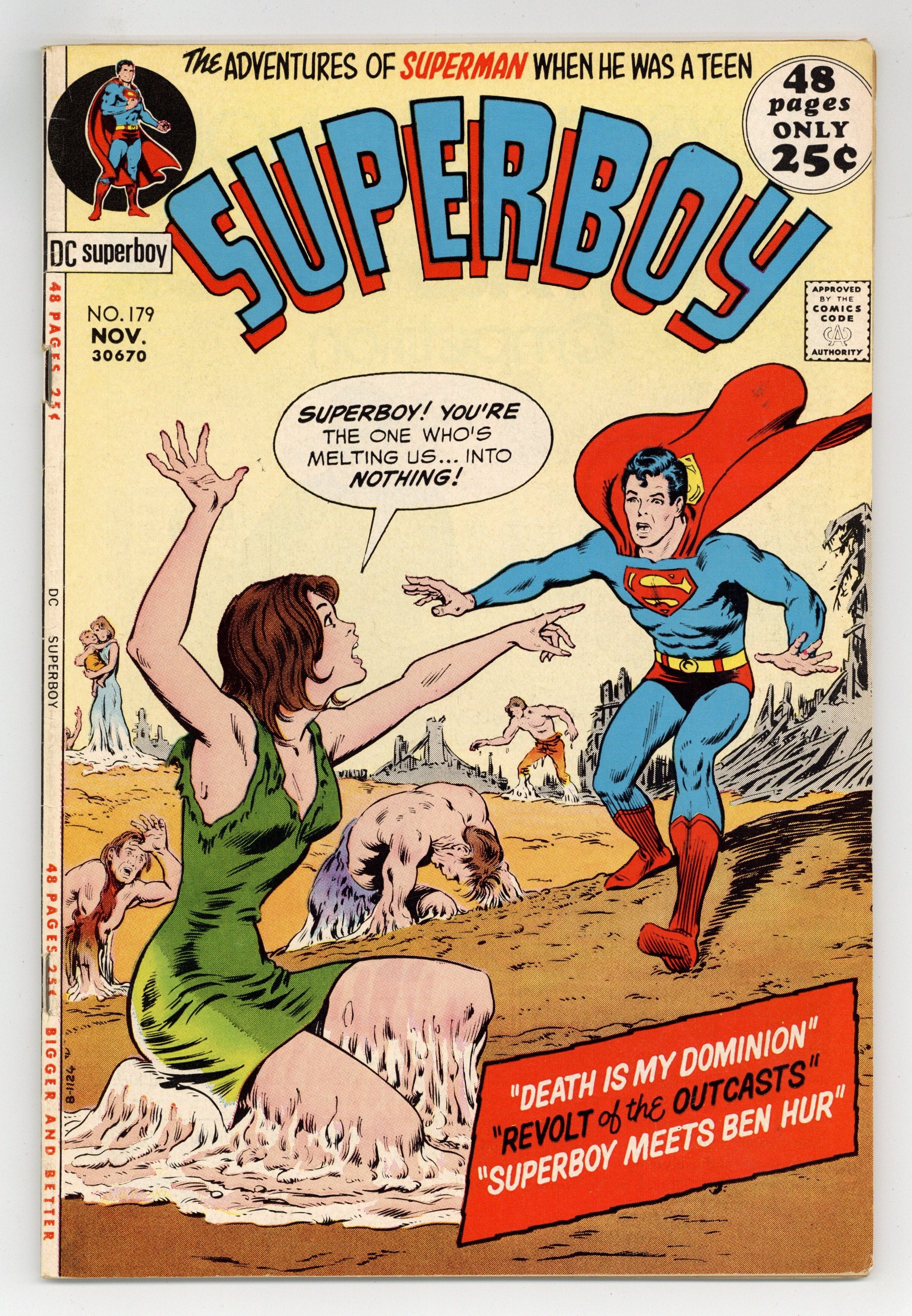 Cover pencils by Curt Swan, inks by Murphy Anderson. Death is My Dominion!, script by Leo Dorfman, pencils by Bob Brown, inks by Murphy Anderson; using androids, Lex Luthor lures Superboy into a Kryptonite trap. Superboy Meets Ben Hur!, pencils by Curt Swan, inks by Stan Kaye. The Revolt of the Outcasts!, script by Leo Dorfman, pencils by Bob Brown, inks by Murphy Anderson; Superboy helps poor residents in Hungry Hill keep their homes. Announcement page lists the winners of the ACBA Awards: Green Lantern 76 (best individual story), Green Lantern-Green Arrow (best continuing feature), Denny O'Neil,(best writer, dramatic division), Neal Adams (best pencil artist, dramatic division), and Dick Giordano (best inker, dramatic division). 52 Pages, Full Color. Cover price $0.25.