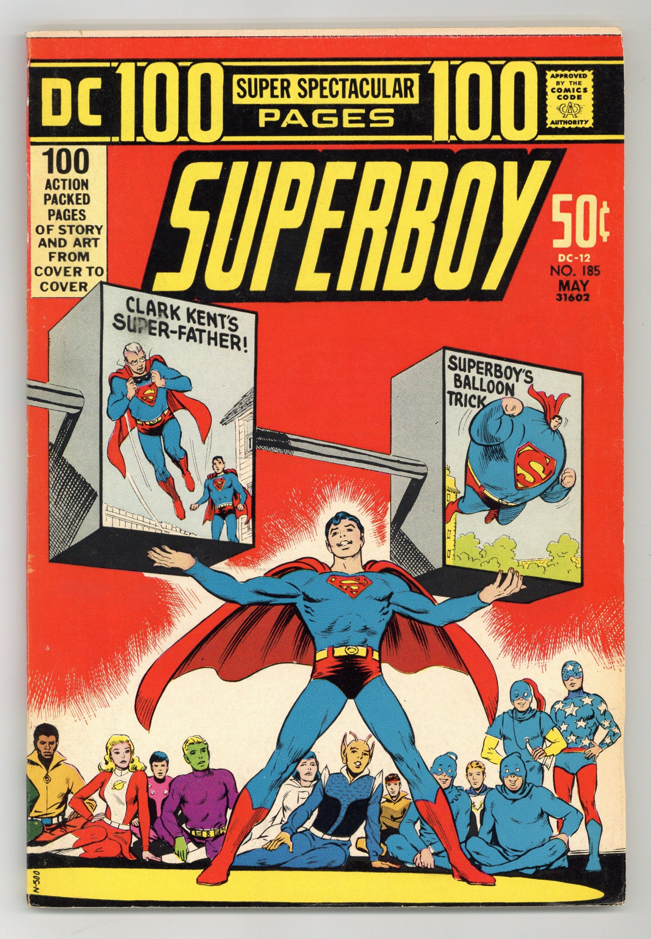 $23.50100-page giant DC-12; all reprints. Superboy in "Clark Kent's Super-Father" (art by George Papp; from Adventure Comics 289) and "The Rip Van Winkle of Smallville" (pencils by Curt Swan; from Adventure 208); the Star-Spangled Kid in "The Jigsaw Puzzle Murder" (art by Jon Small; from Star-Spangled Comics 55); the original Teen Titans in "The Astounding Separated Man" (script by Bob Haney, art by Bruno Premiani; from Brave and the Bold 60); Kid Eternity in "Kid Eternity Hoax" (from Hit Comics 46), Tales of the Legion of Super-Heroes story "The Eight Impossible Missions" (art by John Forte; from Adventure 323); Little Boy Blue and the Blue Boys in an untitled story (art by Jon L. Blummer; from Sensation Comics 1). Wraparound cover by Nick Cardy. 100 Pages, Full Color. Cover price $0.50.