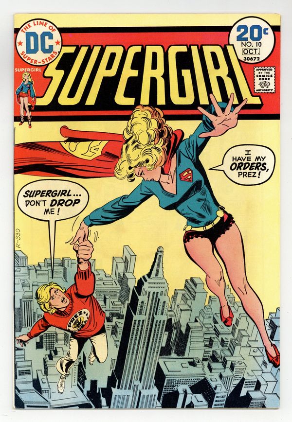 Tags: Superman$29.00Cover art by Bob Oksner. Death of a Prez!, script by Cary Bates, pencils by Art Saaf, inks by Vince Colletta; Supergirl must save Prez from three assassination attempts, including one from herself. Her Brother's Keeper!, script by Cary Bates, pencils by Art Saaf, inks by Vince Colletta; A mad scientist creates a male clone of Supergirl, and uses him to rob banks. 36 pgs. $0.20. Cover price $0.20.