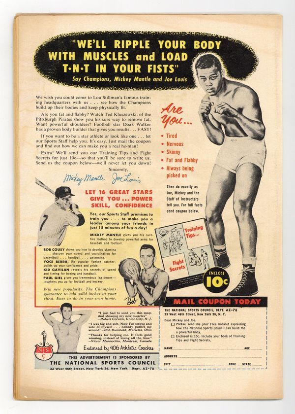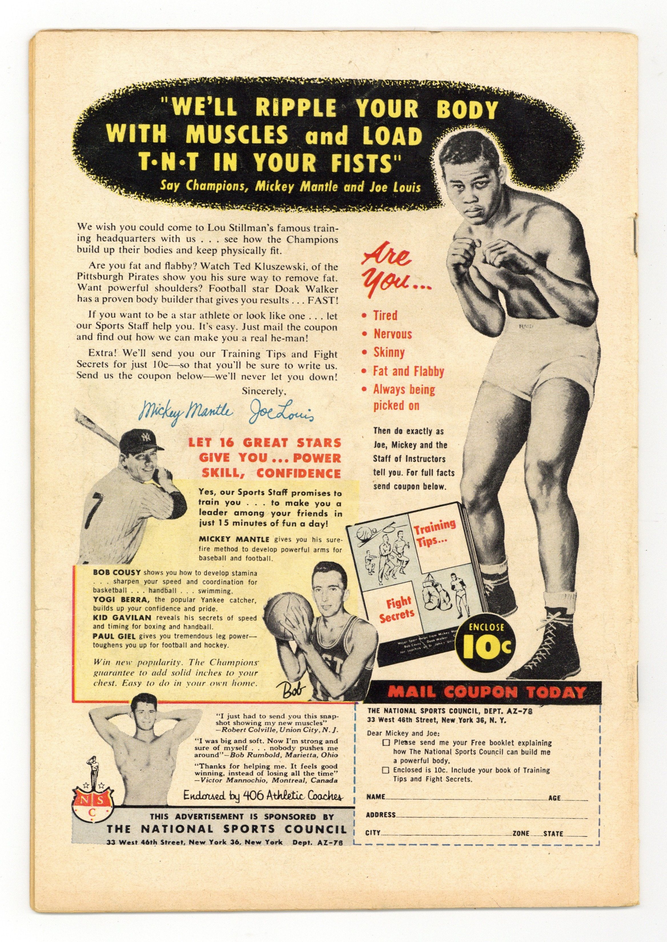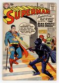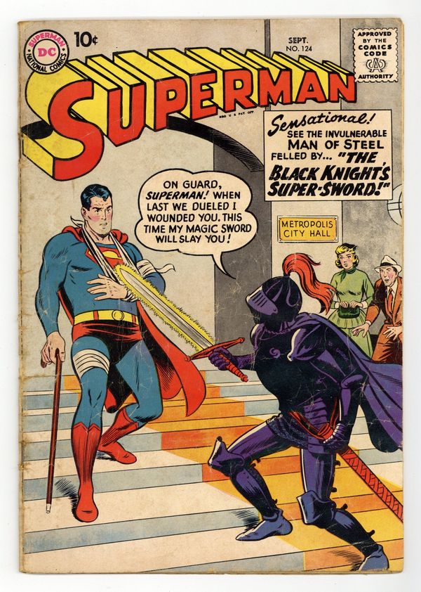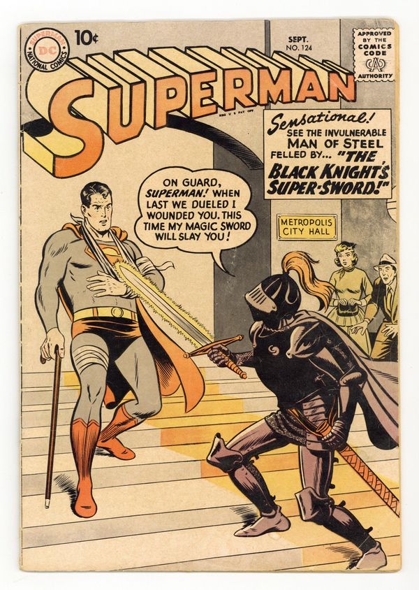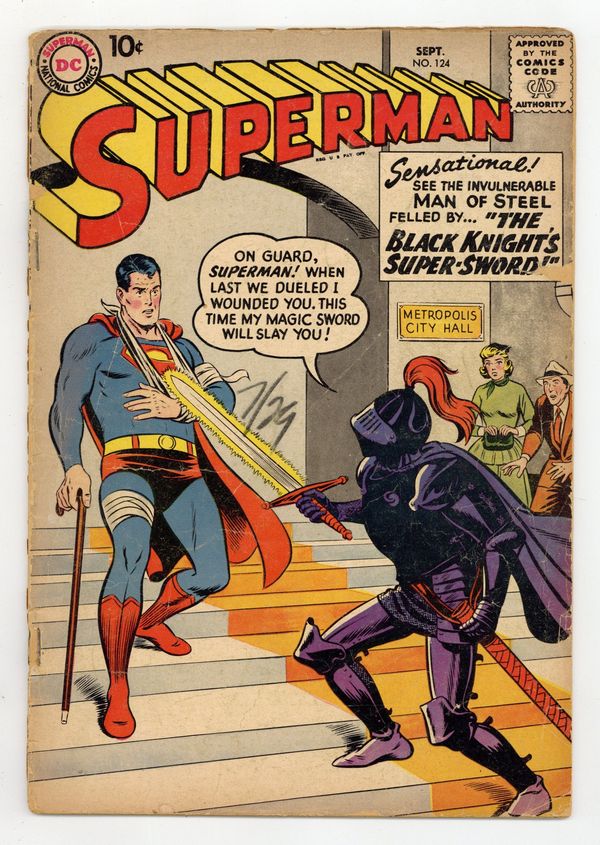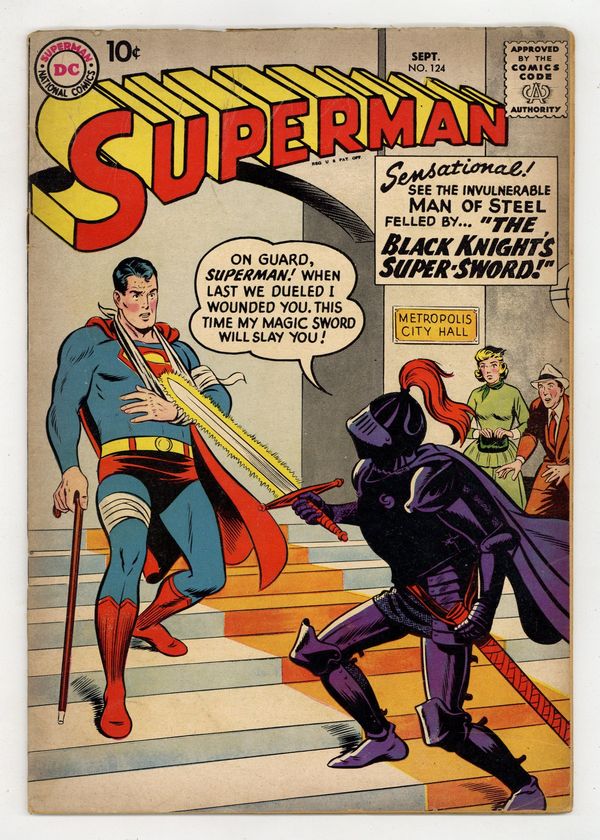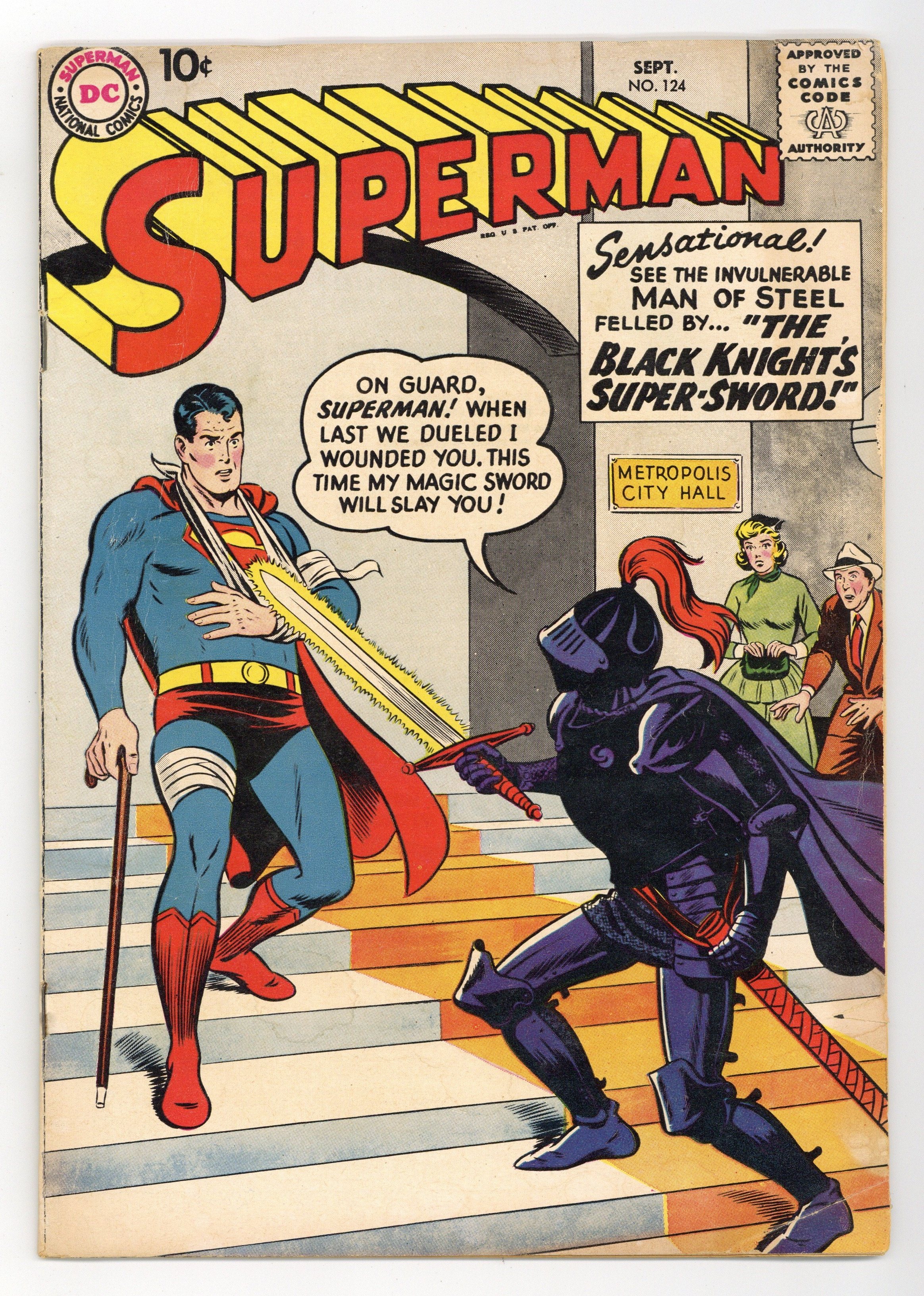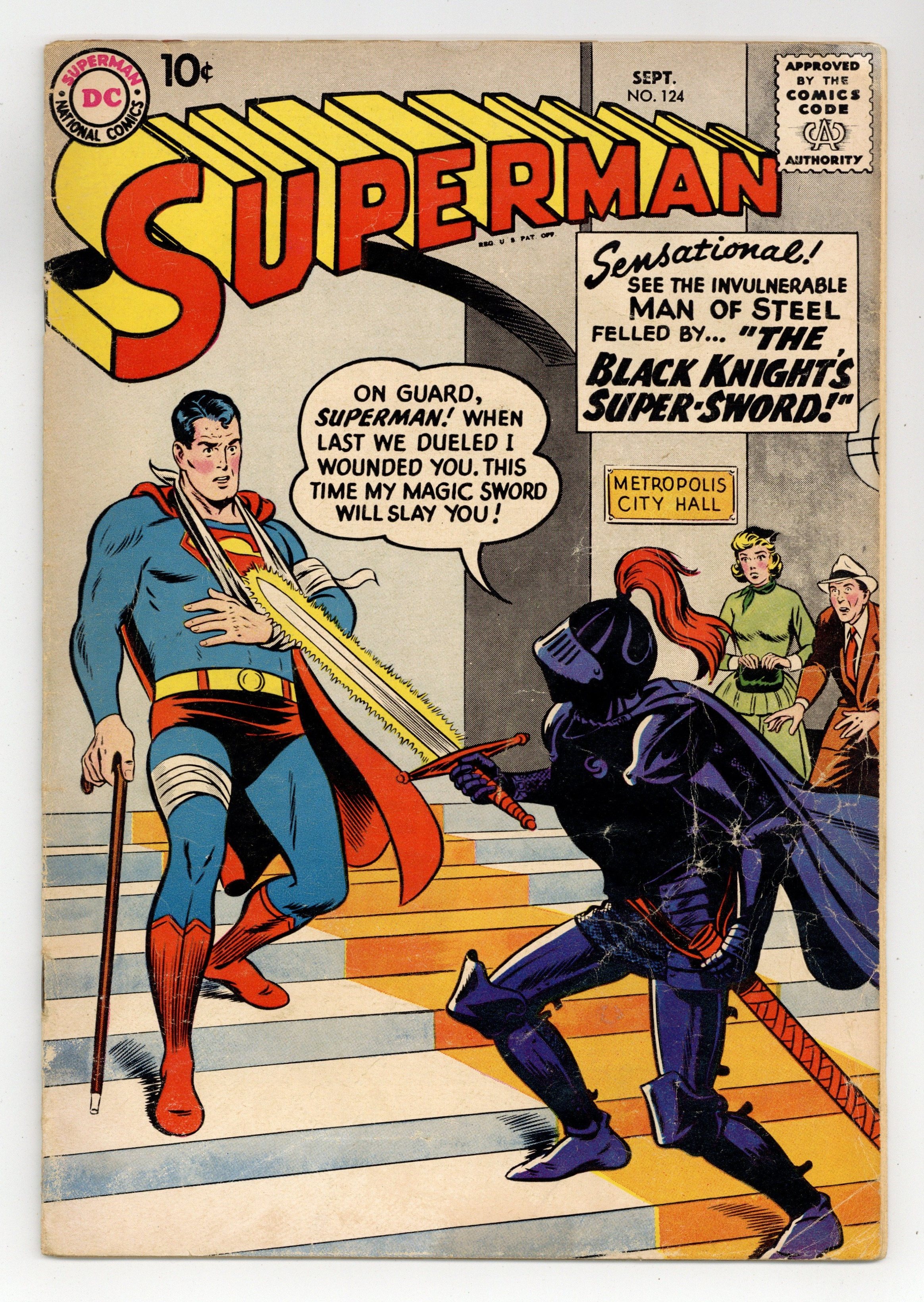 Cover pencils by Curt Swan, inks by Stan Kaye. The Super-Sword, art by Al Plastino; After Superman releases the Black Knight from a block of ice after nearly 1,000 years, the villain goes on a crime spree. Mrs. Superman, script by Otto Binder, art by Kurt Schaffenberger; When Clark and Lois are trapped on a remote island, Clark reveals his double identity to Lois and proposes marriage. The Steeplejack of Steel, pencils by Wayne Boring, inks by Stan Kaye; Superman takes a construction job undercover as Kirk Brent to expose a shady contractor. Full-page ad for DeLuxe Photo Service features small photos of Perry Como, Kim Novak, Pat Boone, Tony Curtis, Debbie Reynolds, and Elvis Presley. 36 Pages, Full Color. Cover price $0.10.