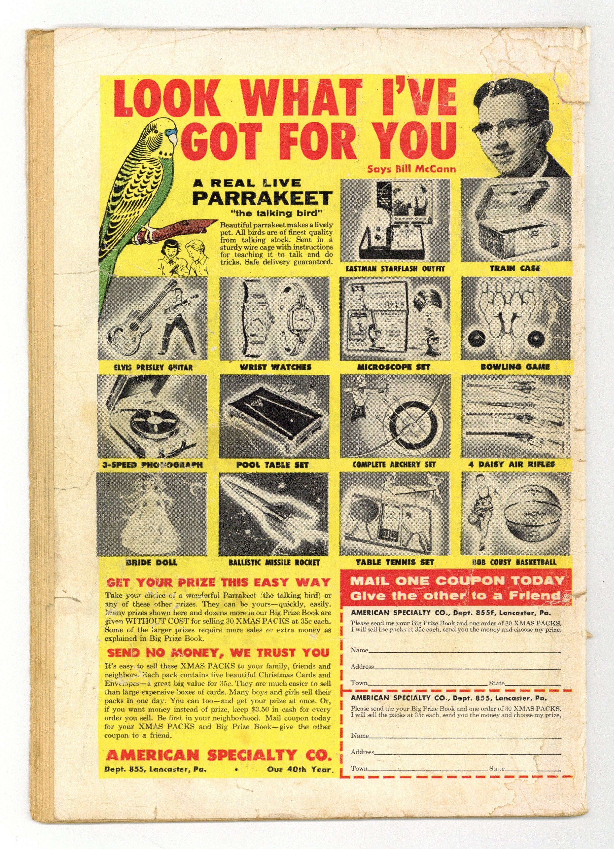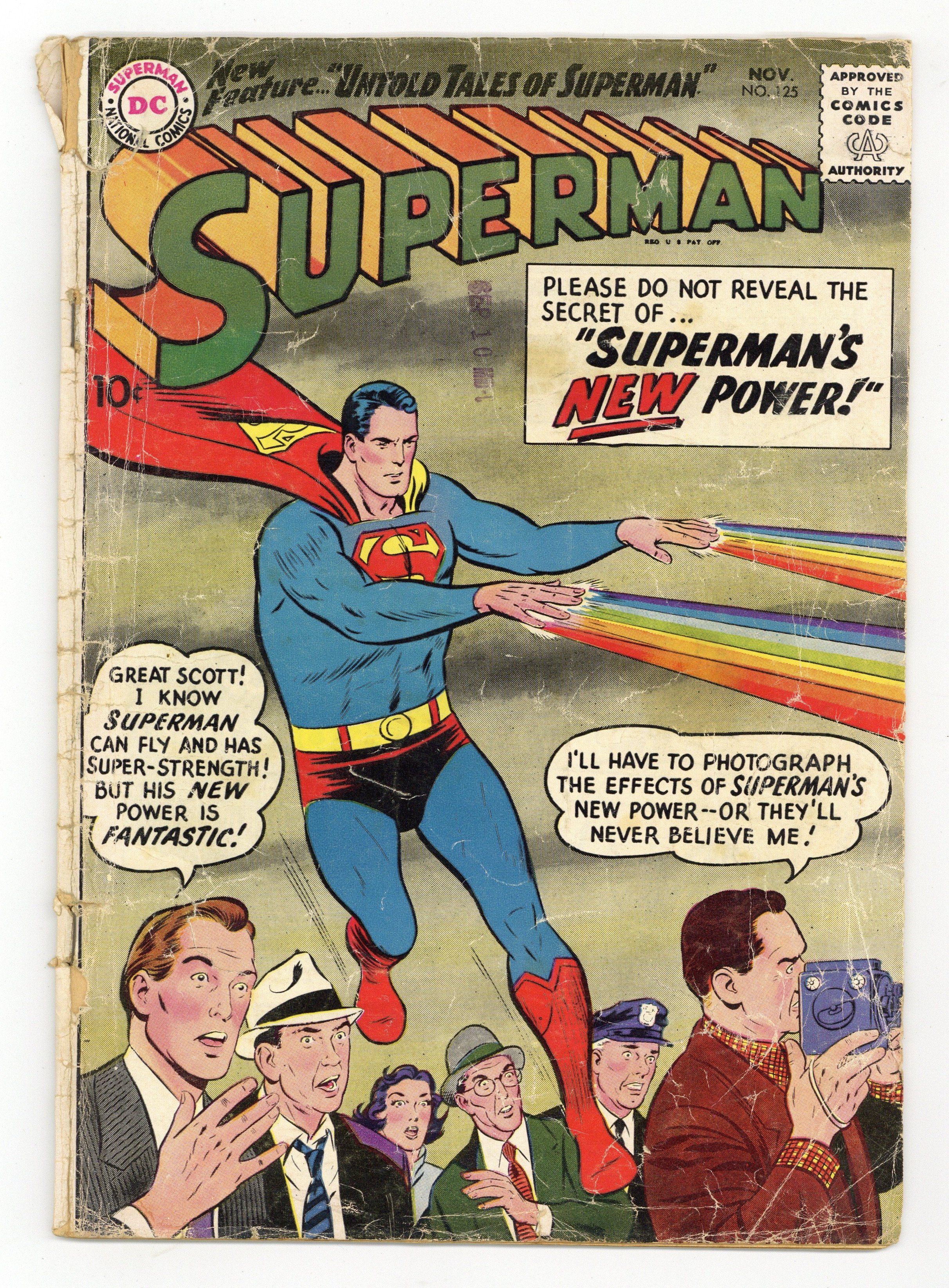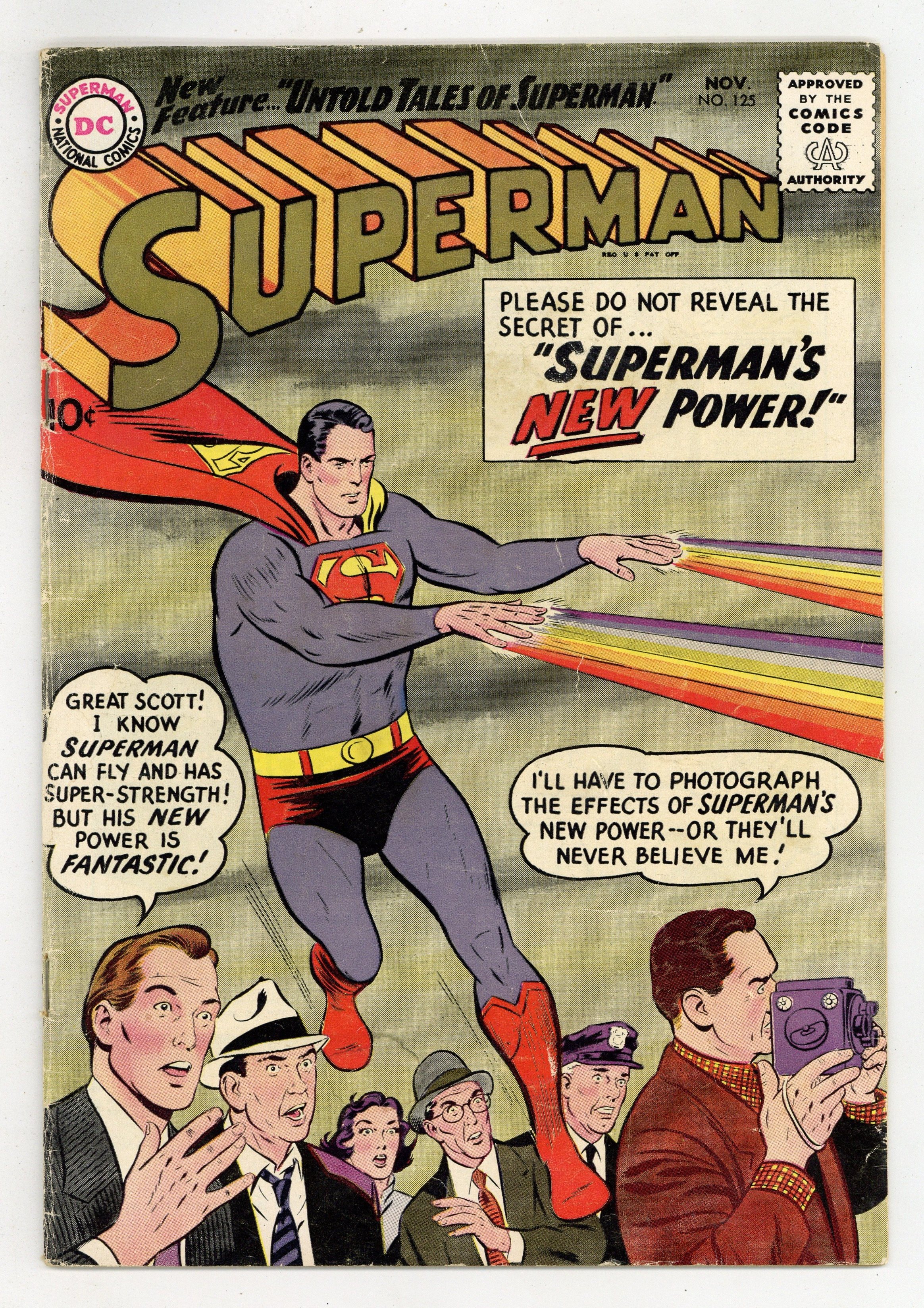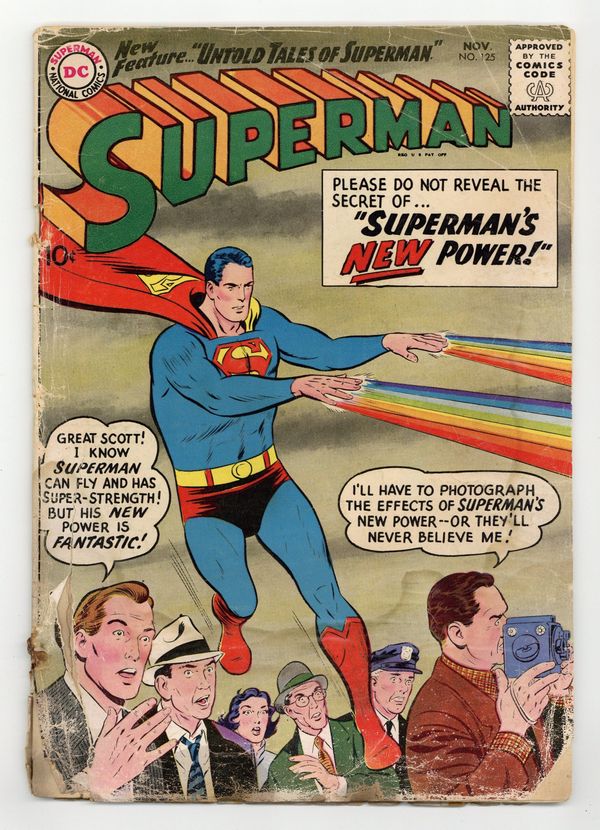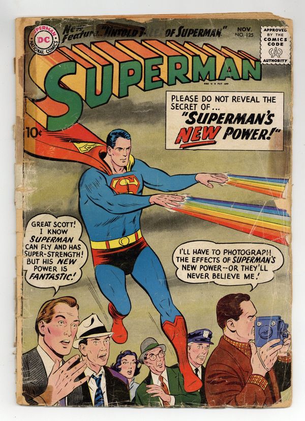 Cover pencils by Curt Swan, inks by Stan Kaye. Lois Lane's Super-Dream, script by Jerry Coleman, art by Kurt Schaffenberger; Lois dreams she and Clark gain super-powers and become Power-Girl and Power-Man. Clark Kent's College Days, script by Jerry Coleman, art by Al Plastino; Superman recalls his college days, particularly the professor who tried to scientifically prove that Clark Kent was Superboy. Superman's New Power!, pencils by Wayne Boring, inks by Stan Kaye; When Superman is exposed to the radiation from the explosion of an alien space ship, he loses his powers but gains the ability to create a miniature version of himself. 36 Pages, Full Color. NOTE: A 2023 DC HeroClix was produced based on this cover. - Odinson, mycomicshop.com Archivist Cover price $0.10.