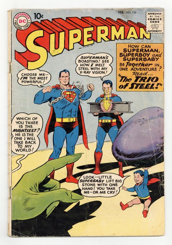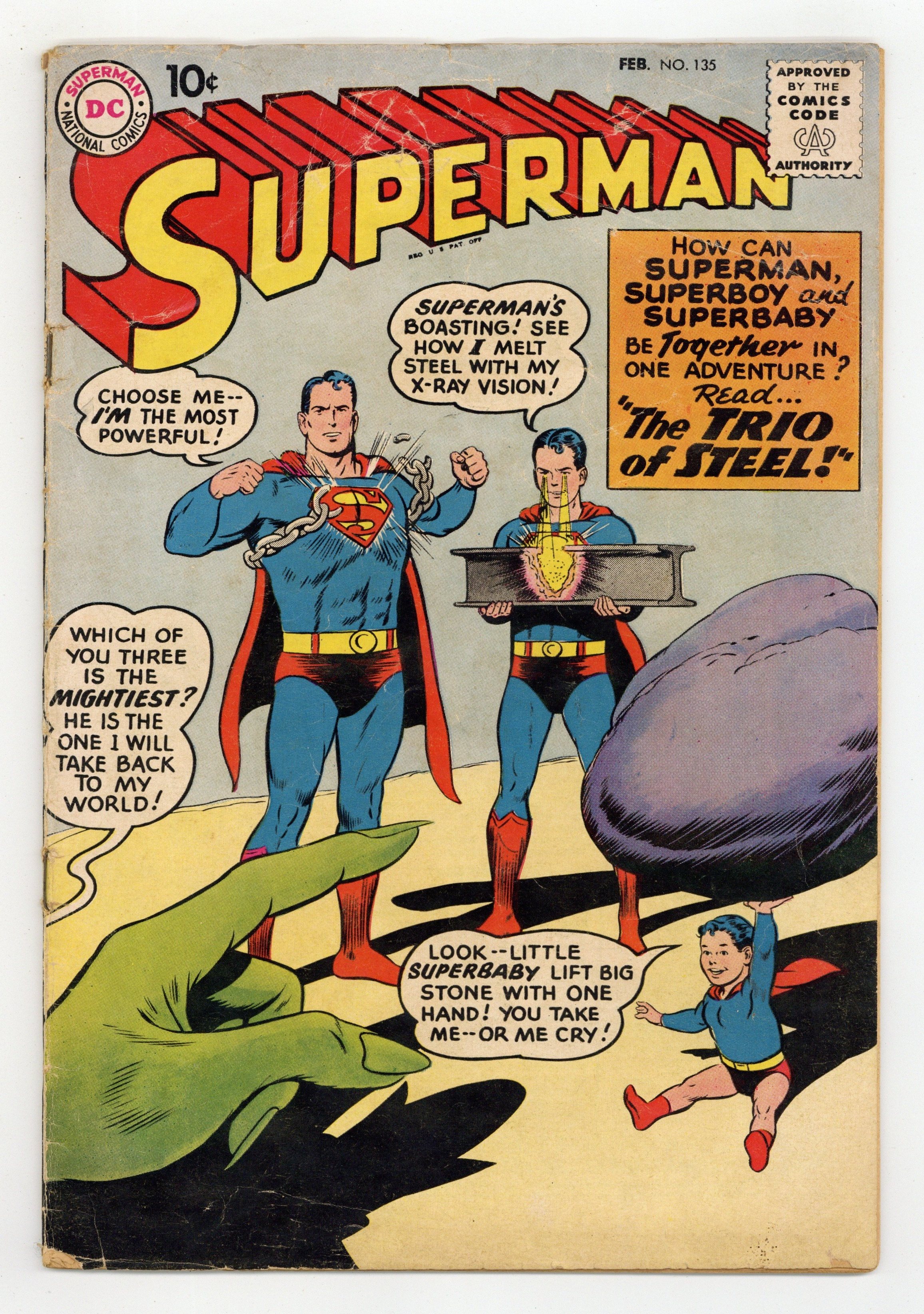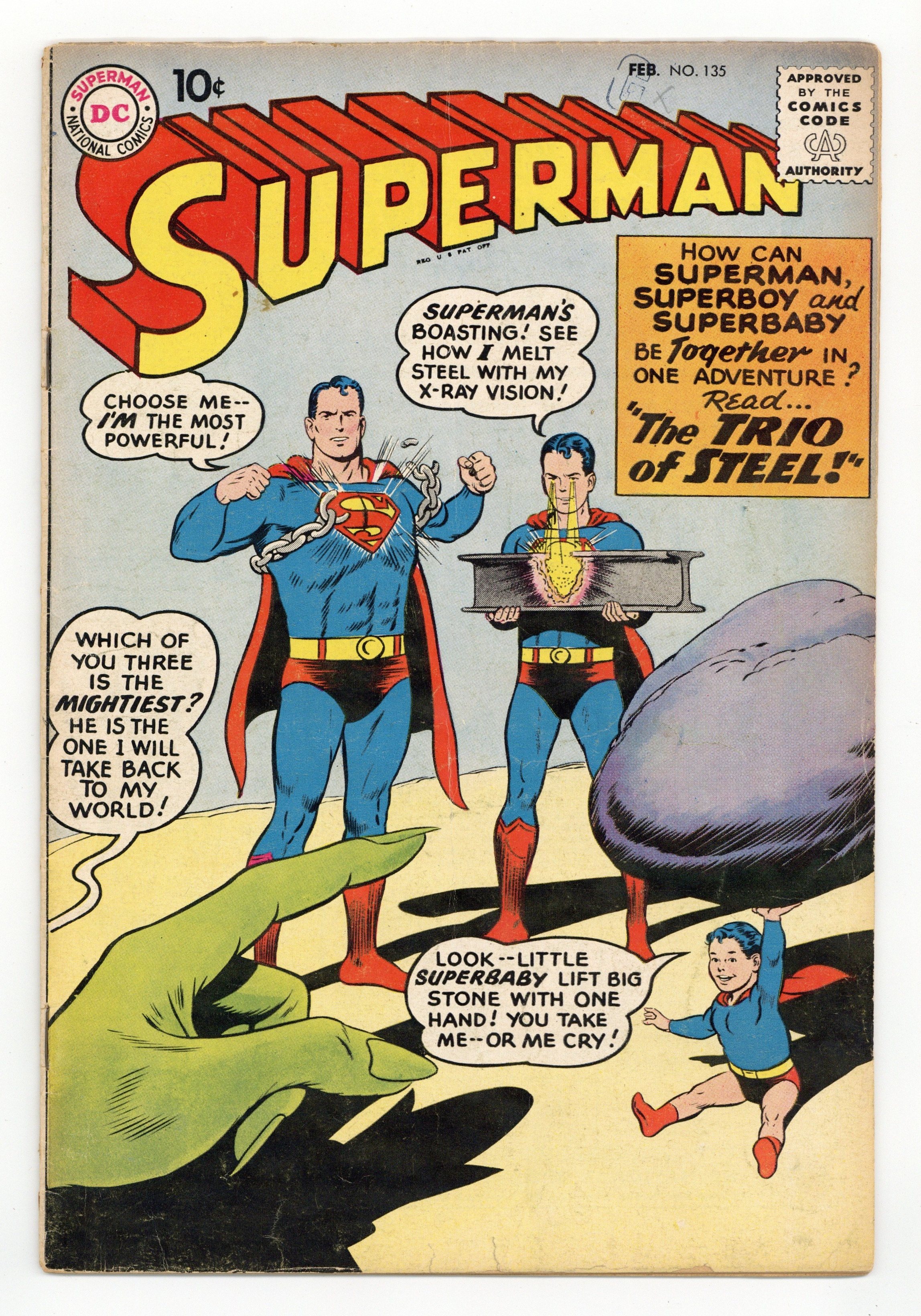 Cover pencils by Curt Swan, inks by Stan Kaye. When Lois First Suspected Clark Was Superman, script by Jerry Siegel, art by Al Plastino; An untold tale of how Lois first suspected Clark Kent was Superman. Tricksy, World's Greatest Stunt Man humor page by Henry Boltinoff. Superman's Mermaid Sweetheart, script by Jerry Siegel, pencils by Wayne Boring, inks by Stan Kaye; Superman re-unites with Lori Lemaris for the first time since college. Ad for Superman's Girl Friend, Lois Lane, Action Comics, and Superboy. The Trio of Steel, script by Jerry Siegel, art by Al Plastino; Superman becomes Super-Pest, playing stupid tricks and embarrassing his friends, while under 5th dimensional influence. 36 Pages, Full Color. Cover price $0.10.