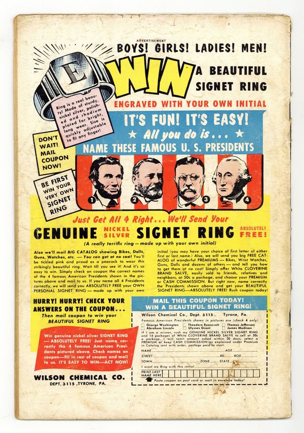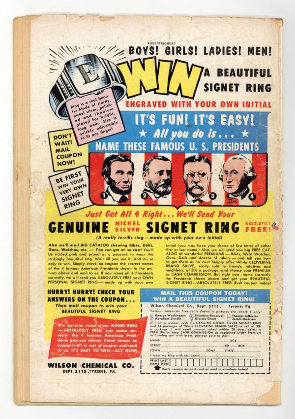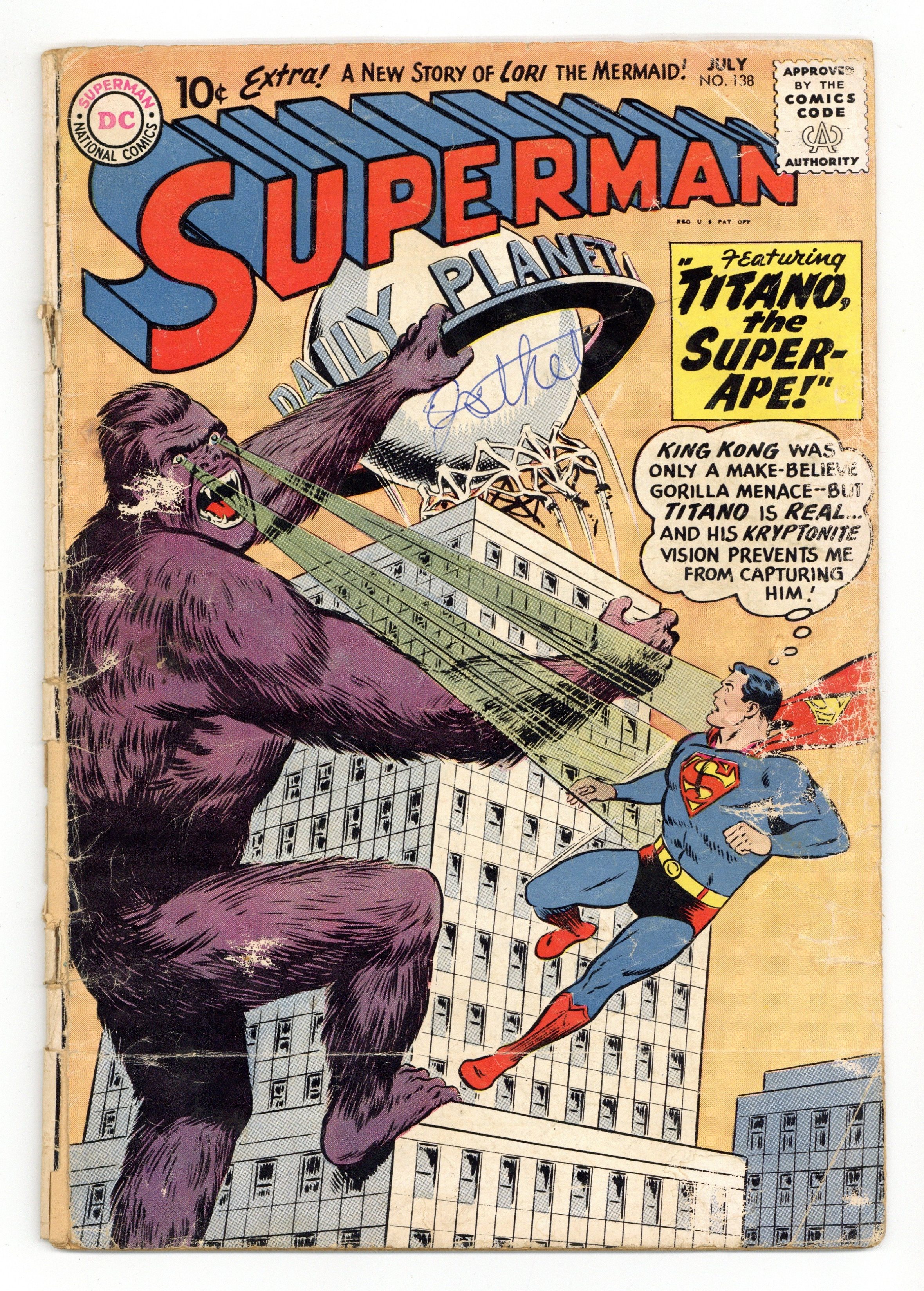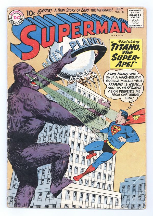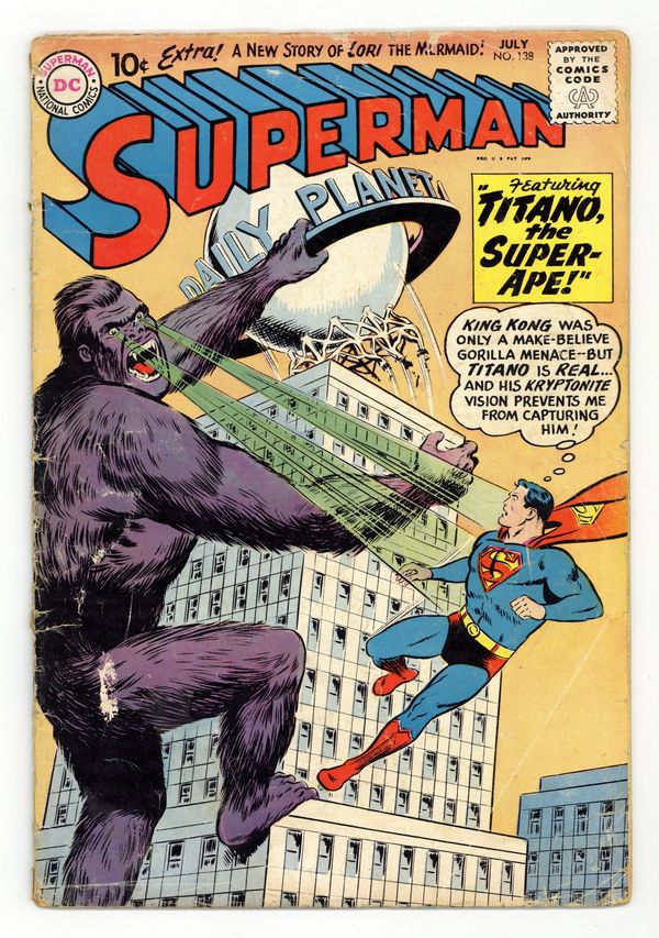 Cover pencils by Curt Swan, inks by Stan Kaye. Titano the Super-Ape!, script by Otto Binder, pencils by Wayne Boring, inks by Stan Kaye; While testing an alien artifact, Superman accidentally transports Titano from the prehistoric past to the current day. Superman's Black Magic, script by Jerry Siegel, art by Al Plastino; While attending a costume party dressed as the devil, Superman sees two crooks he has been looking for. The Mermaid From Atlantis, script by Jerry Siegel, pencils by Wayne Boring, inks by Stan Kaye; Lori tries to get Superman to propose to Lois by using her telepathy. 36 Pages, Full Color. Cover price $0.10.