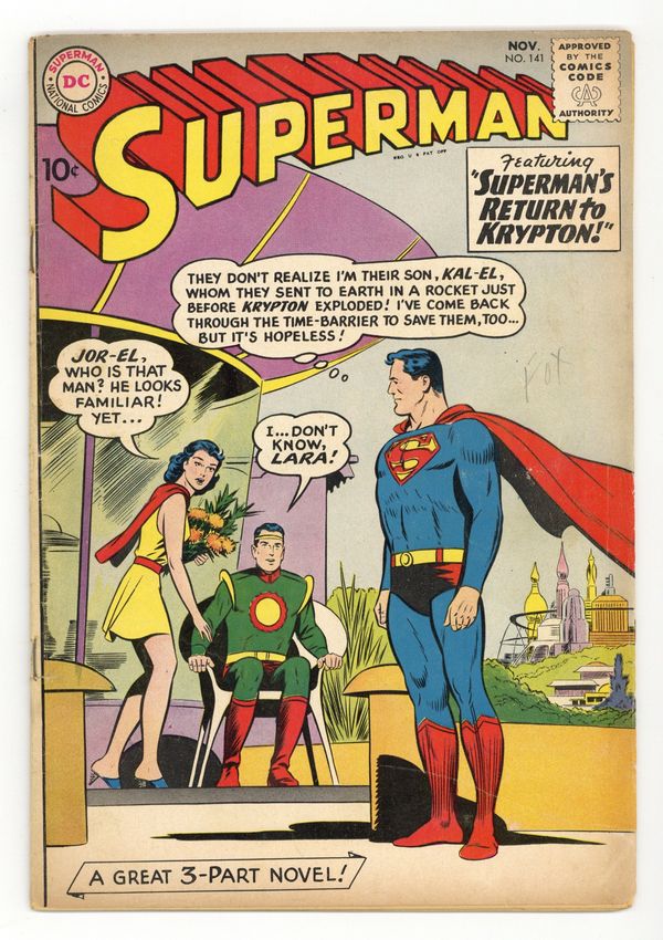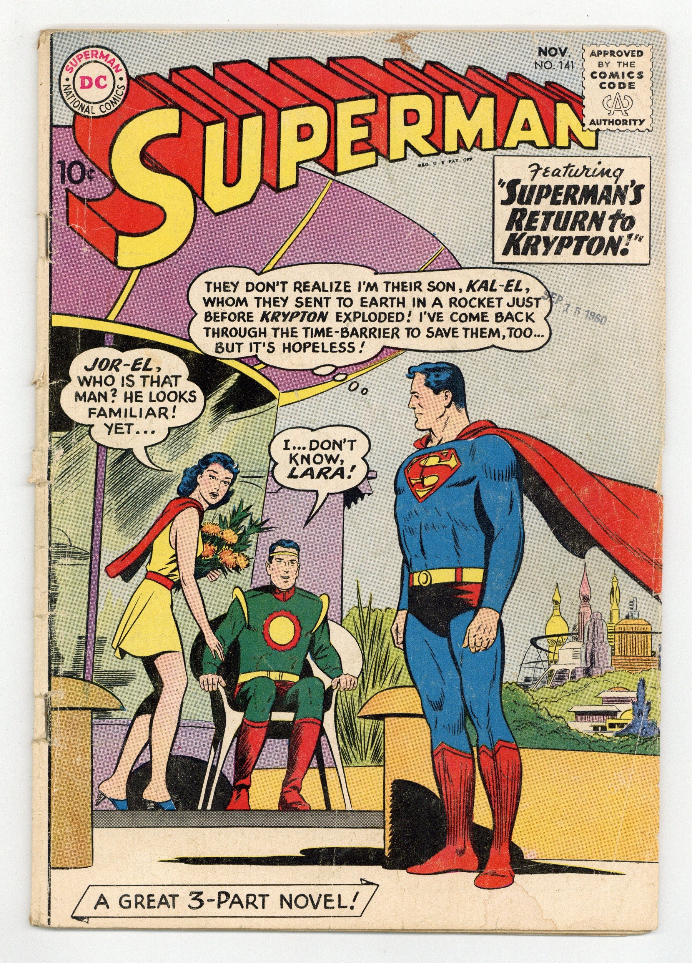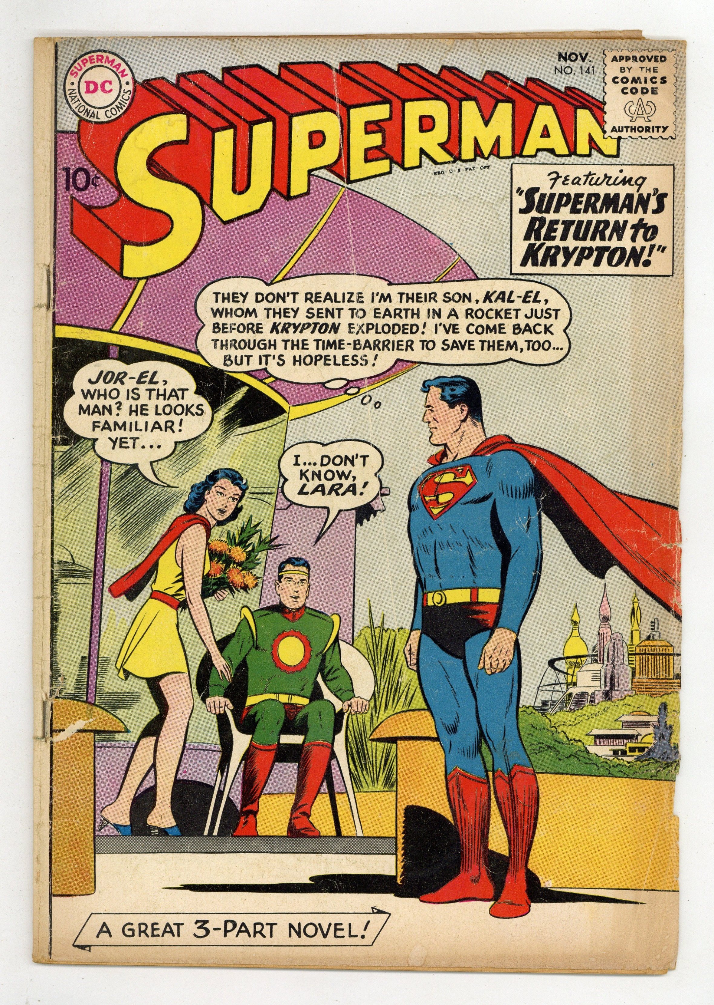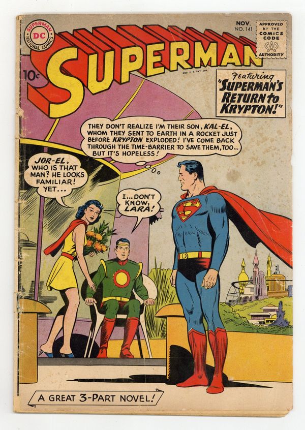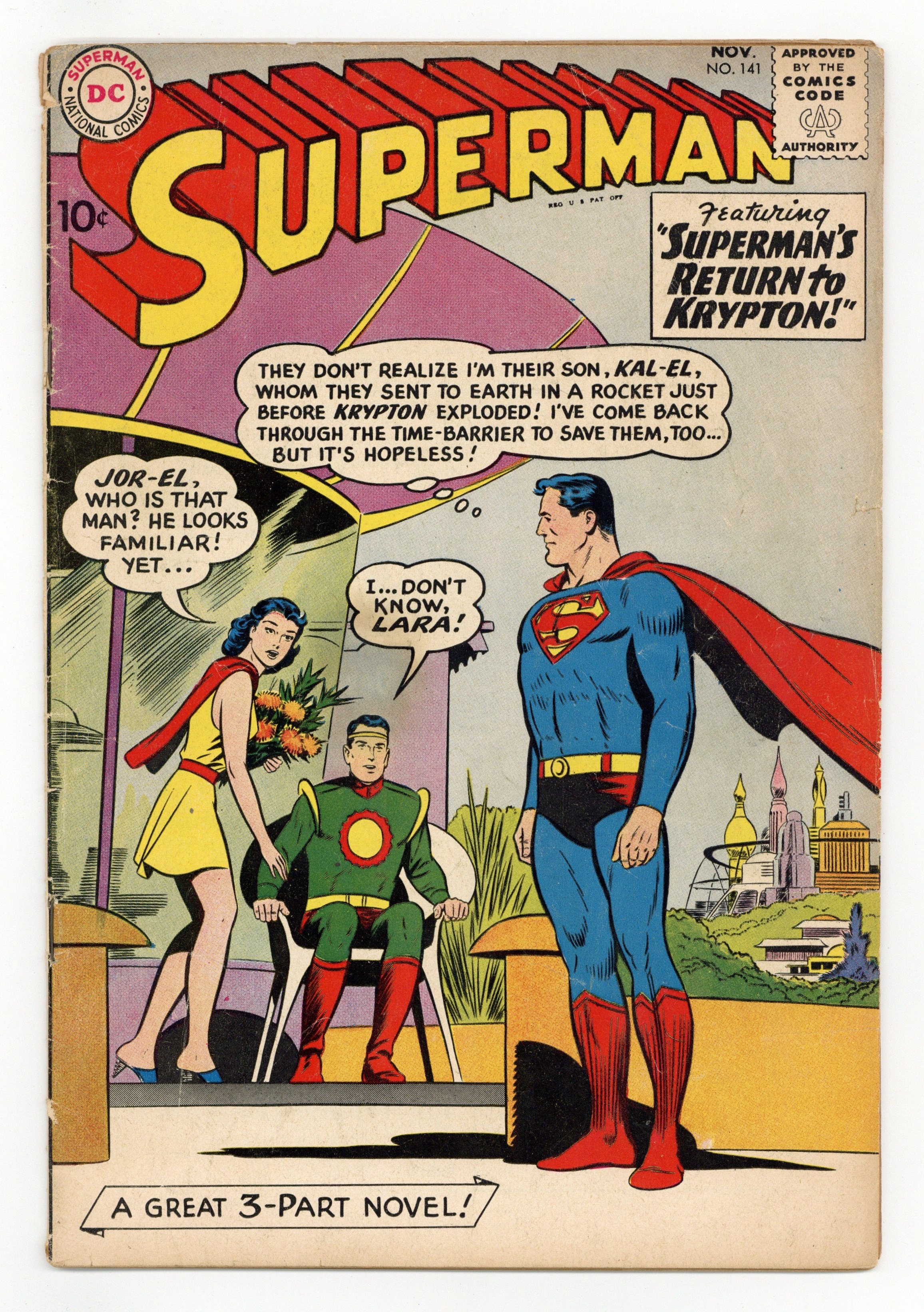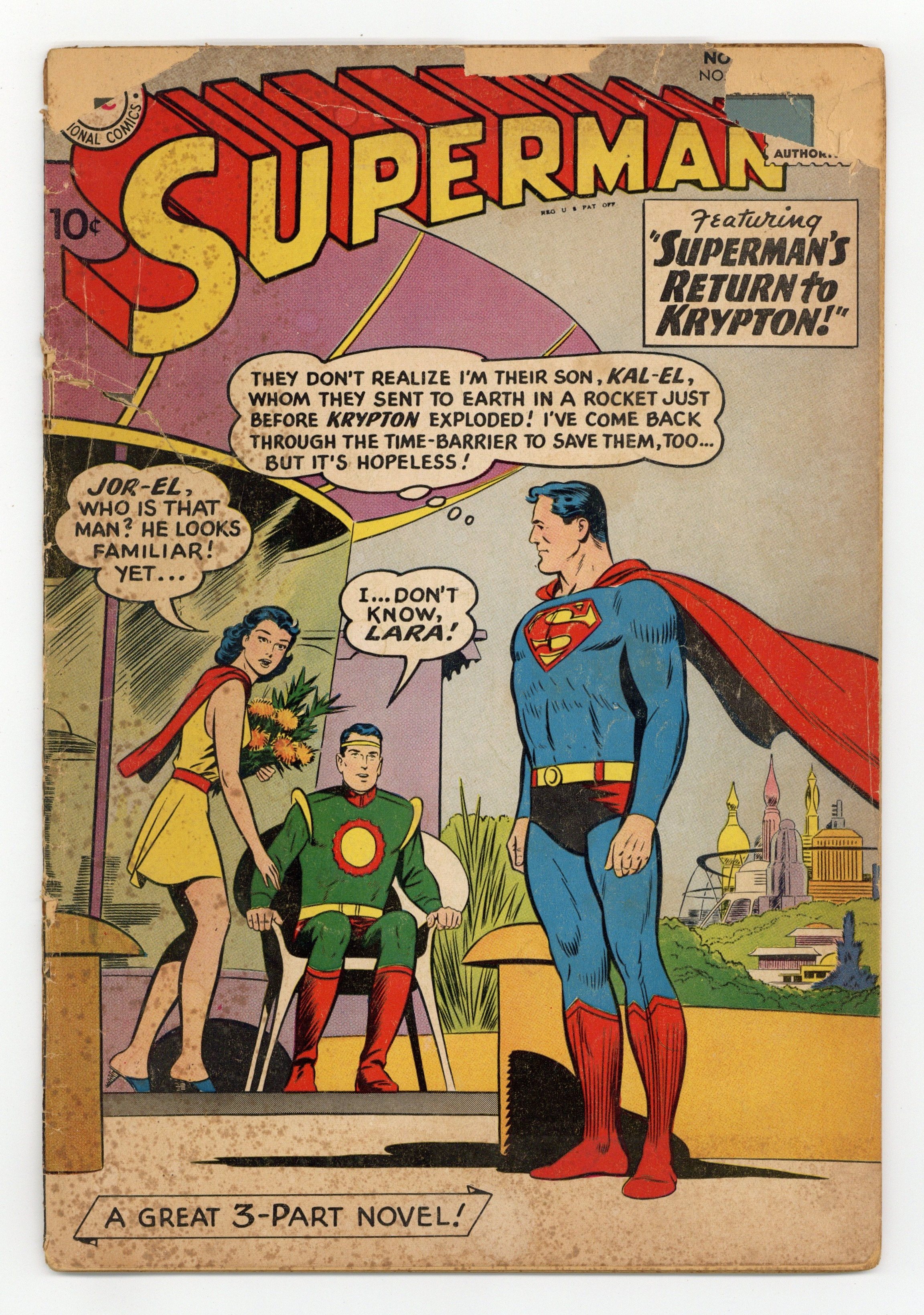 Cover pencils by Curt Swan, inks by Stan Kaye. Superman Meets Jor-El and Lara Again [Superman's Return to Krypton! part 1], script by Jerry Siegel, pencils by Wayne Boring, inks by Stan Kaye; Superman accidentally travels through time and across space to Krypton, where he meets actress Lyla Lerrol and his parents. Superman's Kryptonian Romance [Superman's Return to Krypton! part 2]; Superman romances Lyla and witnesses Jonathan Kent's proposal to Martha, while Brainiac shrinks and steals Kandor. The Surprise of Fate! [Superman's Return to Krypton! part 3]; Superman accidentally escapes Krypton, leaving behind Lyla. 36 Pages, Full Color. Cover price $0.10.