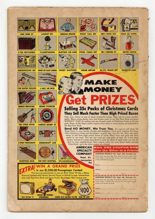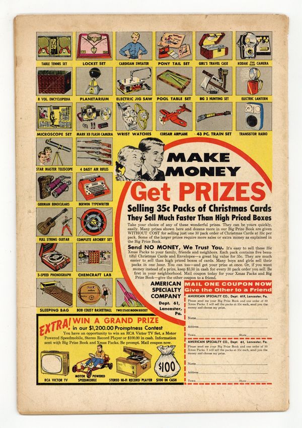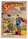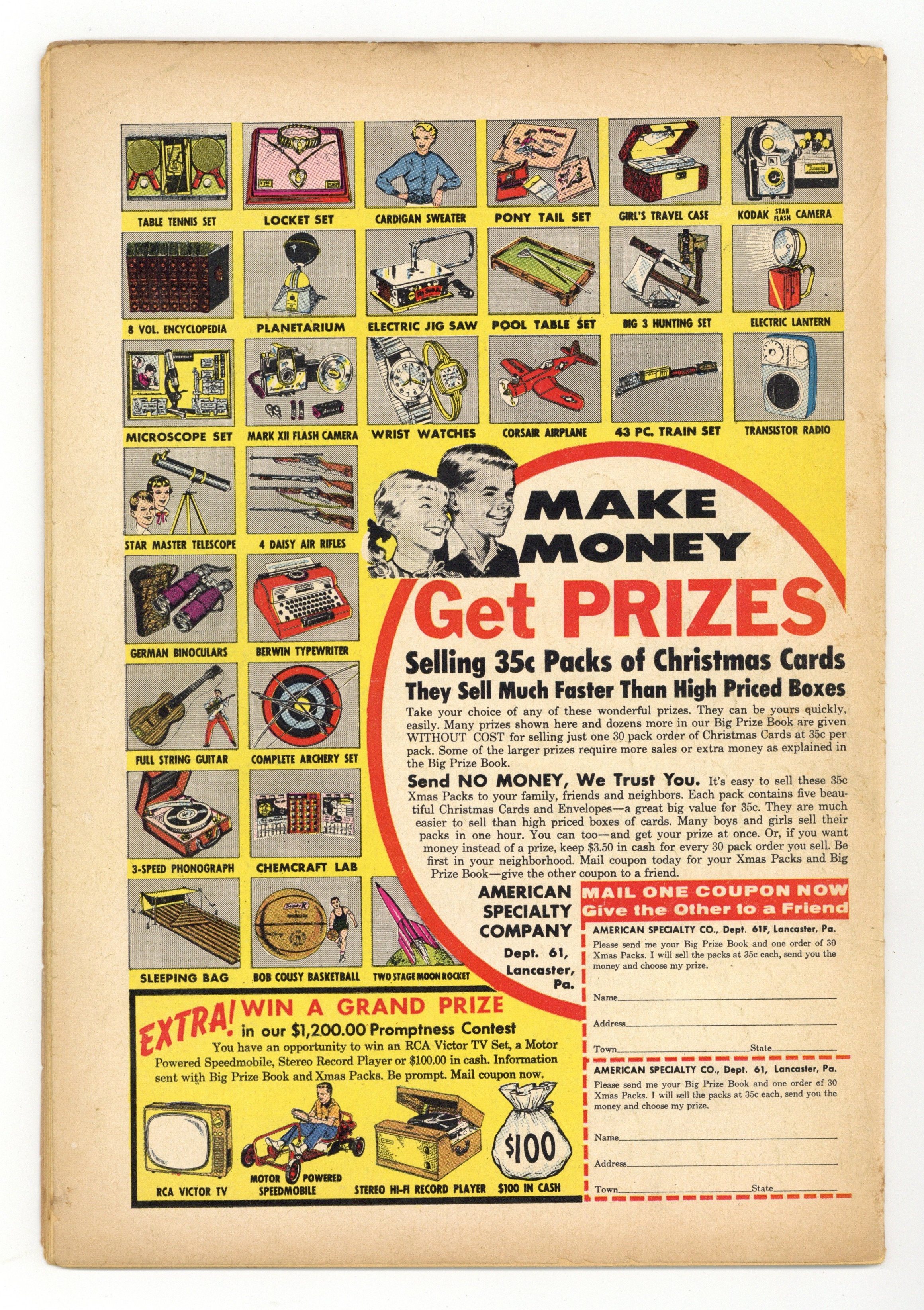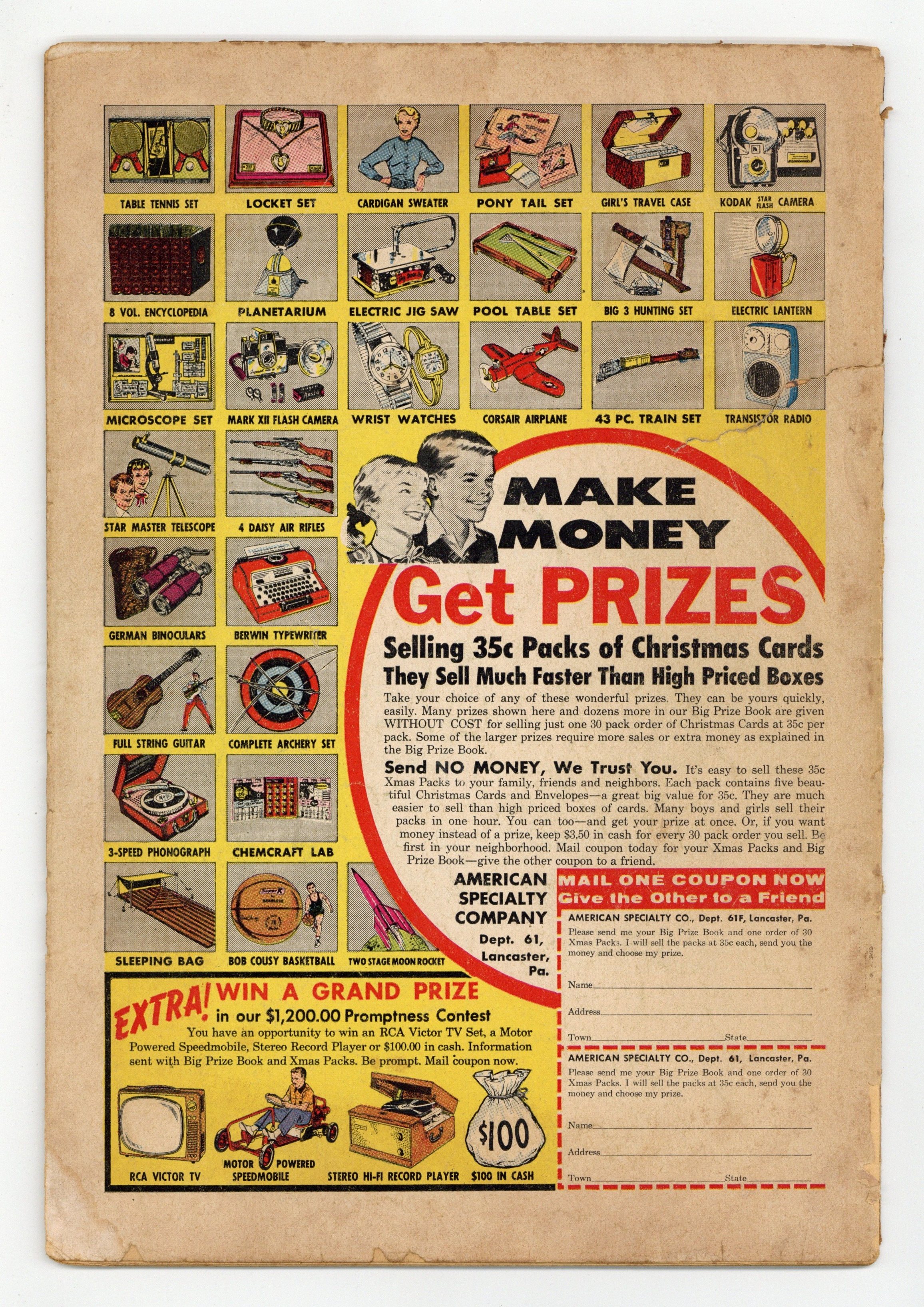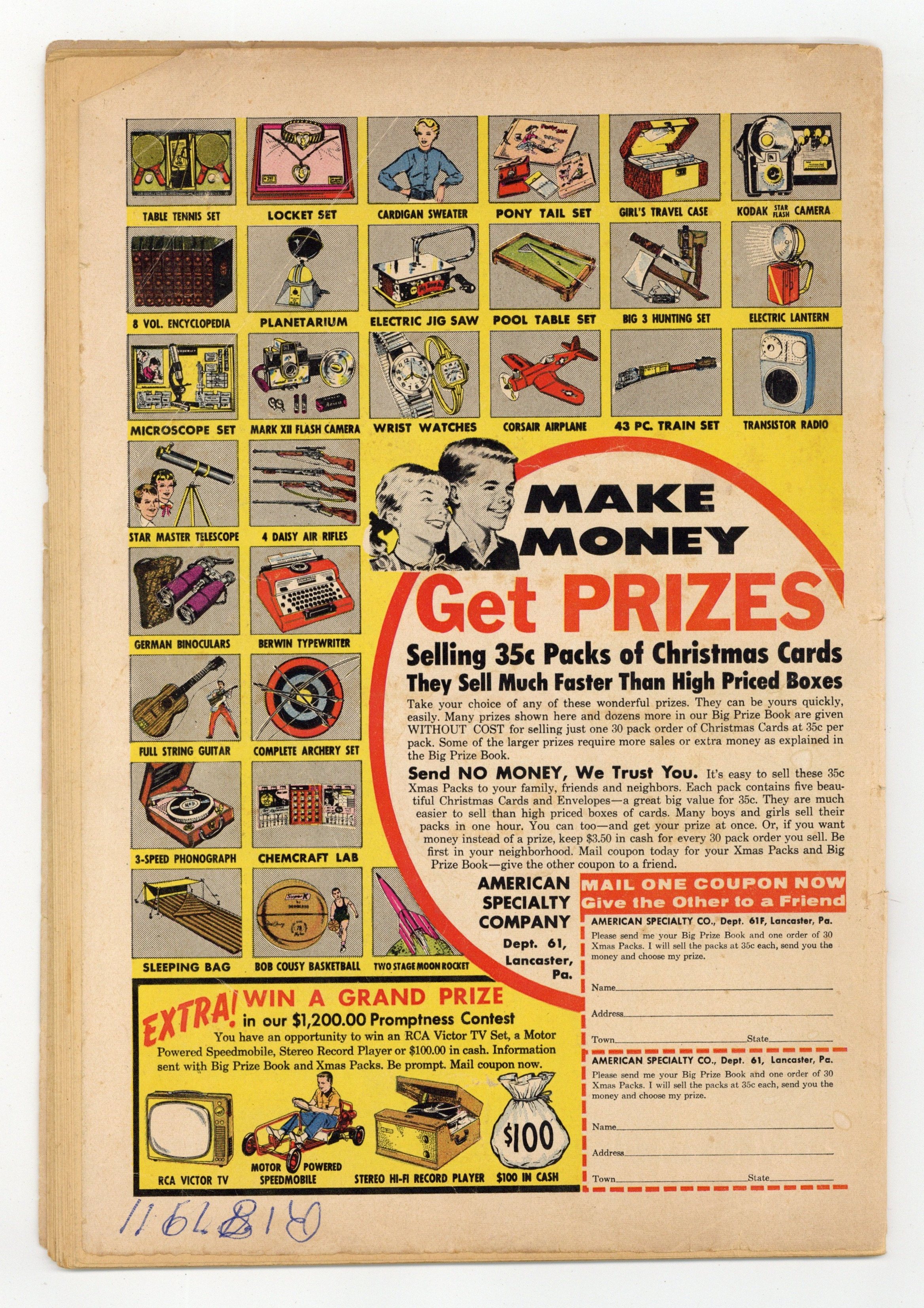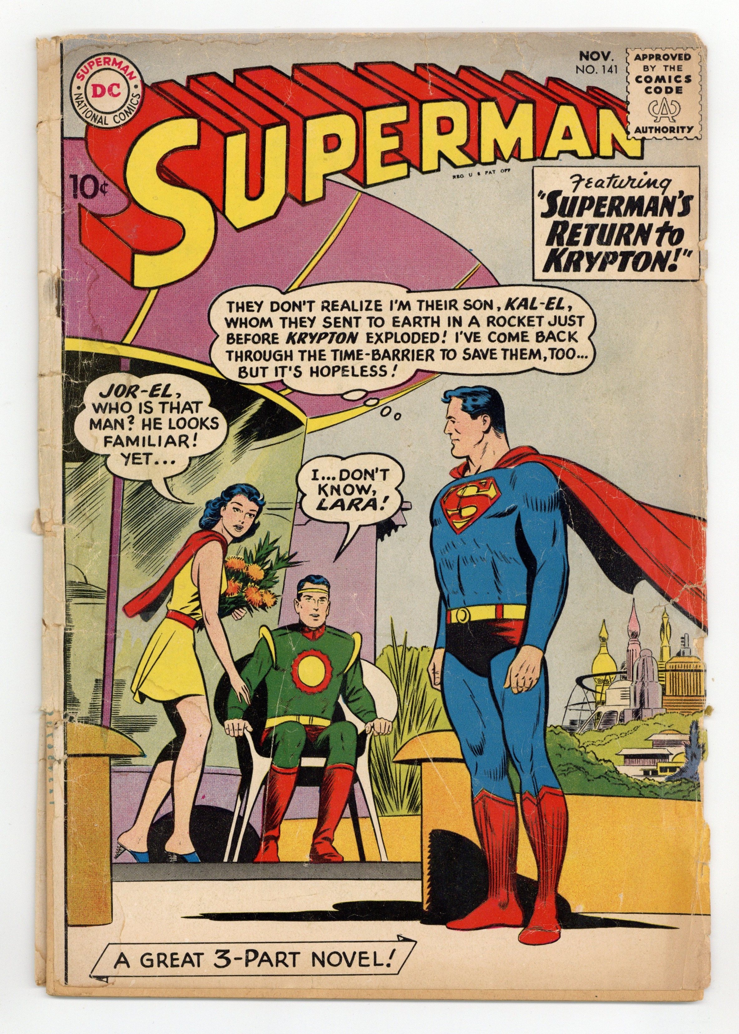 Cover pencils by Curt Swan, inks by Stan Kaye. Superman Meets Jor-El and Lara Again [Superman's Return to Krypton! part 1], script by Jerry Siegel, pencils by Wayne Boring, inks by Stan Kaye; Superman accidentally travels through time and across space to Krypton, where he meets actress Lyla Lerrol and his parents. Superman's Kryptonian Romance [Superman's Return to Krypton! part 2]; Superman romances Lyla and witnesses Jonathan Kent's proposal to Martha, while Brainiac shrinks and steals Kandor. The Surprise of Fate! [Superman's Return to Krypton! part 3]; Superman accidentally escapes Krypton, leaving behind Lyla. 36 Pages, Full Color. Cover price $0.10.