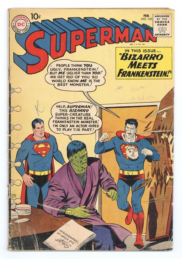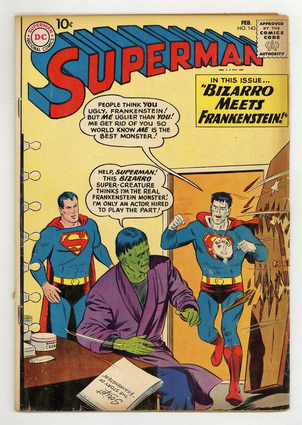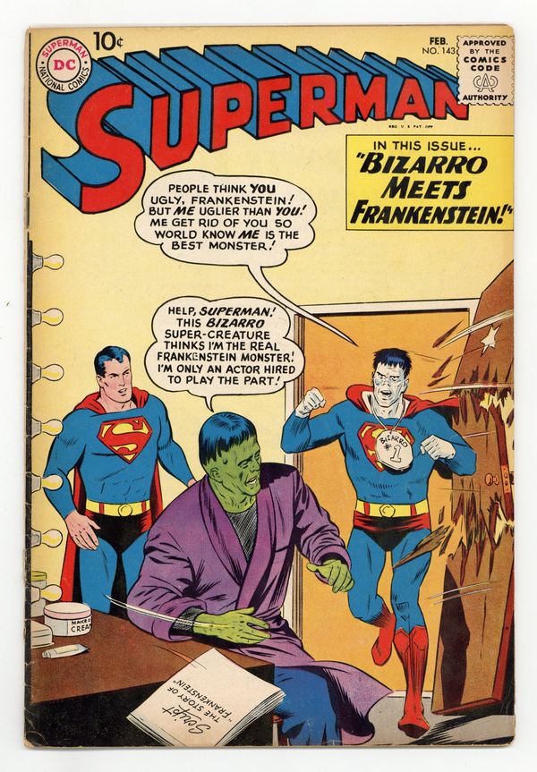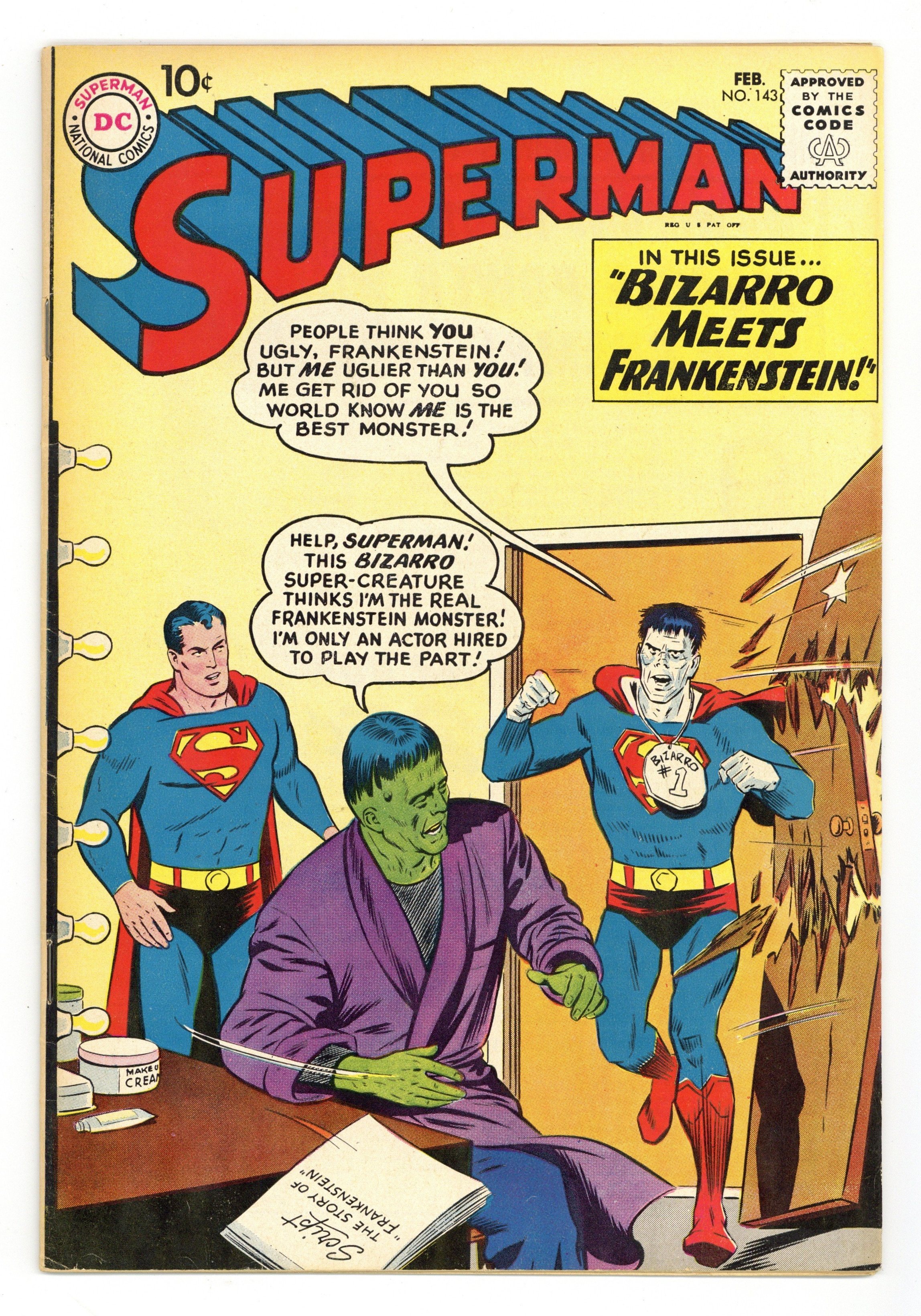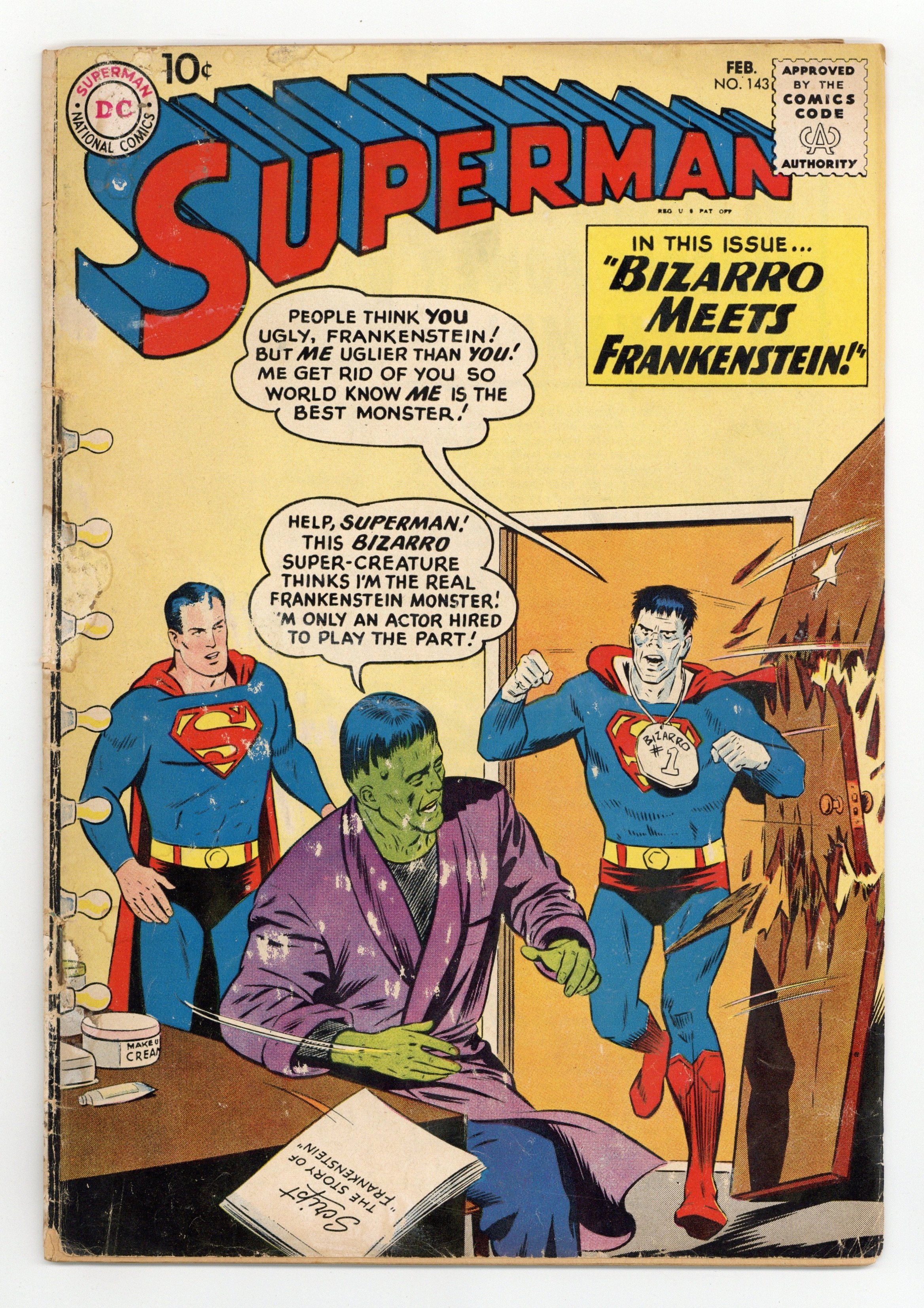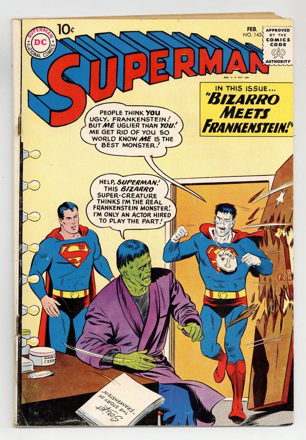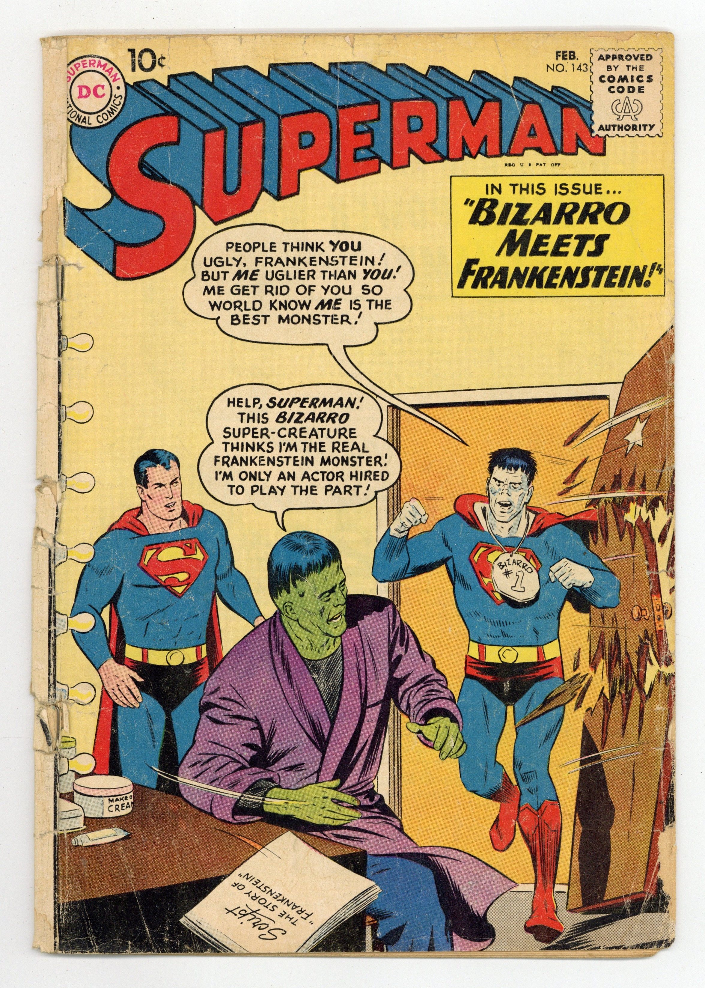 Cover pencils by Curt Swan, inks by Stan Kaye. The Great Superman Hoax!, pencils by Wayne Boring, inks by Stan Kaye; Professor Juris pretends that he is secretly Superman to attempt to steal some Red Kryptonite from Perry White. Lois Lane's Lucky Day!, art by John Forte; Perry White sends Clark and Lois to a carnival to determine if the games are rigged. Bizarro Meets Frankenstein!, script by Otto Binder, pencils by Wayne Boring, inks by Stan Kaye; After seeing an Earth program claiming that Frankenstein was the scariest monster, Bizarro #1 travels to Earth to prove that he is scarier than Frankenstein. 36 Pages, Full Color. Cover price $0.10.