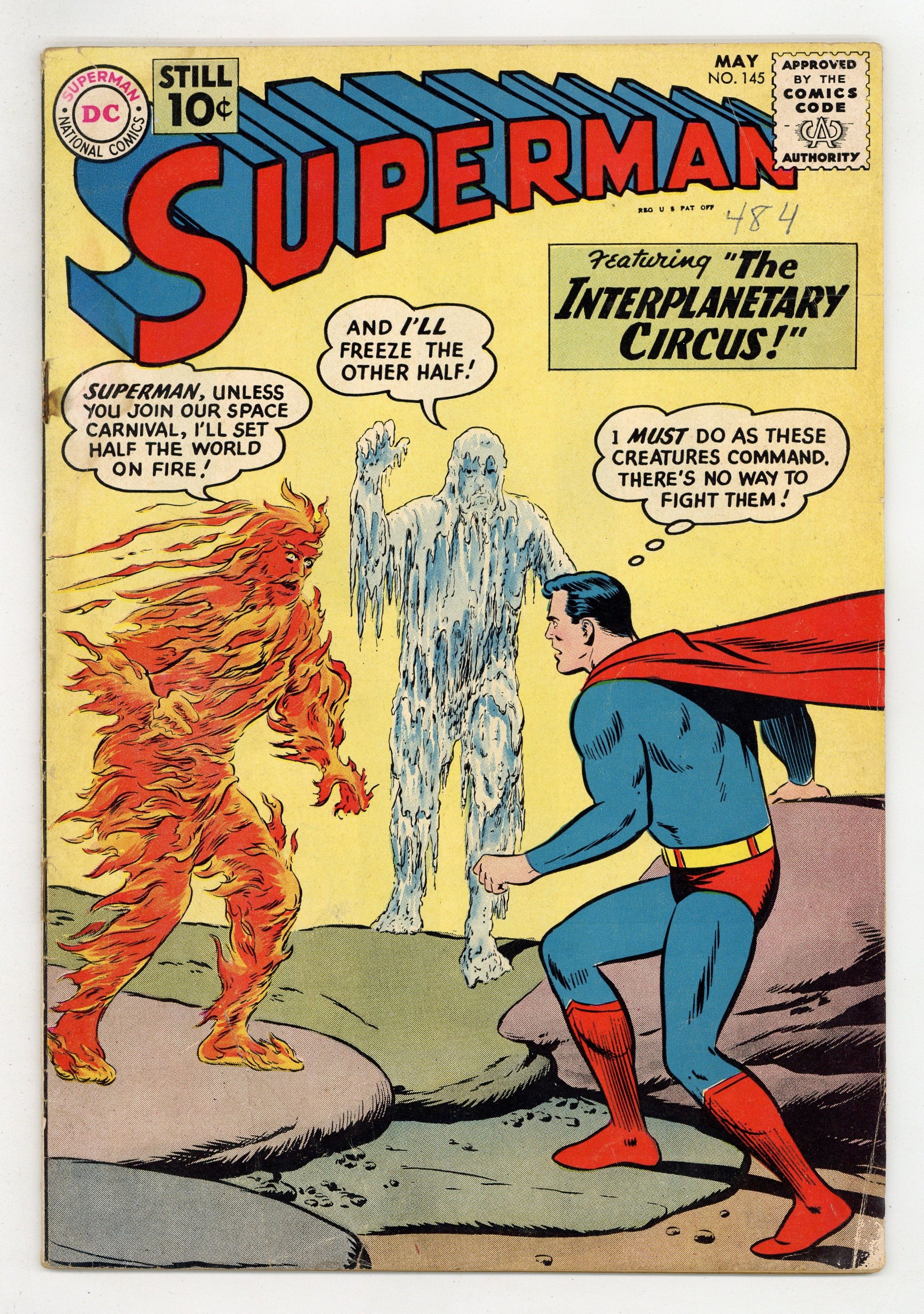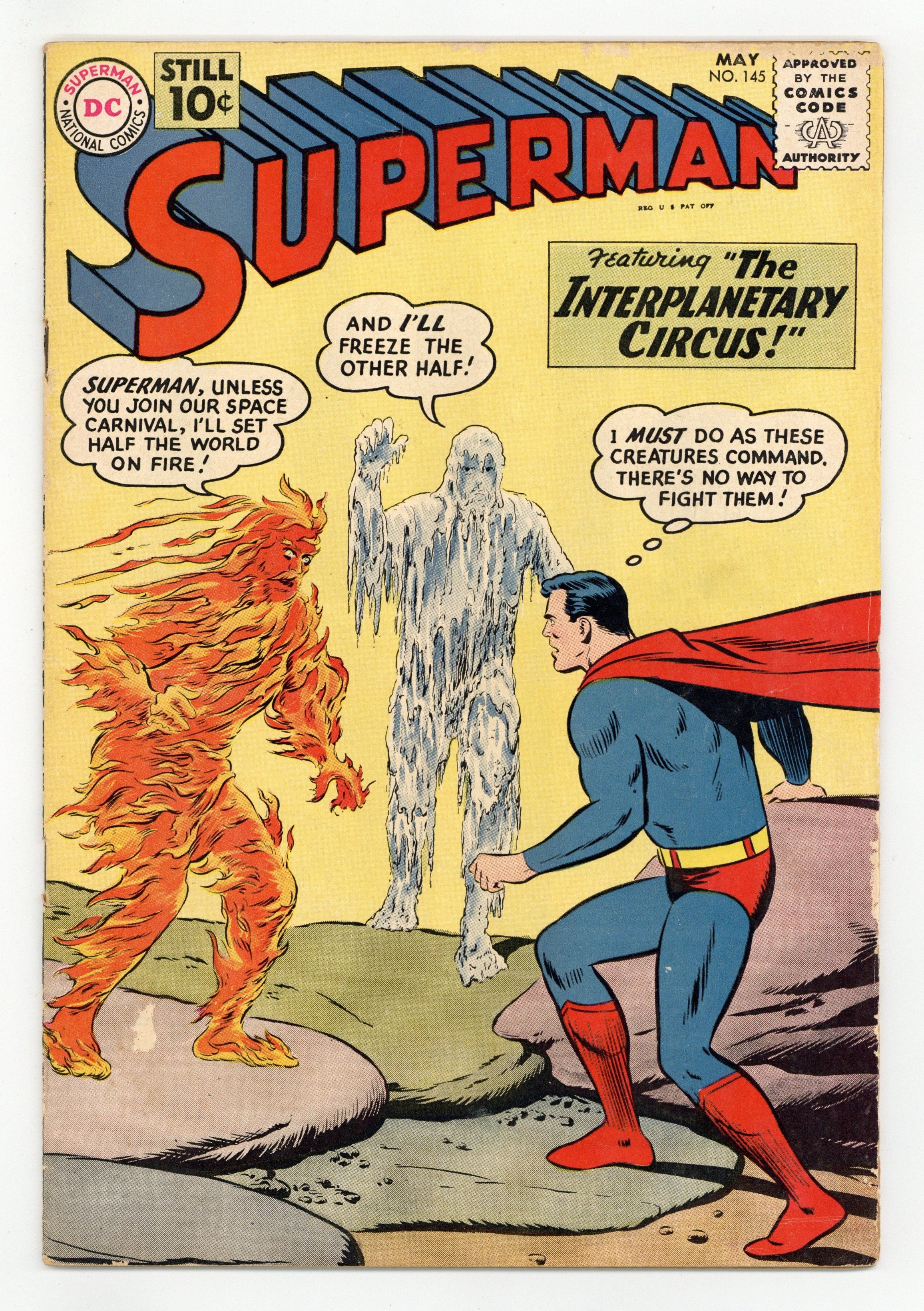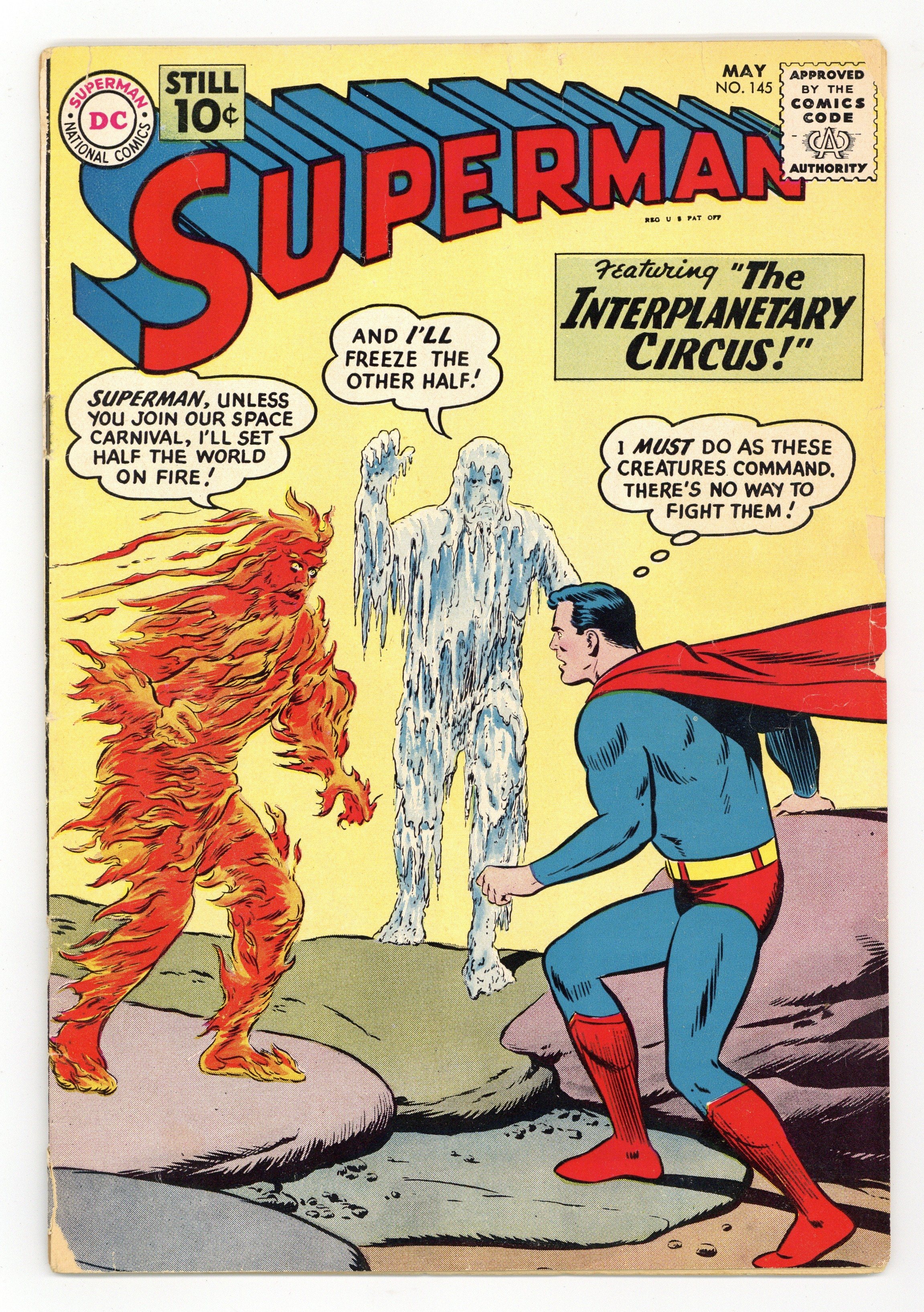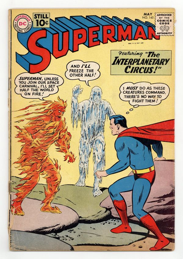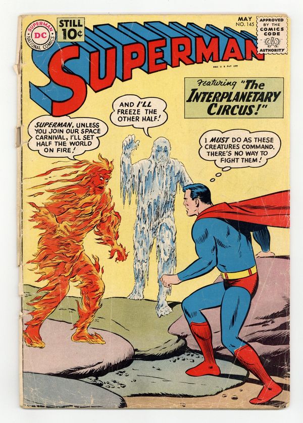 Cover pencils by Curt Swan, inks by Stan Kaye. The Secret Identity of Superman!, pencils by Curt Swan, inks by Stan Kaye; Lois thinks that Superman won't marry her because she can't keep his secret identity a secret. The Interplanetary Circus!, script by Robert Bernstein, art by Al Plastino; An Interplanetary Circus shows up in Metropolis and tries to force Superman to join their travelling circus. The Night of March 31st!, script by Jerry Siegel, pencils by Curt Swan, inks by Sheldon Moldoff; Everything in Superman's life suddenly changes; Lori Lemaris is no longer a mermaid; Supergirl reveals herself to the world; Perry White has become a Bizarro. 36 Pages, Full Color. Cover price $0.10.