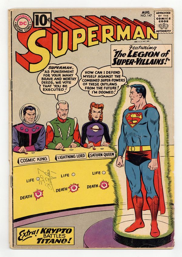 Ends Jan 26 9:37 PM CST Bid History 4 bids Current Bid $26 Your Secret Max Bid If you'd like to bid, please log in or register. 7th appearance of of the Legion of Super-Heroes and 1st appearances of the Legion of Super-Villains and the Adult Legion. Cover pencils by Curt Swan, inks by Sheldon Moldoff. The Great Mento!, art by Al Plastino; Perry White fakes ESP powers as The Great Mento (with Superman's help) to capture wanted criminals. Krypto Battles Titano!, art by Al Plastino; Krypto travels into the prehistoric past to meet Titano. The Legion of Super-Villains!, script by Jerry Siegel, pencils by Curt Swan, inks by Sheldon Moldoff; Luthor contacts and teams up with Legion of Super-Villains from 30th Century; adult Legion of Super-Heroes comes to 20th Century to help Superman. 36 Pages, Full Color. Cover price $0.10.