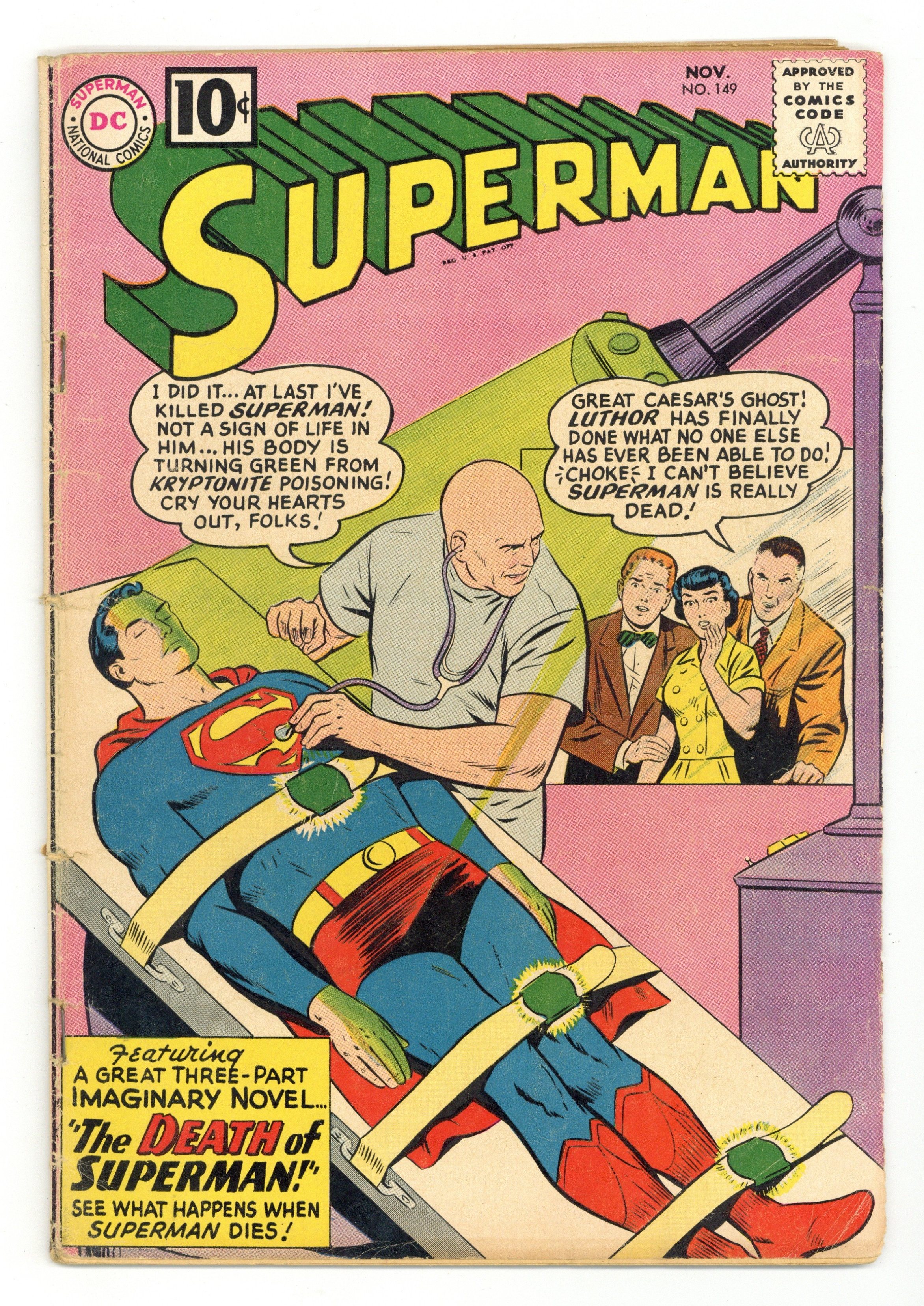 Last 10c cover-priced issue. Cover pencils by Curt Swan, inks by Stan Kaye. Lex Luthor, Hero! [The Death of Superman! part 1], script by Jerry Siegel, pencils by Curt Swan, inks by Sheldon Moldoff; Lex Luthor discovers a cure for cancer and with the help of Superman is paroled from prison. Luthor's Super-Bodyguard! [The Death of Superman! part 2]; Lex Luthor reveals that he was only pretending to be good and kills Superman. List of winners of 'The Great Superman Boo-Boo Contest' from Superman #145; Includes some panels and examples of the errors in that story; Winners got original Superman drawings; First place found 456 errors. The Death of Superman! [part 3]; Superman is buried, and Supergirl brings Lex Luthor to justice. 36 Pages, Full Color. Cover price $0.10.