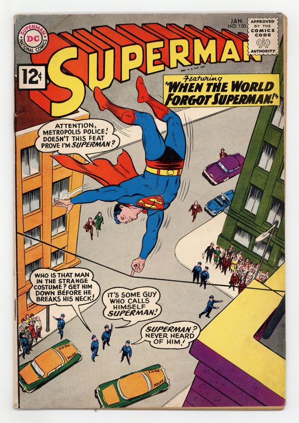 First 12-cent cover-price. Cover pencils by Curt Swan, inks by George Klein. The One Minute of Doom!, script by Jerry Siegel, art by Al Plastino; All the surviving beings of Krypton observe a moment of silence to remember the destruction of Krypton. The Duel Over Superman!, script by Robert Bernstein, art by Kurt Schaffenberger; Lana and Lois try to force Superman to choose one of them by fighting a duel. When the World Forgot Superman!, script by Jerry Siegel, pencils by Curt Swan, inks by Wayne Boring; The whole world has forgotten about Superman because of Mxyzptlk's magic. 36 Pages, Full Color. Cover price $0.12.