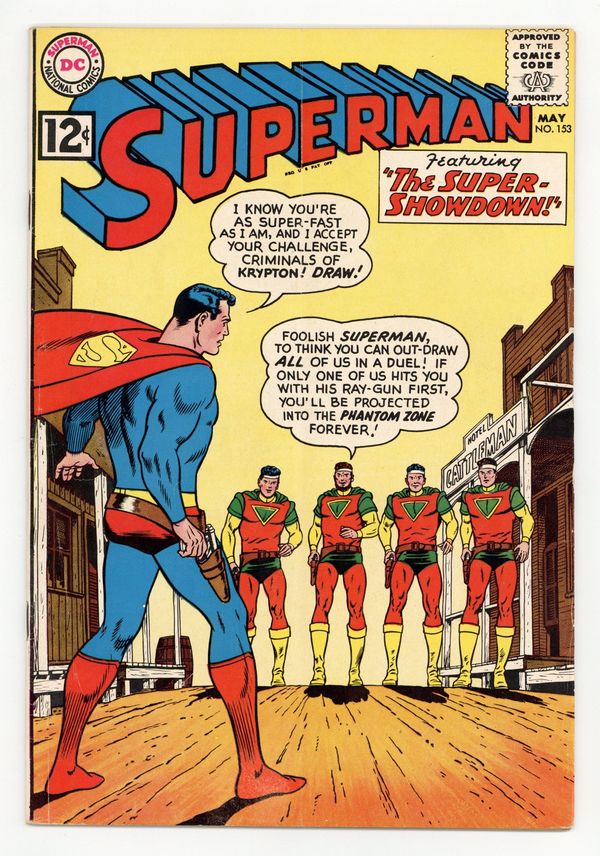 Tags: Superman$15.25Cover pencils by Curt Swan, inks by George Klein. The Day Superman Broke the Law!, art by Al Plastino; Councilman Finch has Superman arrested for tiny infractions of the law so he will be in jail and unable to prevent his theft from the bank. The Secret of the Superman Stamp!, pencils by Curt Swan, inks by George Klein; The city of Rangoon wants a photo of Superman for a new postage stamp. The Town of Supermen!, script by Jerry Siegel, art by John Forte; Lois Lane is invited to a ghost town by eight escaped Phantom Zone criminals in a plot to capture Superman. 36 Pages, Full Color. Cover price $0.12.