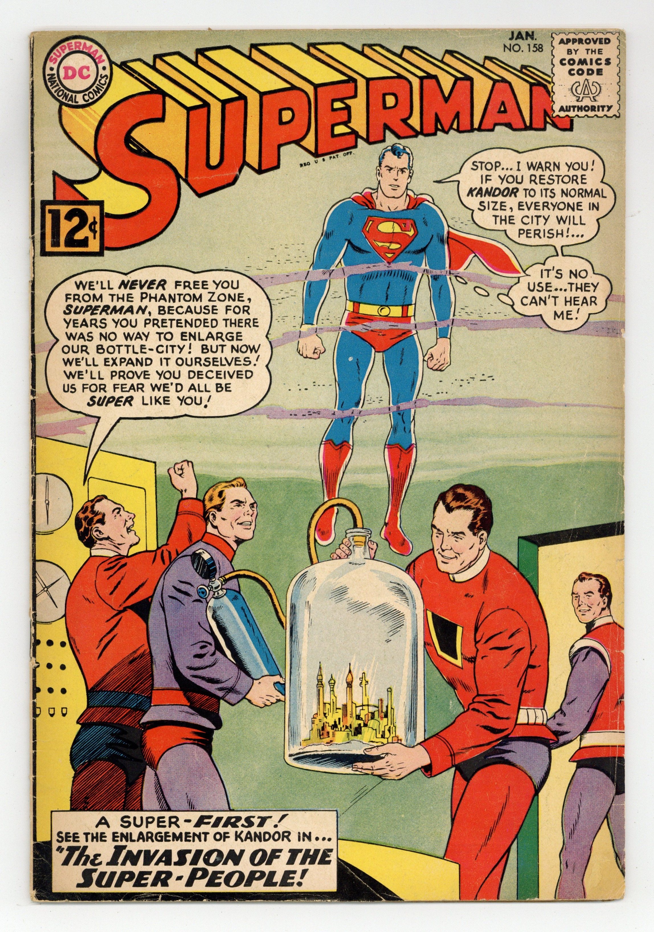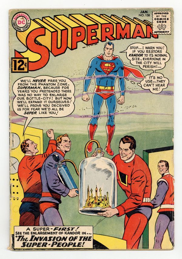 Cover pencils by Curt Swan, inks by George Klein. First appearance of Flamebird and Nightwing in a full-length story: Invasion of the Mystery Super-Men! [Superman in Kandor part 1], script by Edmond Hamilton, pencils by Curt Swan, inks by George Klein; Superman and Jimmy Olsen travel to Kandor to discover how normal sized Kandorians are on Earth and why they are attacking Superman. The Dynamic Duo of Kandor! [Superman in Kandor part 2]; Superman and Jimmy Olsen take the secret identites of Nightwing and Flamebird so they can track down Than-Ol's raiders and stop his scheme to enlarge Kandor. The City of Super-People! [Superman in Kandor part 3]. 36 Pages, Full Color. Cover price $0.12.