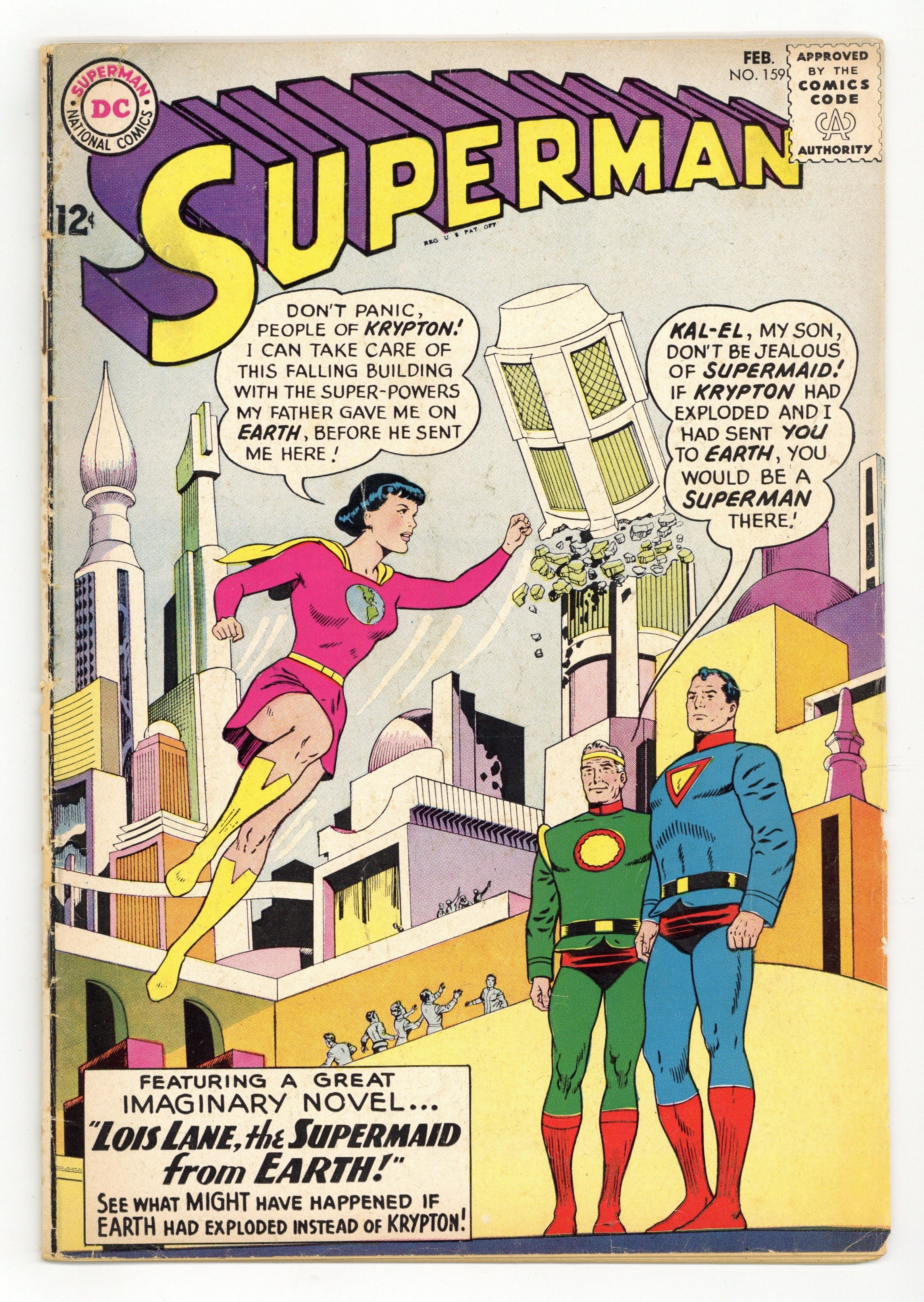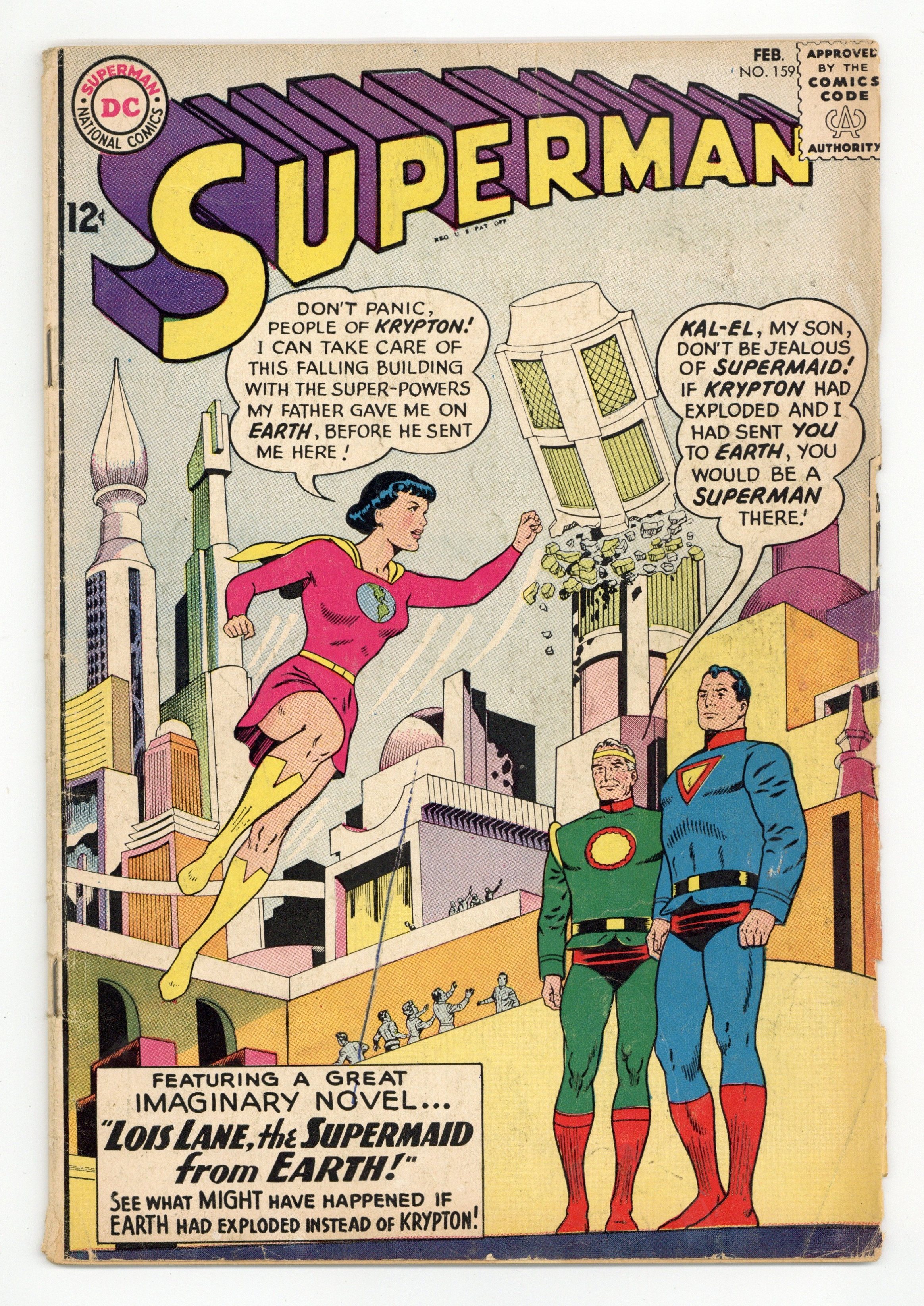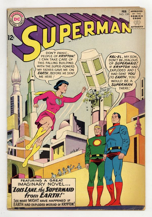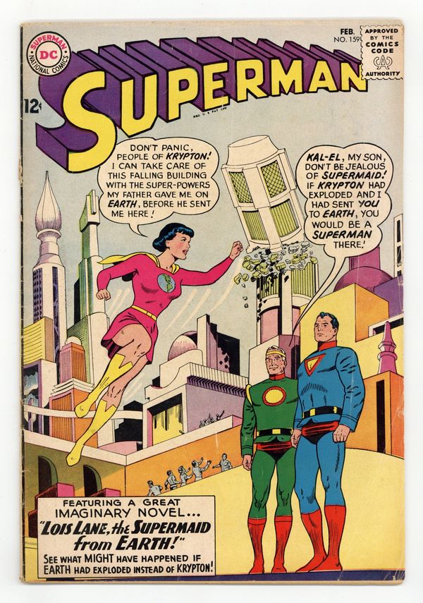 Cover pencils by Curt Swan, inks by George Klein. Another great Imaginary Novel is featured in this issue: Lois Lane's Flight from Earth! [Lois Lane, the Super-Maid of Krypton! part 1], pencils by Curt Swan, inks by George Klein; Lois Lane goes to Krypton as a child and becomes Supermaid. The Female Luthor of Krypton! [Lois Lane, the Super-Maid of Krypton! part 2]. The Doom of Supermaid! [Lois Lane, the Super-Maid of Krypton! part 3]; Kal-El gains her powers and becomes Superman. The letters page contains a statement of ownership--average paid circulation, 740,000 copies. 36 Pages, Full Color. Cover price $0.12.