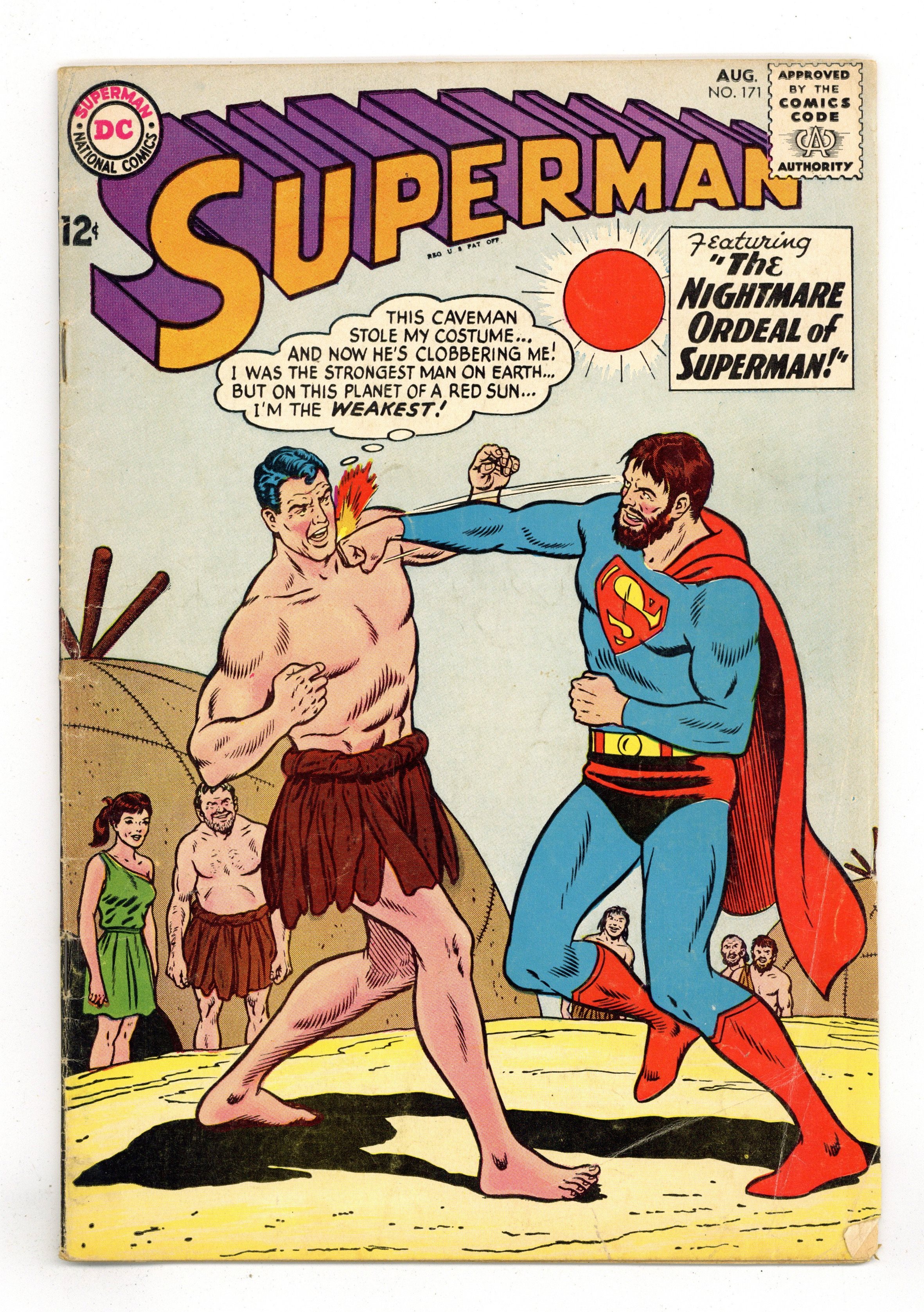 Cover pencils by Curt Swan, inks by George Klein. Superman's Sacrifice! starring Rokk, Sorban, Lana Lang, and Professor Potter, script by Leo Dorfman, art by Al Plastino; Superman matches wits with big-brained aliens. The Curse of Magic! starring Superman and Mr. Mxyzptlk, script by Jerry Siegel, pencils by Curt Swan, inks George Klein; Mr. Mxyzptlk mucks things up with magic. The Nightmare Ordeal of Superman, script by Edmond Hamilton, art by Al Plastino; a weakened Superman battles a caveman on a world with a red sun. 36 Pages, Full Color. Cover price $0.12.