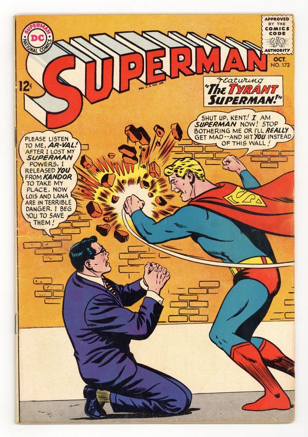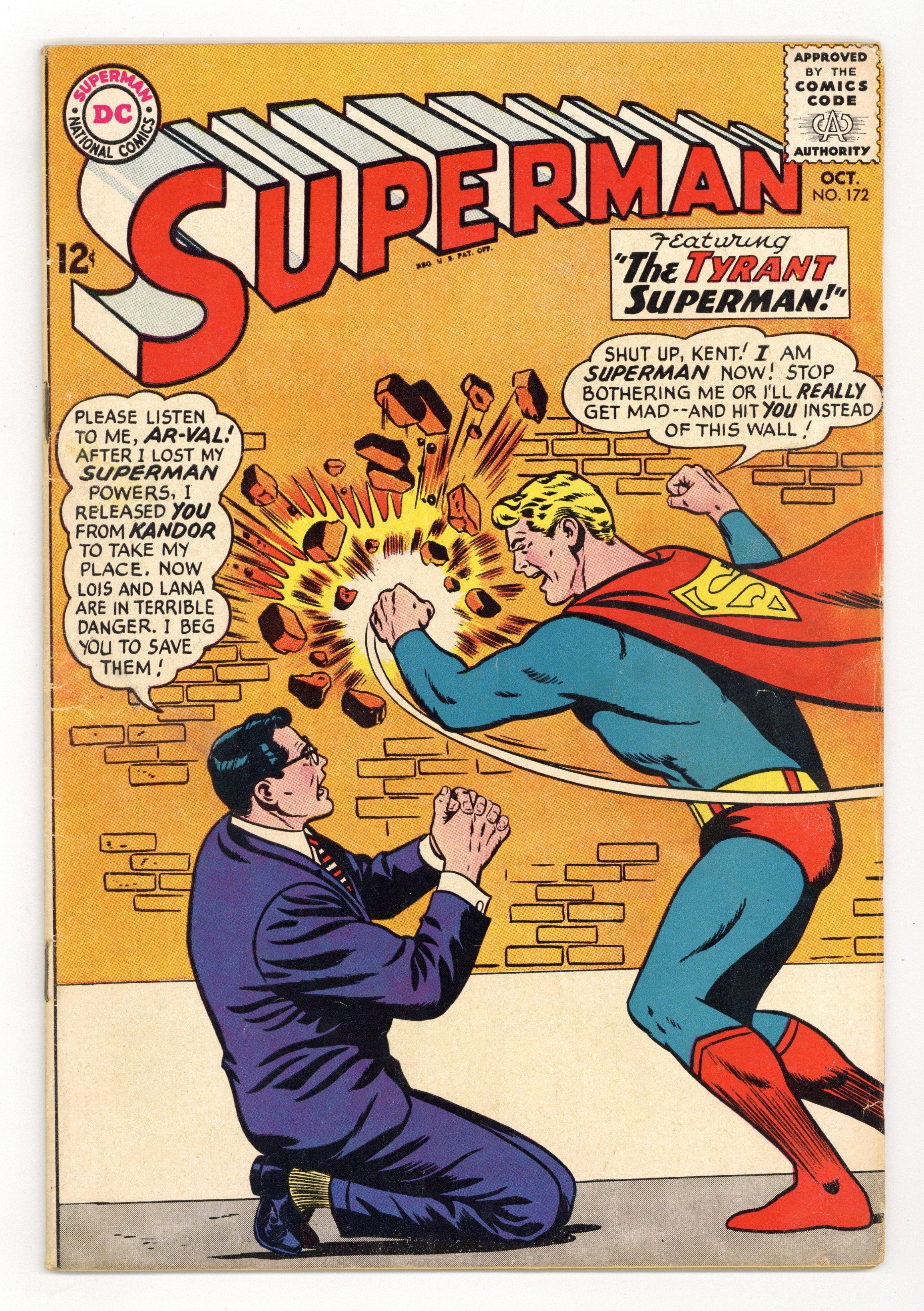 Cover pencils by Curt Swan, inks by George Klein. The New Superman! [part 1], script by Edmond Hamilton, pencils by Curt Swan, inks by George Klein. Clark Kent--Former Superman! [part 2], script by Edmond Hamilton, pencils by Curt Swan, inks by Sheldon Moldoff. The Struggle of the Two Supermen! [part 3], script by Ed Hamilton, pencils by Curt Swan, inks by George Klein. In this three-part story, Superman releases Ar-Val from Kandor so he can replace The Man of Steel. Rocky and Bullwinkle star in a one-page Cheerios ad. 36 Pages, Full Color. Cover price $0.12.