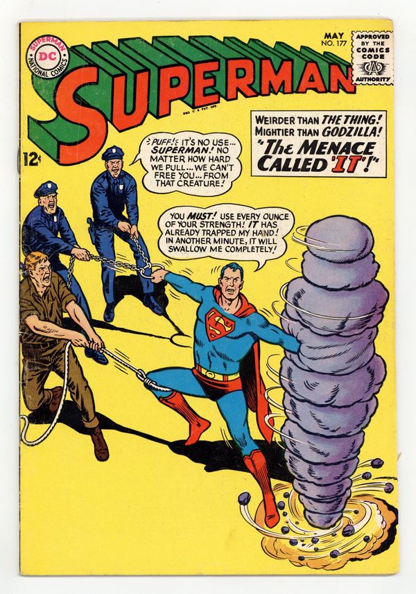 Cover pencils by Curt Swan, inks by George Klein. Superman's Kryptonese Curse! [Tales of Kryptonite No. 3], script by Otto Binder, pencils by Curt Swan, inks by George Klein; red Kryptonite, as usual, has an unpredictable effect on the Man of Steel. The Menace Called "It"! starring Superman, It [a spinning blob], Lana Lang, Perry White, and Lois Lane, script by Leo Dorfman, pencils by Curt Swan, inks by George Klein. When Jimmy Olsen Stole Krypto From Superman, art by George Papp. Casey the Cop humor page by Henry Boltinoff. Letter from Stephen King (could it be THE Stephen King?). Rocky and Bullwinkle star in a one-page Cheerios ad. 36 Pages, Full Color. Cover price $0.12.