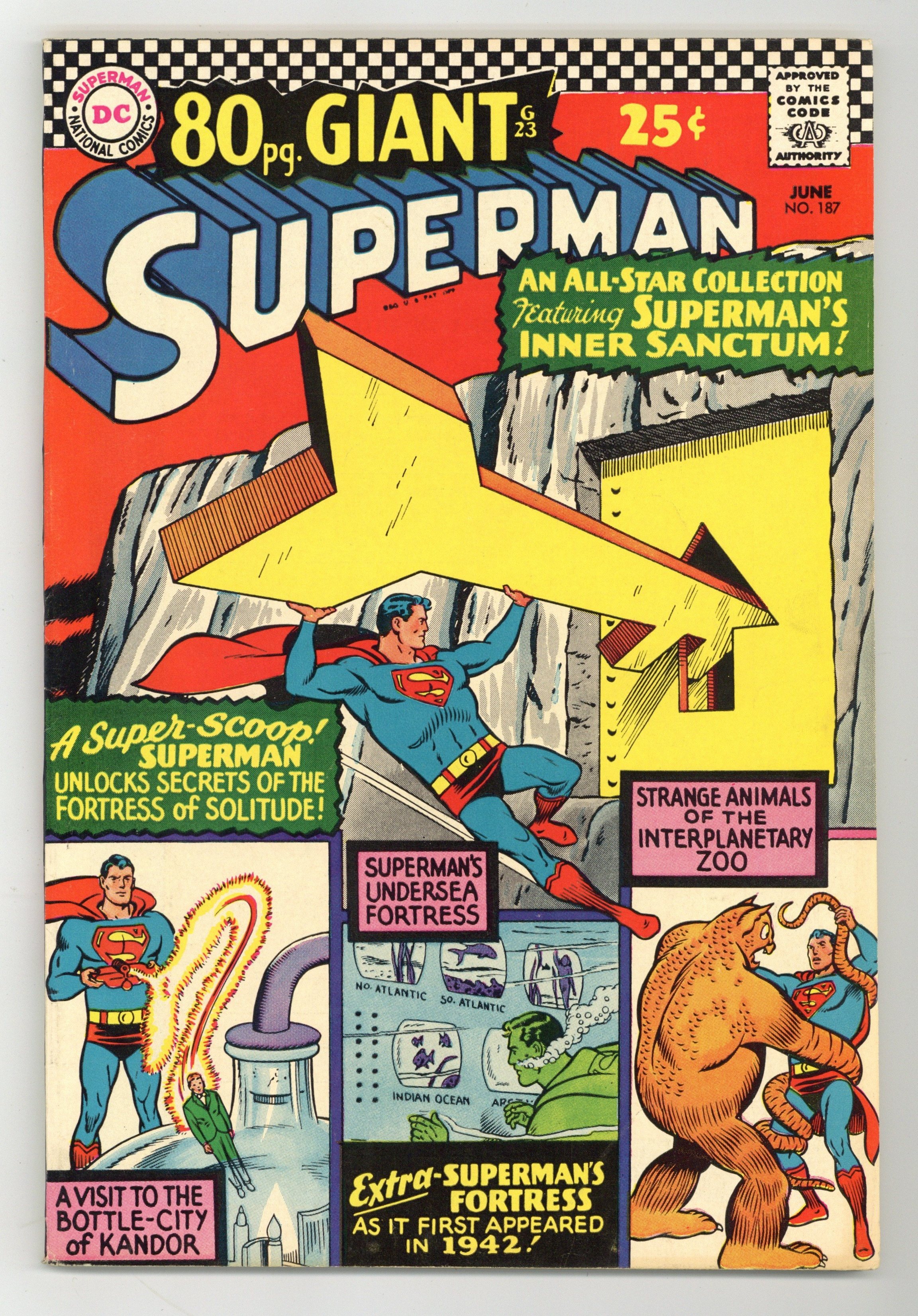 Cover pencils by Curt Swan, inks by George Klein. DC Giant with reprinted stories: Superman's Fortresses of Solitude!, script by Jerry Siegel, pencils by Wayne Boring, inks by Stan Kaye. The Boy in the Bottle! starring Superman and Jimmy Olsen, script by Jerry Siegel, pencils by Curt Swan, inks by Stan Kaye. Tales of the Imitation Fortresses by E. Nelson Bridwell; history of "other" Fortresses of Solitude. Superman's Hall of Trophies!, script by Bill Woolfolk, pencils by Wayne Boring, inks by Stan Kaye. A Look at Superman's First Fortress from the 1942 Story "Muscles for Sale!", script by Jerry Siegel, art by John Sikela. Three Nights in the Fortress of Solitude!, script by Otto Binder, art by Kurt Schaffenberger; Lois spends three nights in the Fortress of Solitude. The Super-Merman of the Sea, script by Otto Binder, pencils by Curt Swan, inks by Stan Kaye; Superman pretends to join forces with underwater-dwelling aliens in order to trick them into believing Earth's seas are too salty for them. The Land of a Million Supermen, script by Jerry Coleman, pencils by Wayne Boring, inks by Stan Kaye. Rocky and Bullwinkle star in a one-page Cheerios ad. 84 Pages, Full Color. Cover price $0.25.