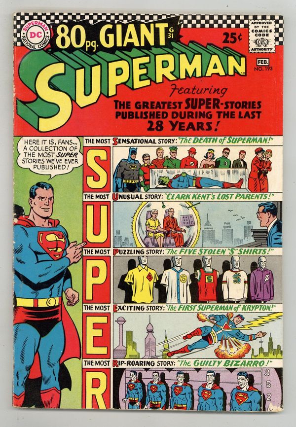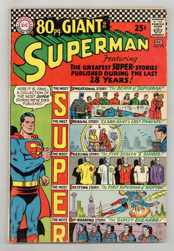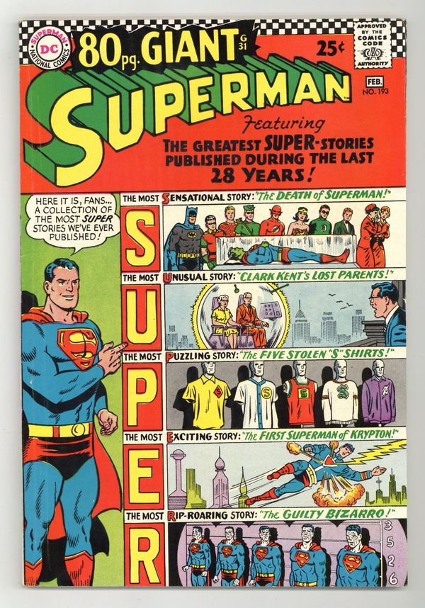 Cover pencils by Curt Swan, inks by George Klein. DC Giant with reprinted stories: Lex Luthor, Hero! [The Death of Superman! part 1], script by Jerry Siegel, pencils by Curt Swan, inks by Sheldon Moldoff; Lex Luthor discovers a cure for Cancer and with the help of Superman he is paroled from prison. Luthor's Super-Bodyguard! [The Death of Superman! part II]. The Death of Superman! [part III]. Superman's Lost Parents!, script by Otto Binder, art by Al Plastino; Ma and Pa Kent seemingly arrive in the present in a time bubble. The Stolen "S" Shirts, script by Bill Finger, art by Al Plastino. The First Superman of Krypton, script by Edmond Hamilton, pencils by Wayne Boring, inks by Stan Kaye. The Guilty Bizarro!, or, It's Nice To Be Wanted!, script by Jerry Siegel, art by John Forte. 84 Pages, Full Color. Cover price $0.25.