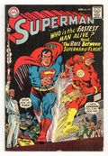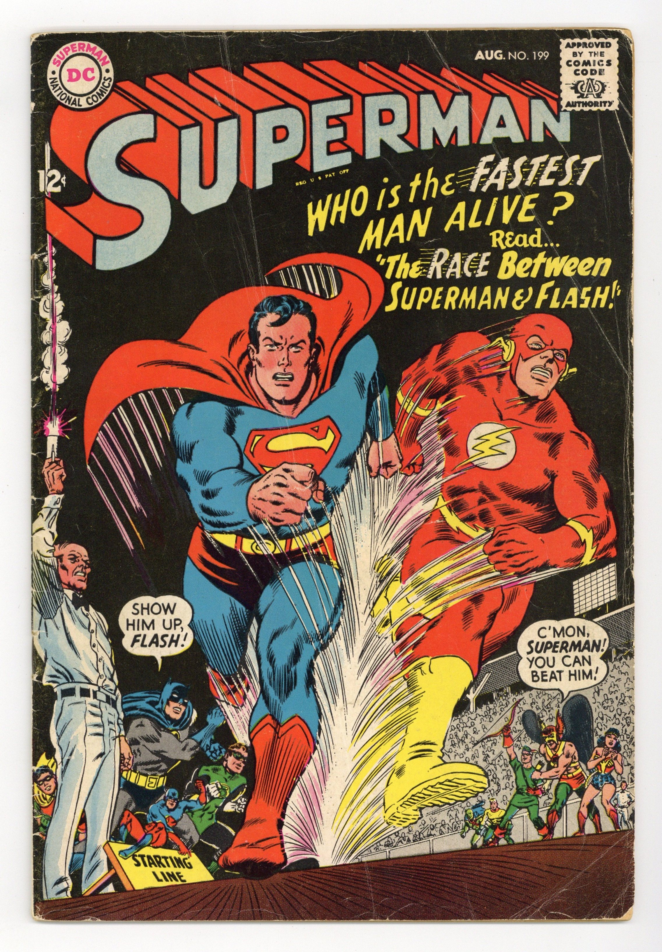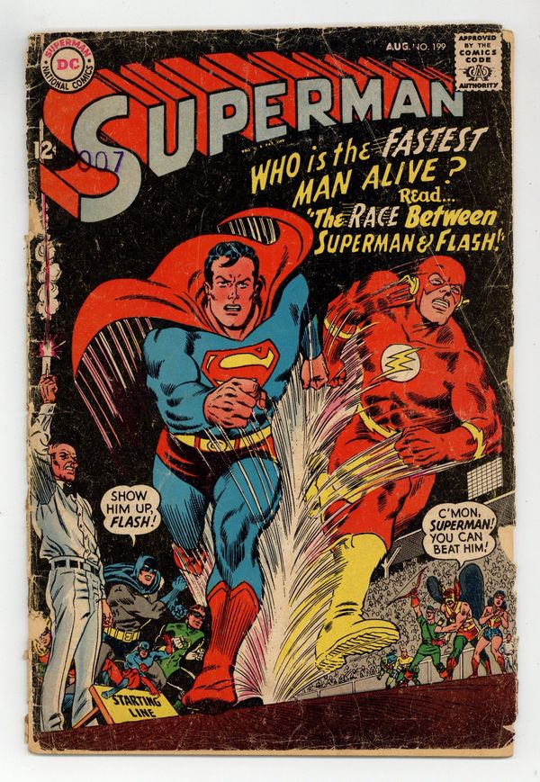 $115.001st Superman vs. Flash race. Cover pencils by Carmine Infantino, inks by Murphy Anderson. Superman's Race With the Flash!, script by Jim Shooter, pencils by Curt Swan, inks by George Klein; a very close race by the two fastest super-heroes; brief Justice League appearance; the first Superman/Flash race. 36 Pages, Full Color. Cover price $0.12.