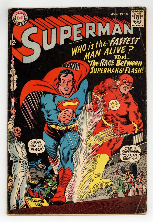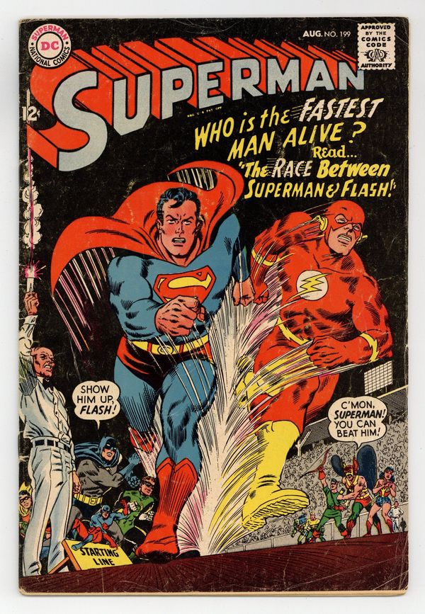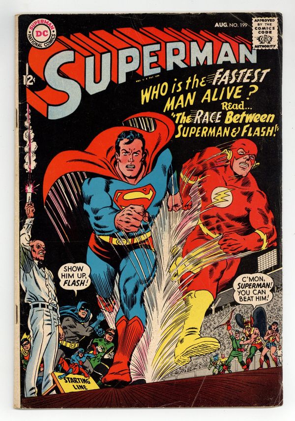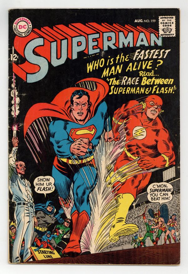 1st Superman vs. Flash race. Cover pencils by Carmine Infantino, inks by Murphy Anderson. Superman's Race With the Flash!, script by Jim Shooter, pencils by Curt Swan, inks by George Klein; a very close race by the two fastest super-heroes; brief Justice League appearance; the first Superman/Flash race. 36 Pages, Full Color. Cover price $0.12.